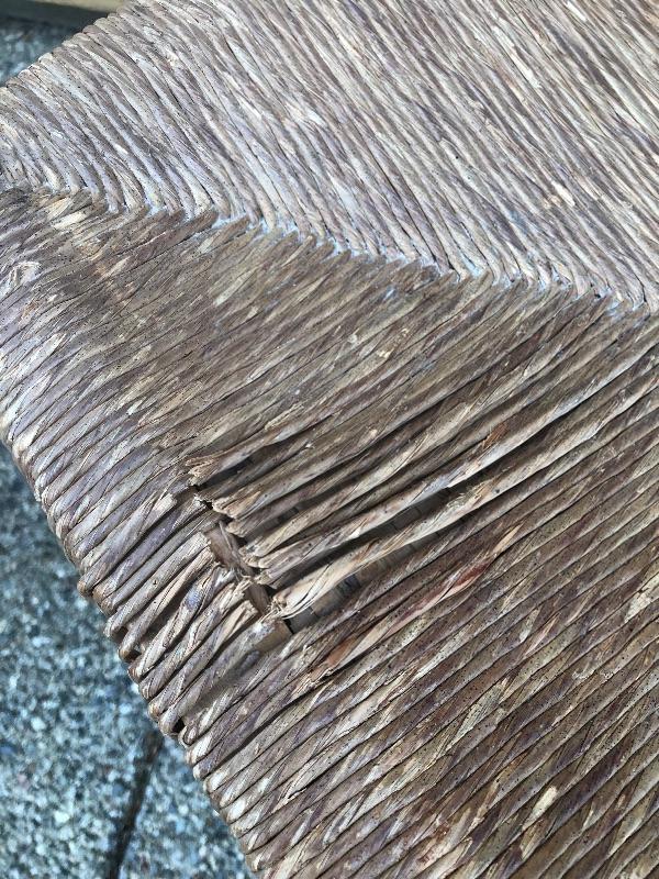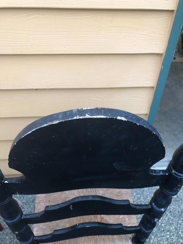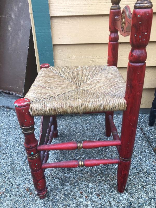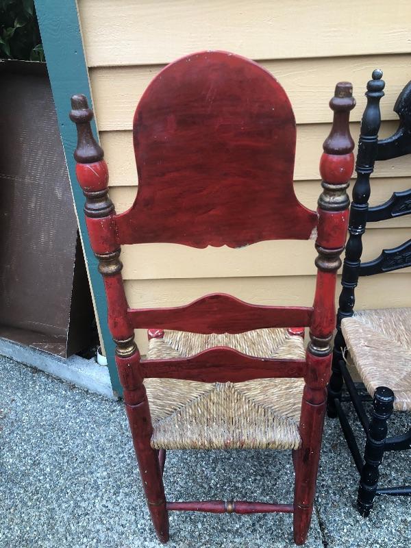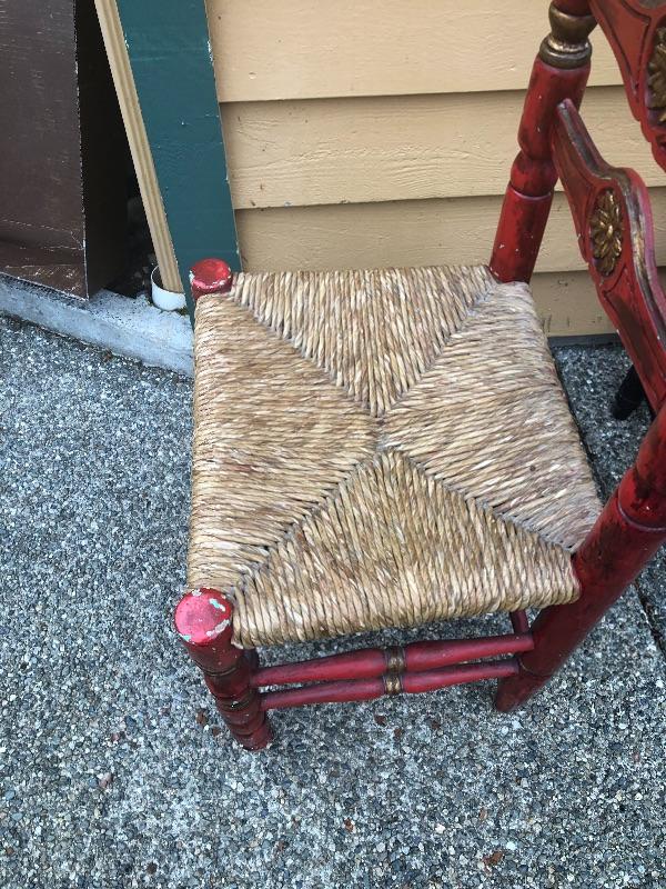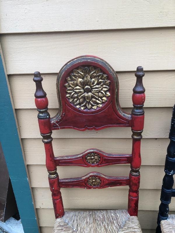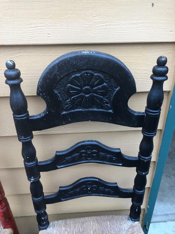 Vintage Wicker bottomed Wood Chairs. These chairs are not sturdy. Black chair has cut in wicker. Great for plant stands, lots of character.