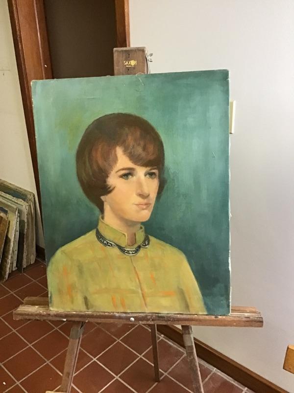 1 ) woman yellow top, green background - on stretched canvas 20” T x 16” W