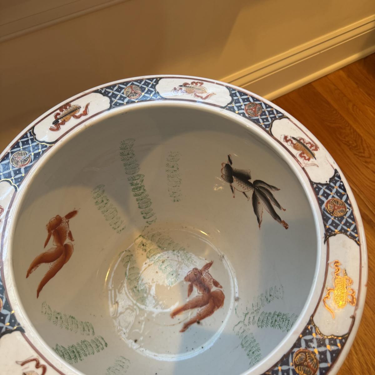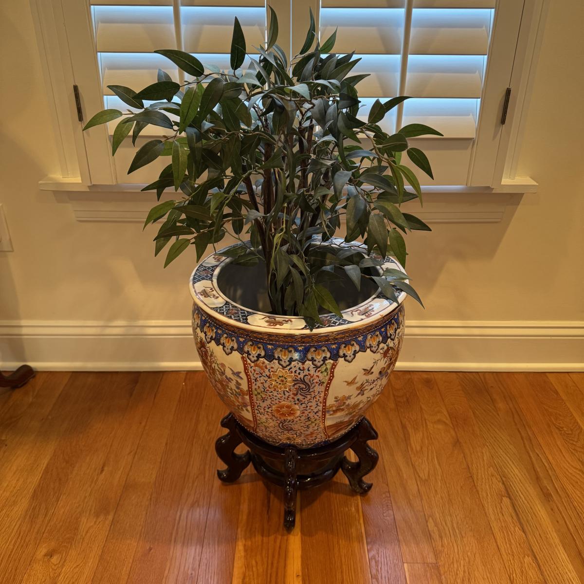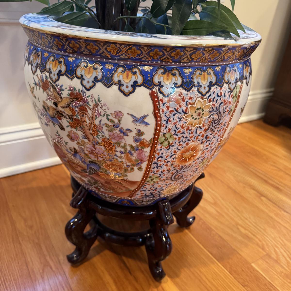 Vintage Chinese Ceramic Fish Bowl Planter. Comes with wooden stand.