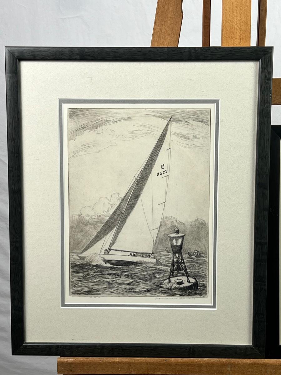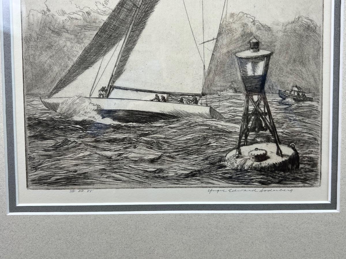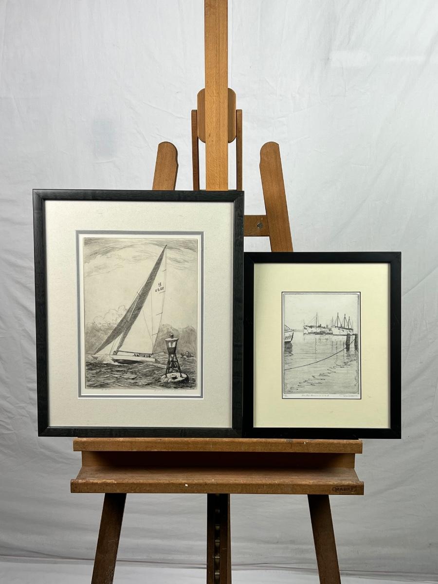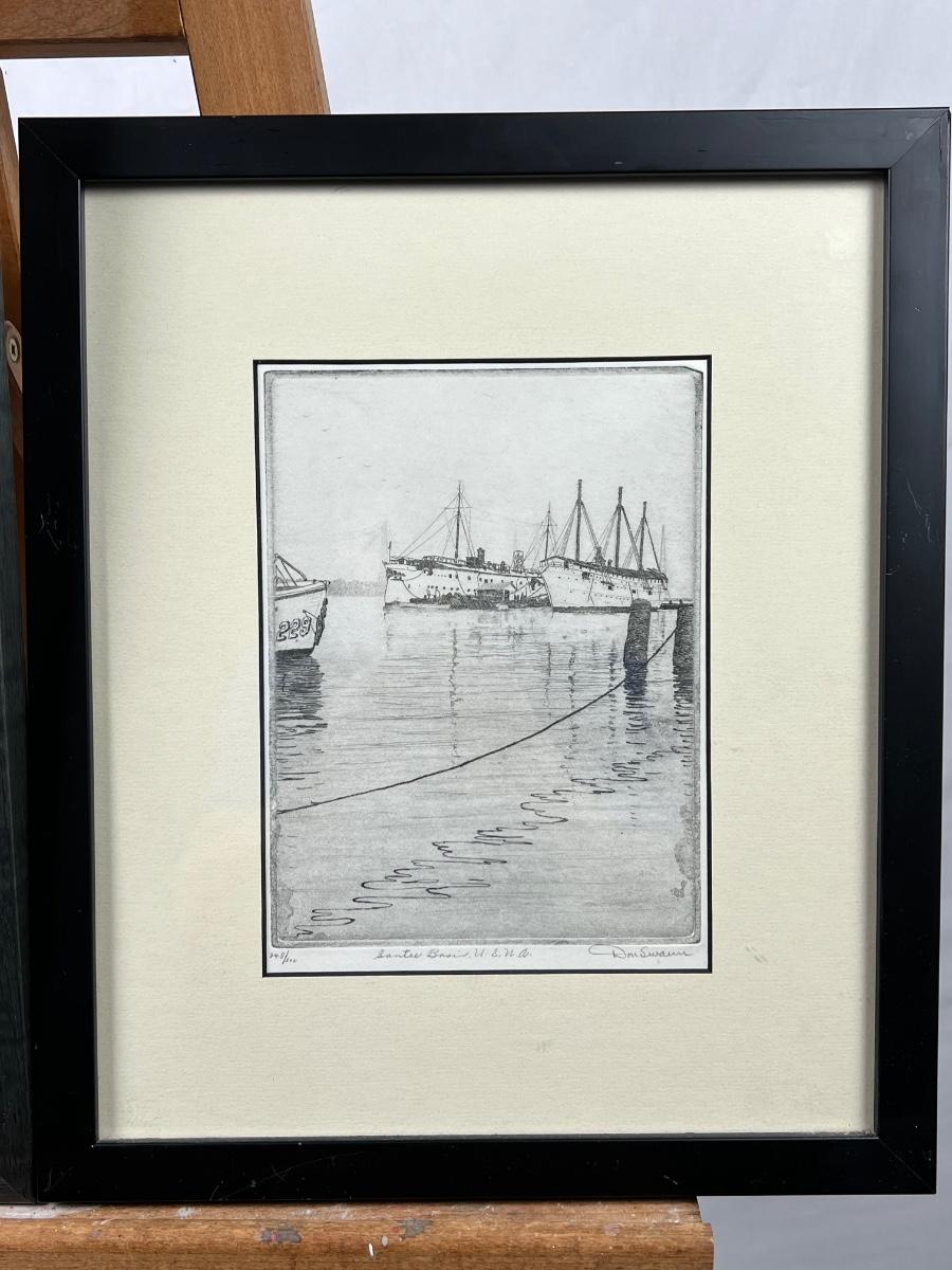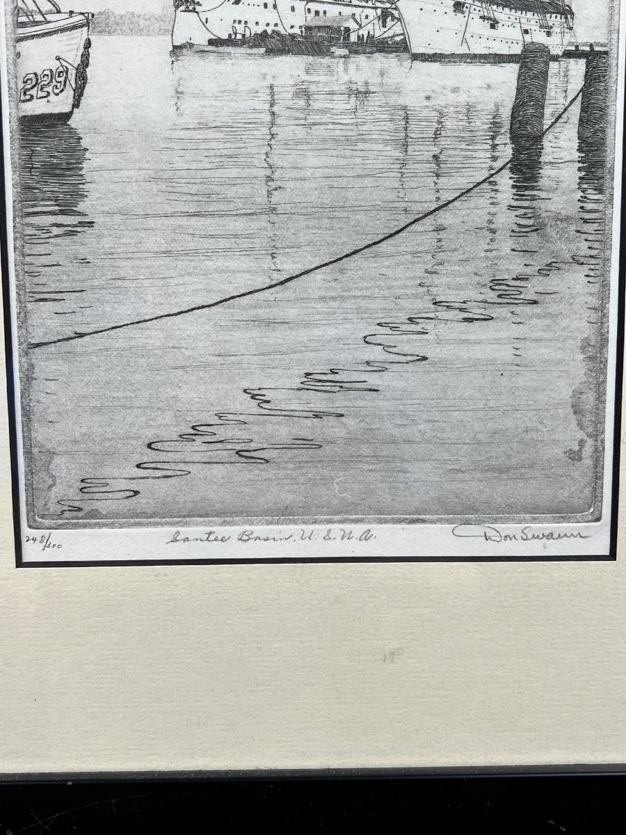 Framed signed, engraving numbered 30/85 of sailboats by Edward Soderberg. Measuring 16" x 19 1/2". Then a framed etching of ships by Don Swann numbered 248/50. Measuring 12 1/4" x 14 1/2"