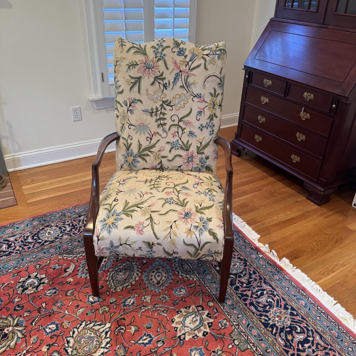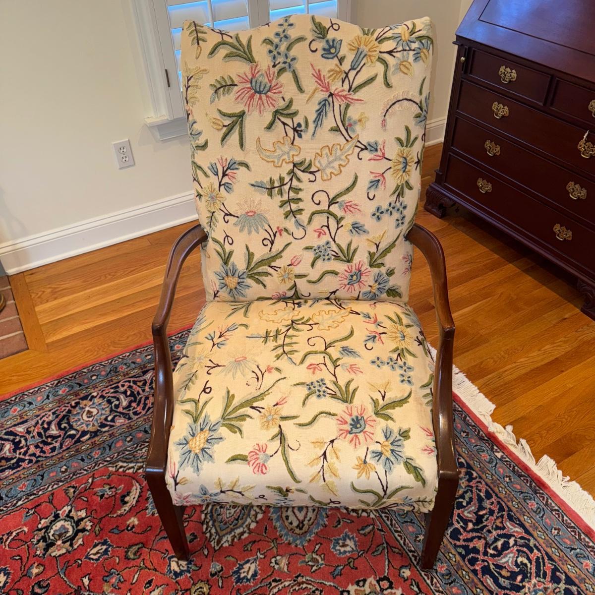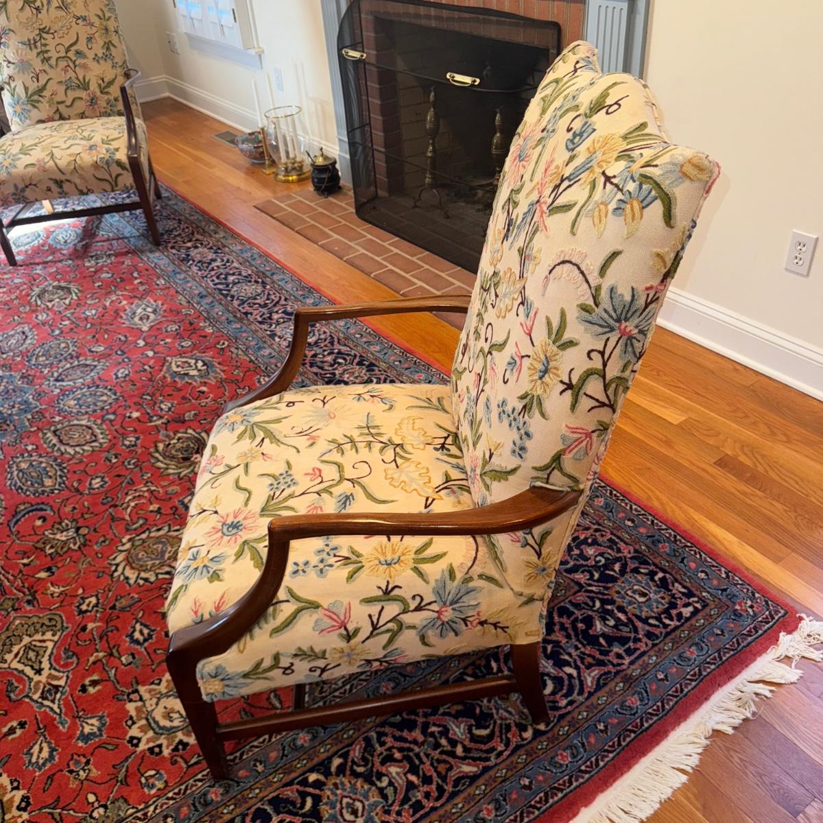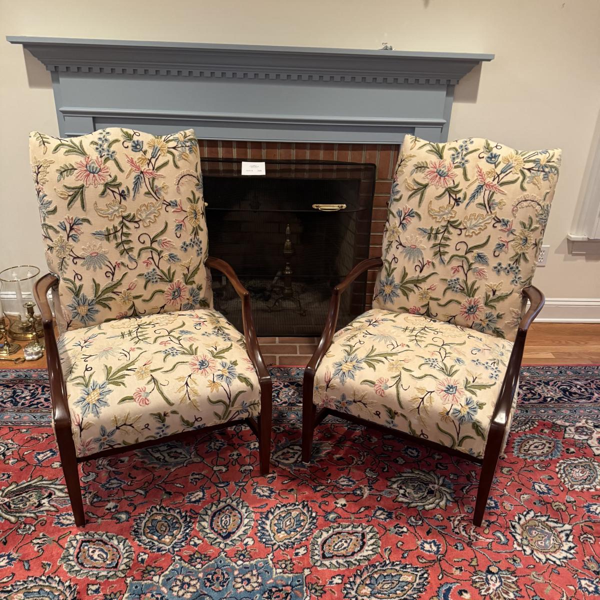 326 Pair of Hickory Federal Style Mahogany Lolling Chairs With Crewel upholstery floral pattern. Overall good condition l.
