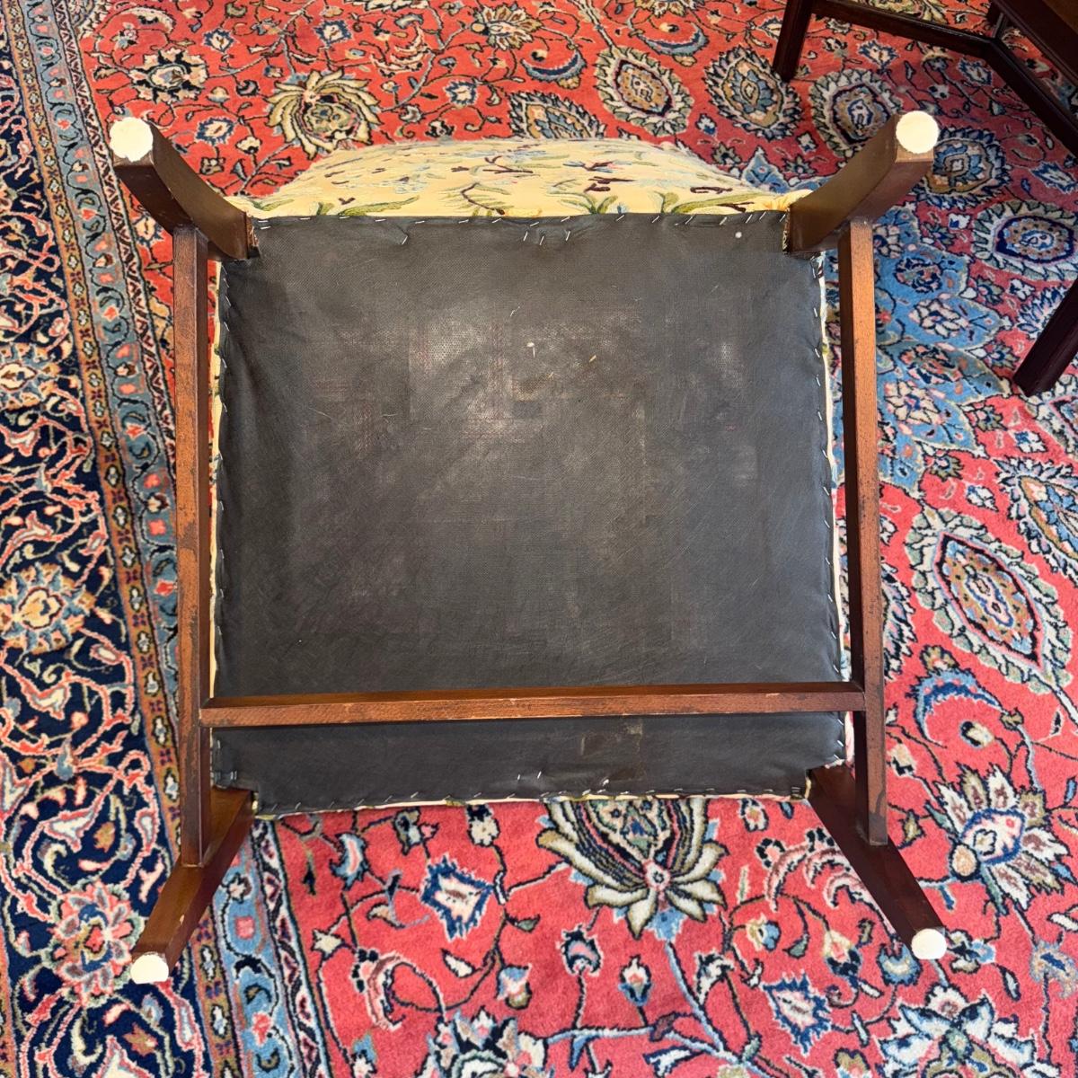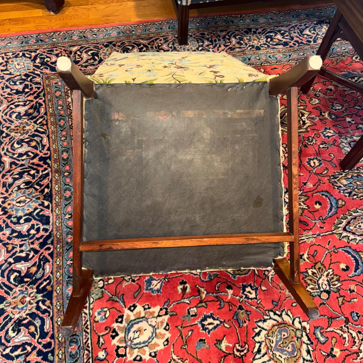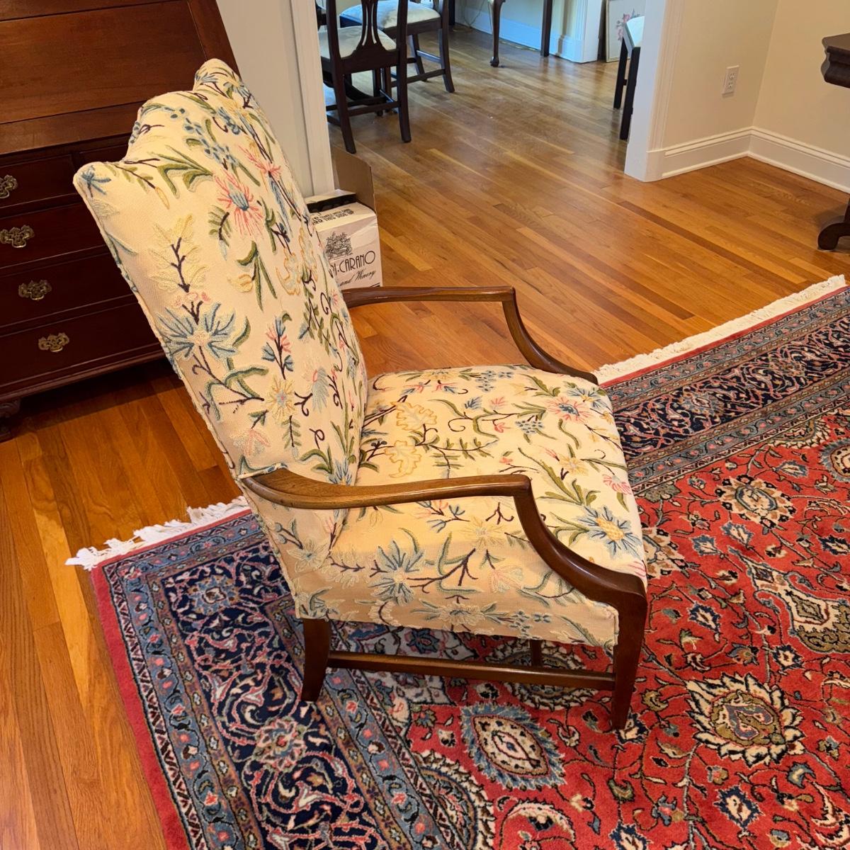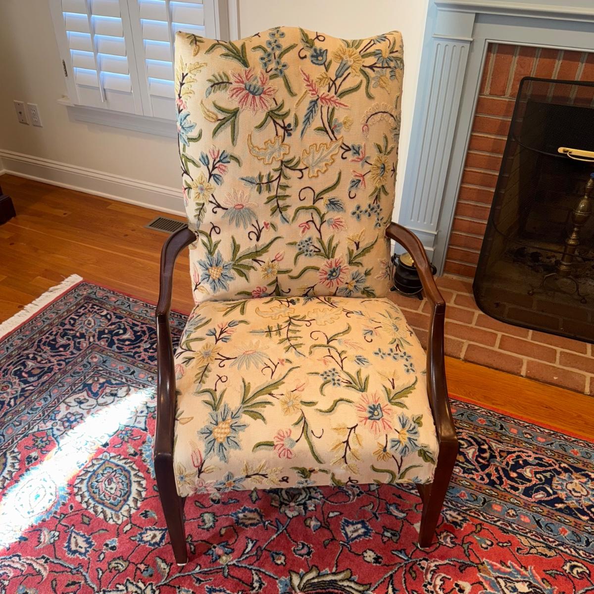 326 Pair of Hickory Federal Style Mahogany Lolling Chairs With Crewel upholstery floral pattern. Overall good condition l.