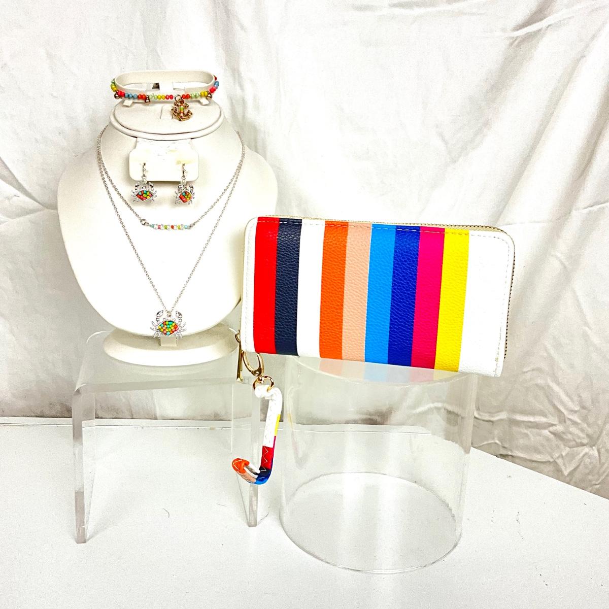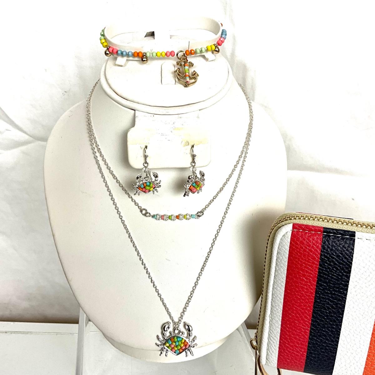 327 Crabs Necklace, Earrings, Bracelet Set and Striped Clutch