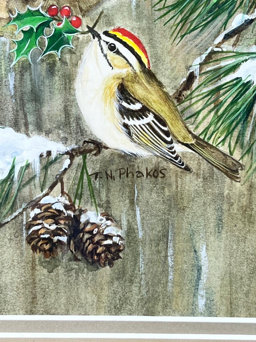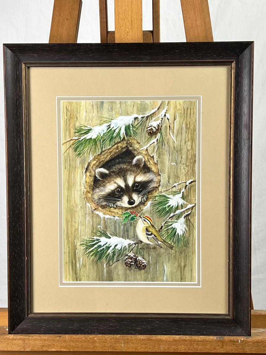Framed original watercolor of raccoons and birds, signed T.N. Phakos. Measures 15 1/4" x 18 1/4".
