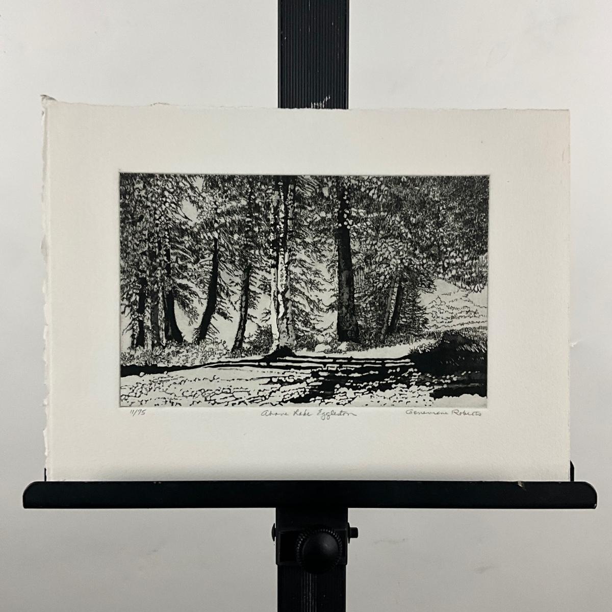 Genevieve Roberts (active late 20th century), woodland landscape. Original black-and-white etching, signed and numbered 11/75. Hand-pulled print depicting a wooded scene with strong contrast and expressive line work.