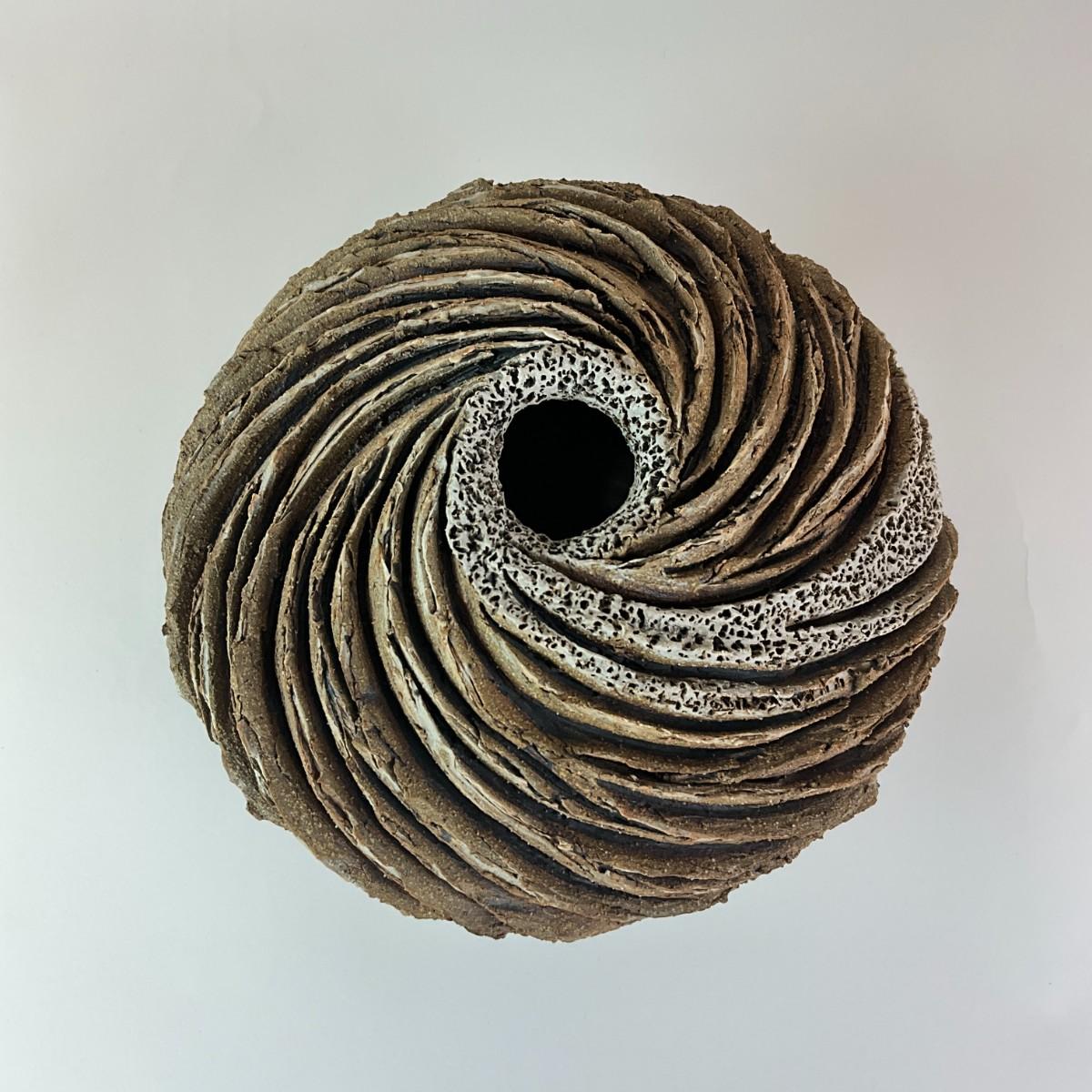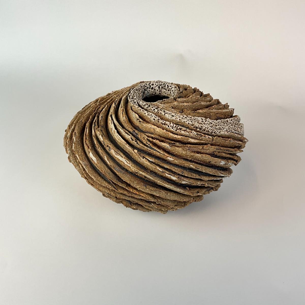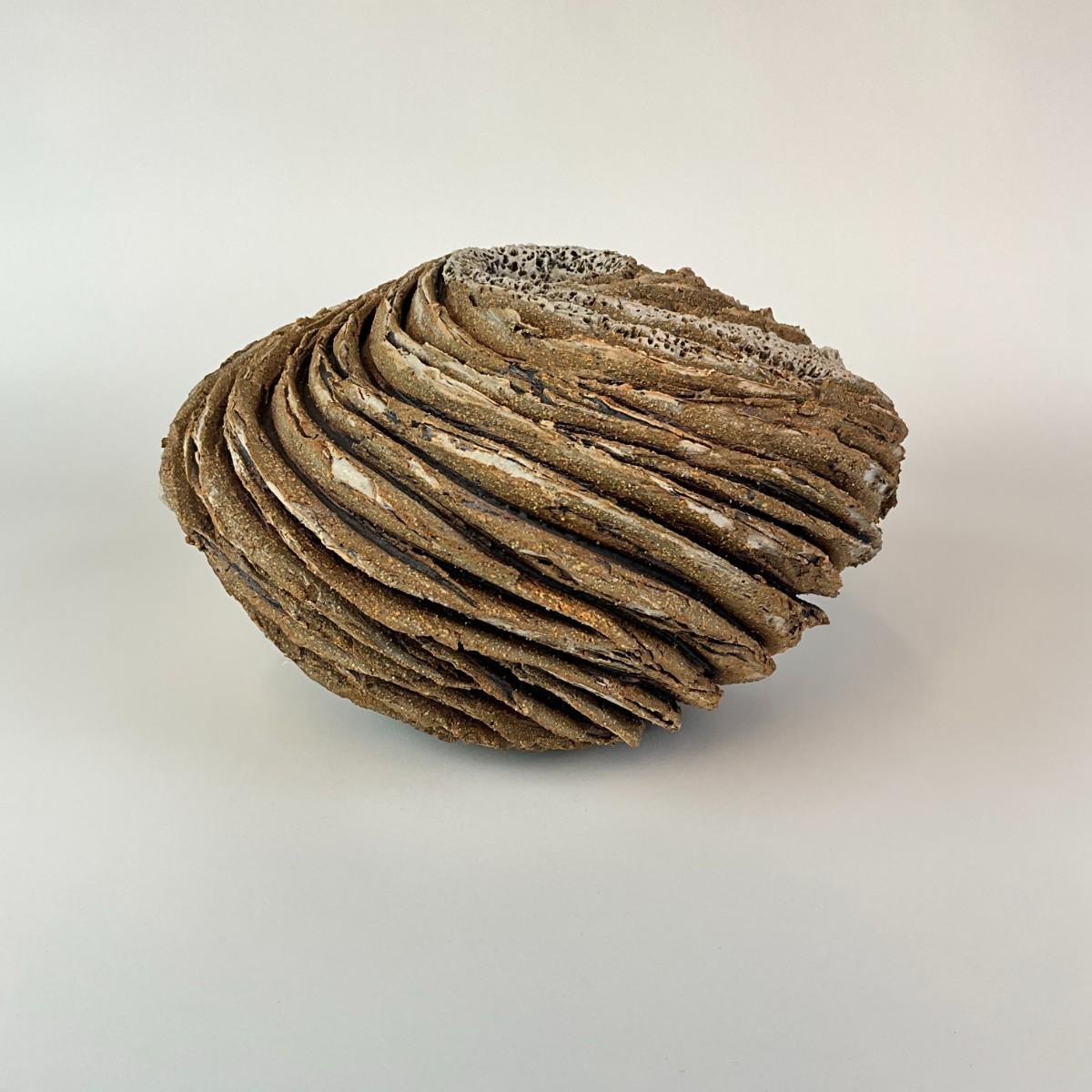 Basket sculpture of paper, reeds, dried hemp, and rhododendro and ceramic