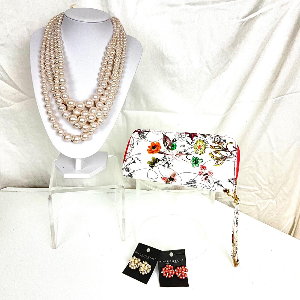 328 Pearl Necklace, Earrings, and Floral Clutch
