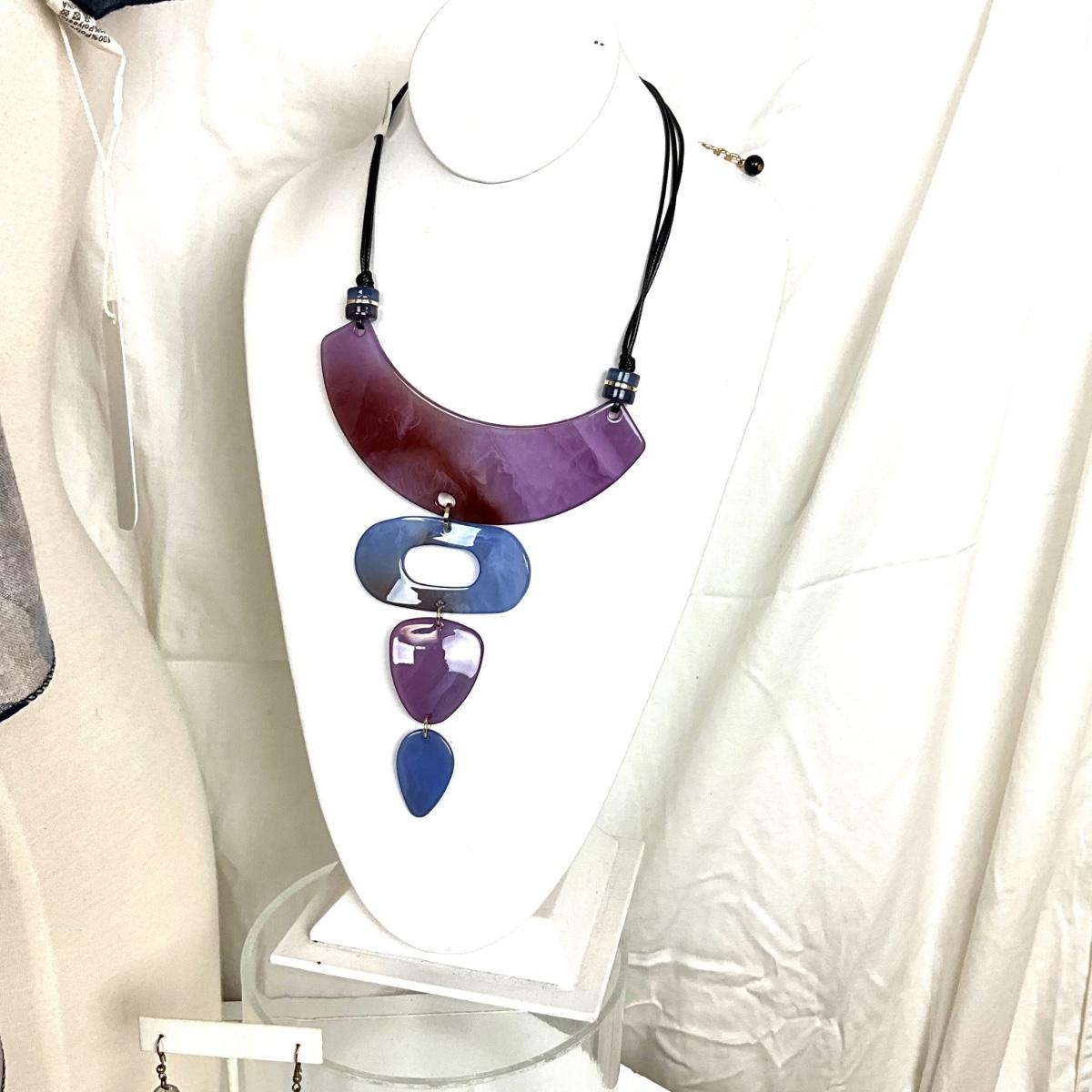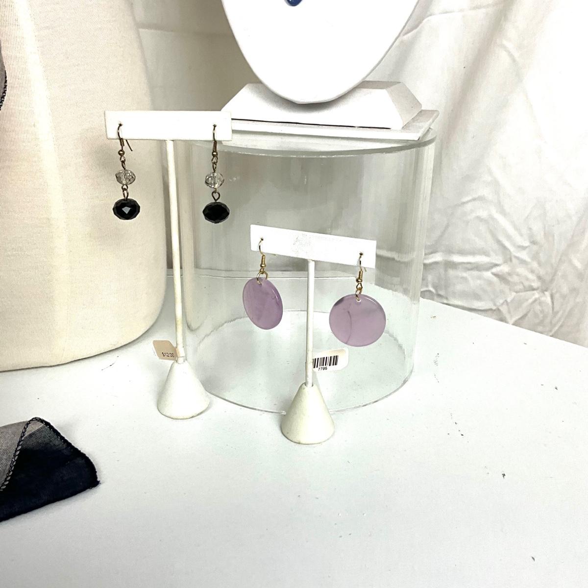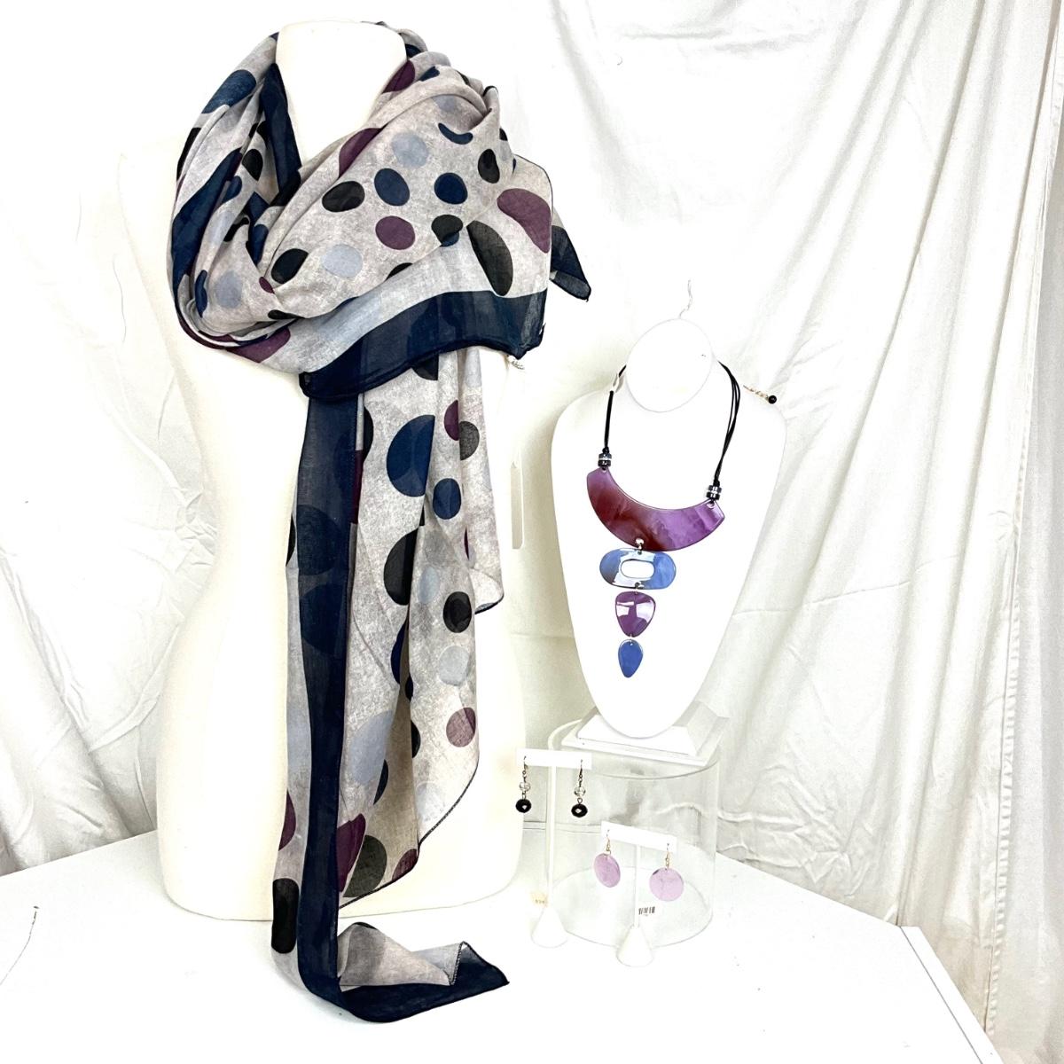 329 Purple and Black Polka Dot Shawl, Purple Necklace, Two Pairs of Earrings,