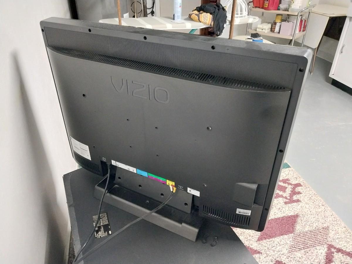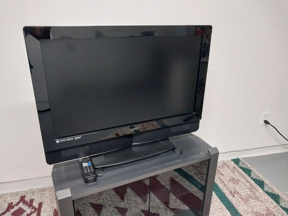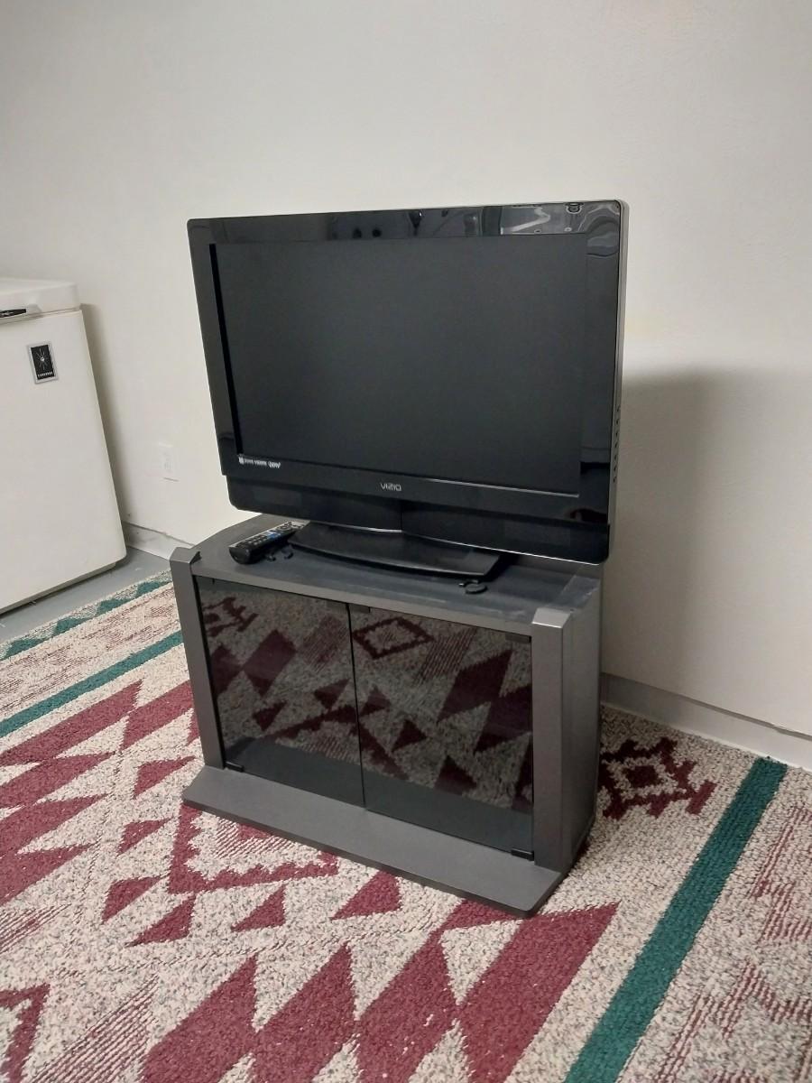 32"XIZIO WITH REMOTE AND GLASS FRONT STAND WITH STORAGE