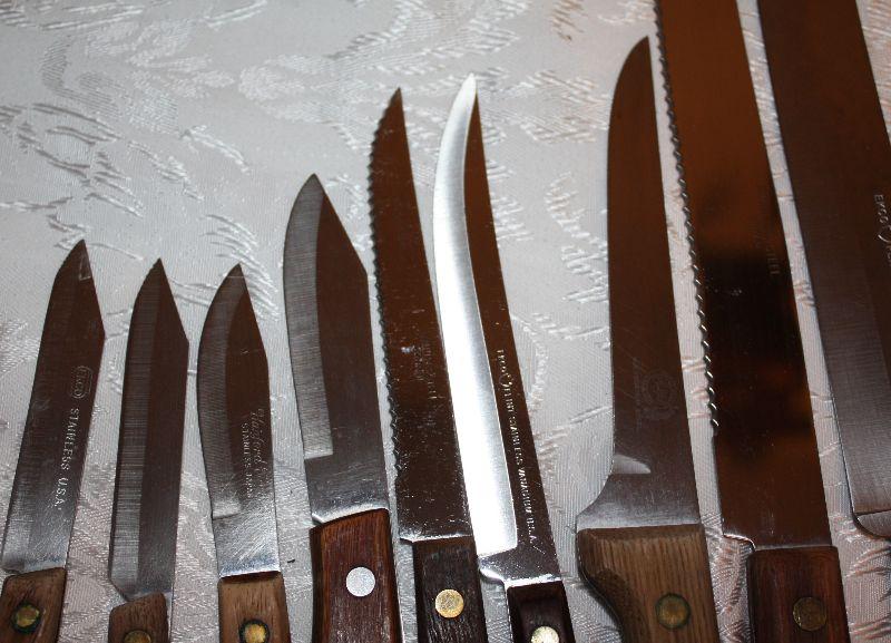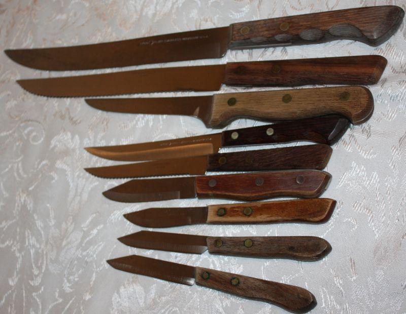 Nine knives 9" blade, 8" serrated blade, (2) 5" blade, 4.5" serrated blade, (4) 3" blades