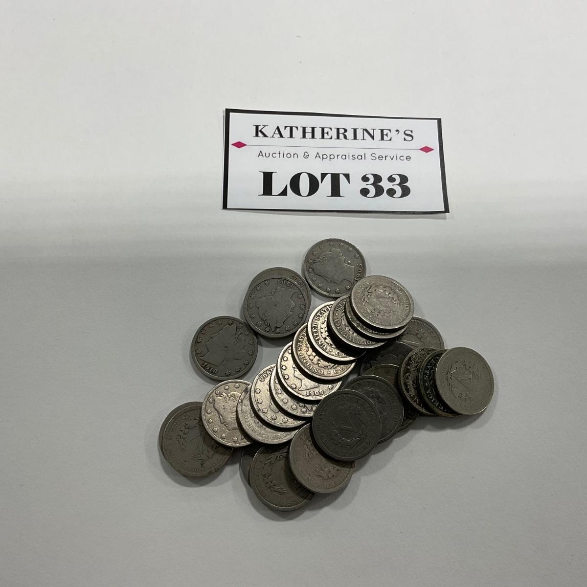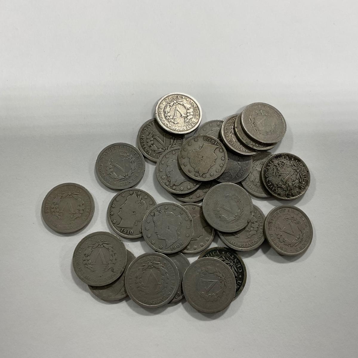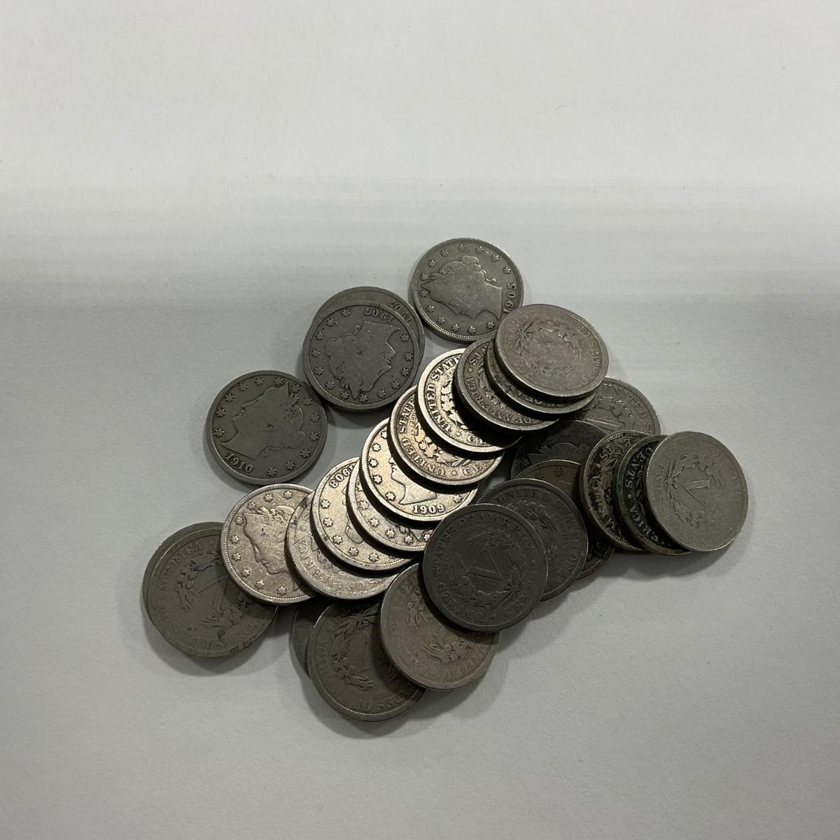 Lot of 27 Liberty “V” Nickels 1900’s with duplication. Average circulation a few better pieces. Please see photos for details and condition. ::: Shipping is available on this lot. If you require shipping you must let us know at the close of the auction. We will coordinate with you after the item has been won. Shipping fees will include insurance up to or exceeding the value of all items being mailed. If you have any questions regarding this lot please contact the auctioneer either via this website, by direct email or by phone. PICK UP TIMES and other important information can be found in the TERMS and DESCRIPTION of the auction. Please take a look for pertinent information. Thanks!