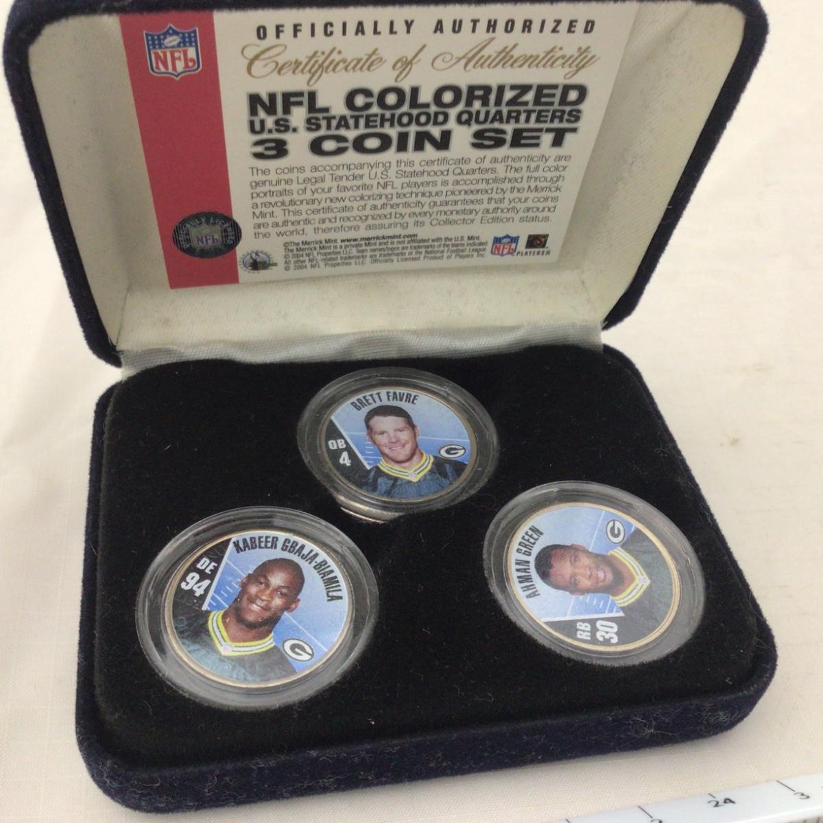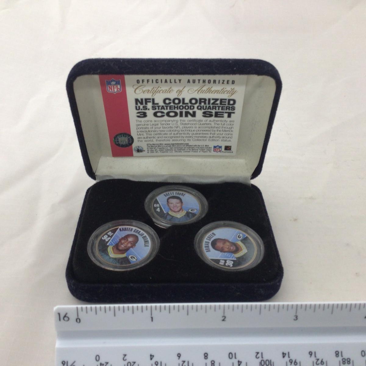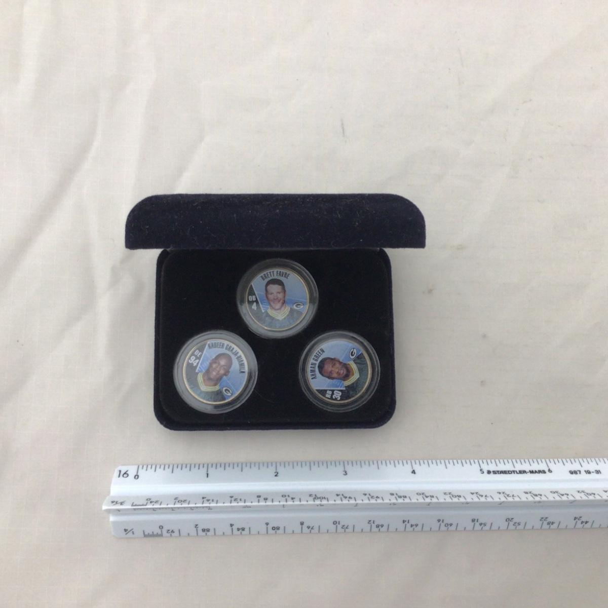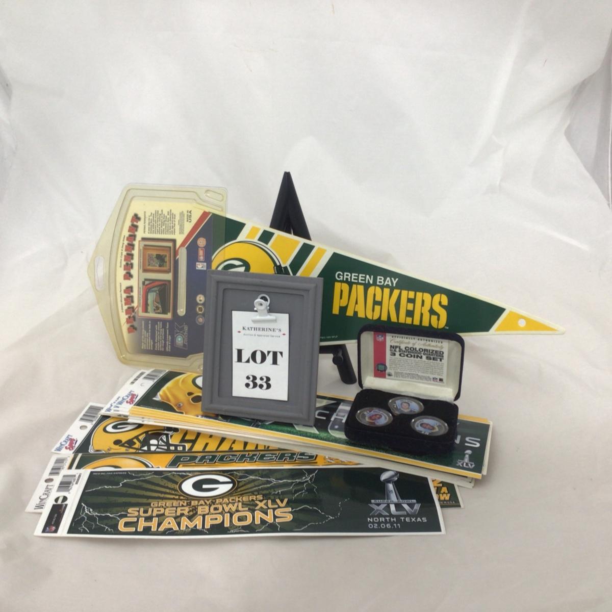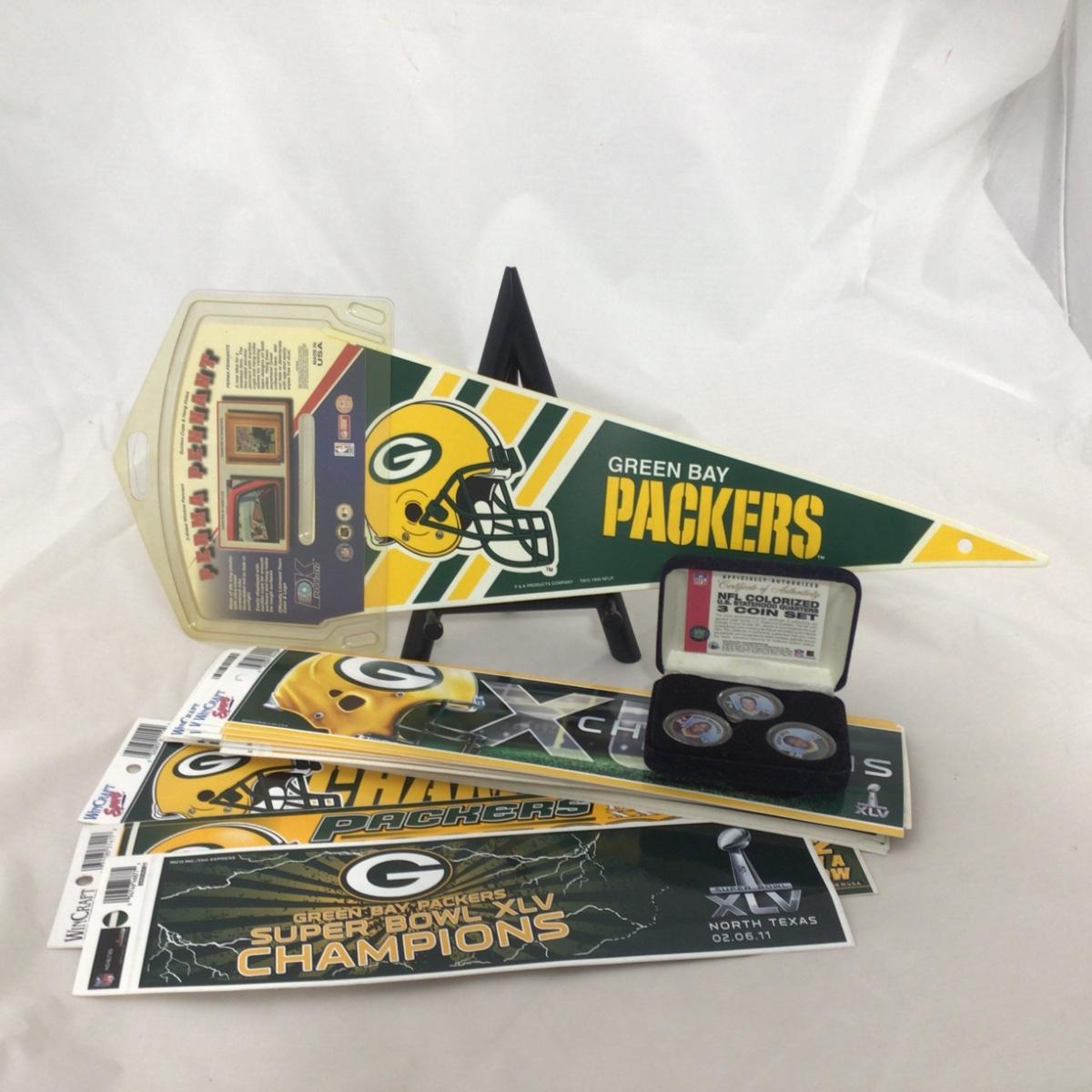 35 Packers bumper stickers, Packers perma pendant, NFL colorized 3 coin set. Please see photos for details and condition. ::: Shipping is available on this lot. If you require shipping you must let us know at the close of the auction. We will coordinate with you after the item has been won. Shipping fees will include insurance up to or exceeding the value of all items being mailed. If you have any questions regarding this lot please contact the auctioneer either via this website, by direct email or by phone. PICK UP TIMES and other important information can be found in the TERMS and DESCRIPTION of the auction. Please take a look for pertinent information. Thanks!