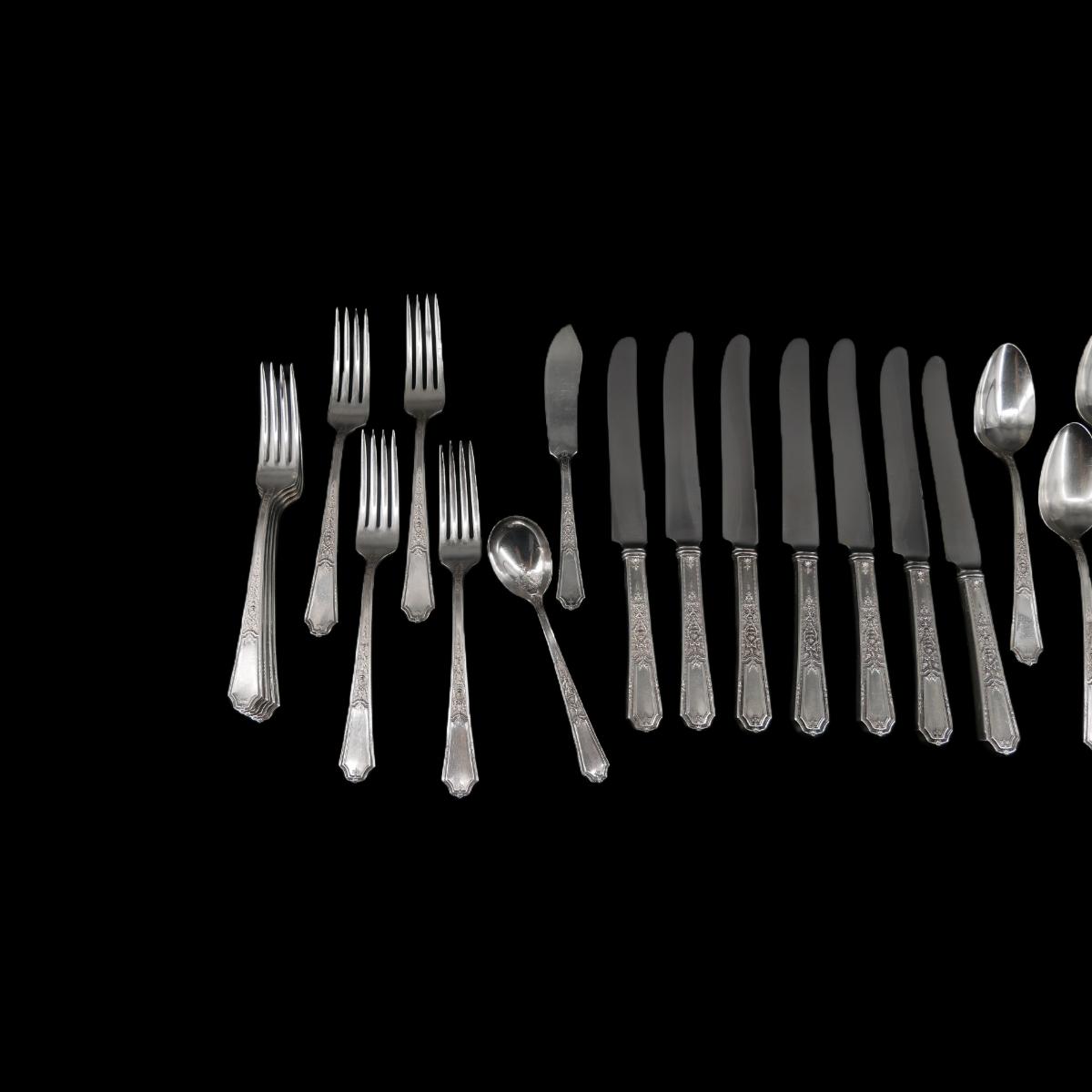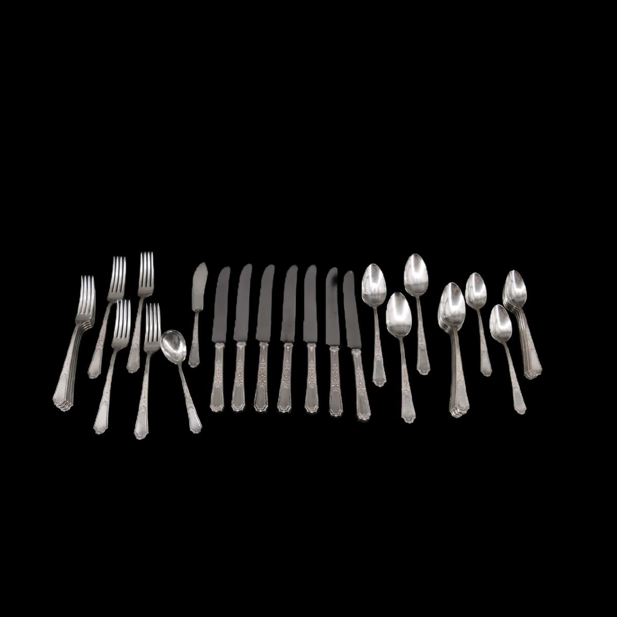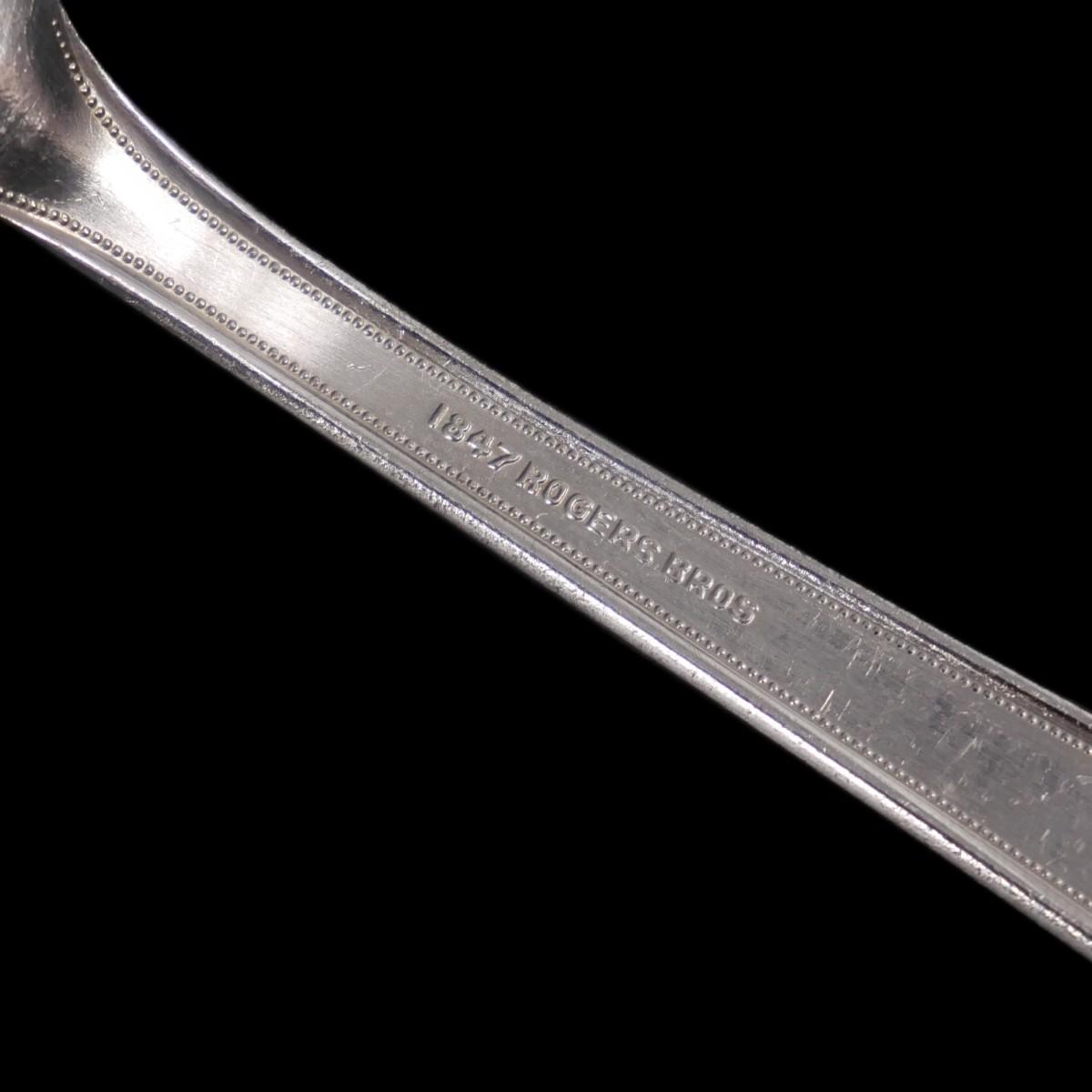Antique 1847 Rogers Bros. silverware (33 pieces total). Eight dinner forks, each measuring 7.5" long. Seven knives, each measuring 9" long. Eight spoons, each measuring 7" long. Eight smaller dessert spoons, each measuring 6". One rounded sugar spoon, measring 6" long and one butter knife, measuring 6.5" long. All are marked "1847 Rogers Bros." on back. All in excellent condition. Some tarnish may be present but can be easily polished. Lot weighs 3 lb 9 oz.(G45)