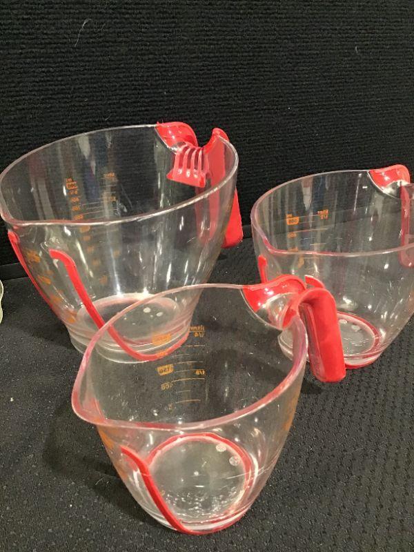 measuring cups are plastic. Pie plate is glass.