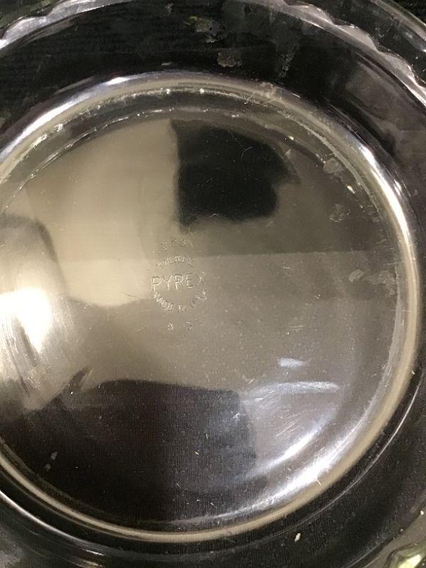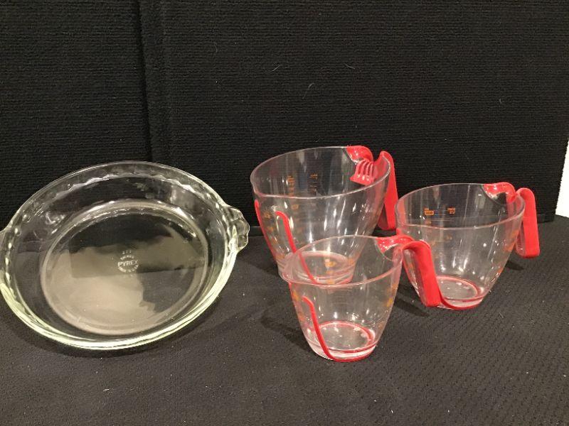 #34 - Pyrex pie plate & 4, 2 & 1 cup measuring cups
