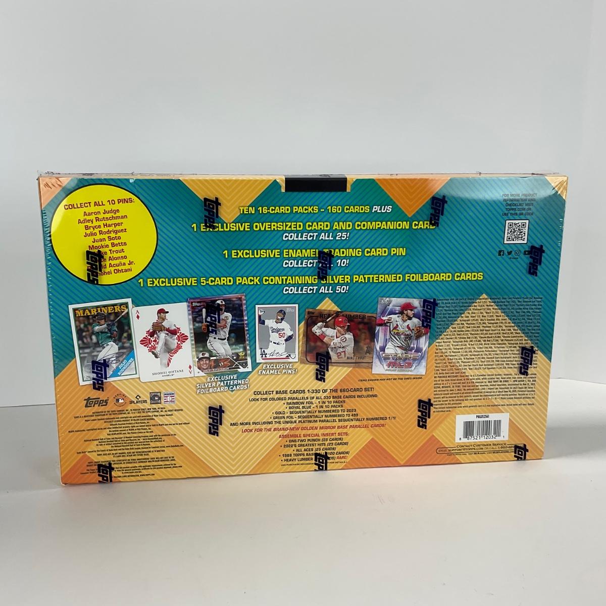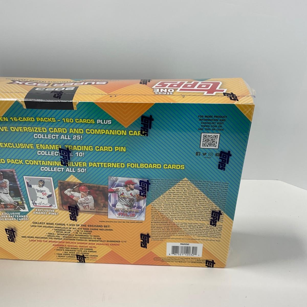 One factory sealed 2023 Topps Baseball cards super box set. In great condition. 9 inches by 15 inches. Please see photos for details and condition. ::: Shipping is available on this lot. If you require shipping you must let us know at the close of the auction. We will coordinate with you after the item has been won. Shipping fees will include insurance up to or exceeding the value of all items being mailed. If you have any questions regarding this lot please contact the auctioneer either via this website, by direct email or by phone. PICK UP TIMES and other important information can be found in the TERMS and DESCRIPTION of the auction. Please take a look for pertinent information. Thanks!