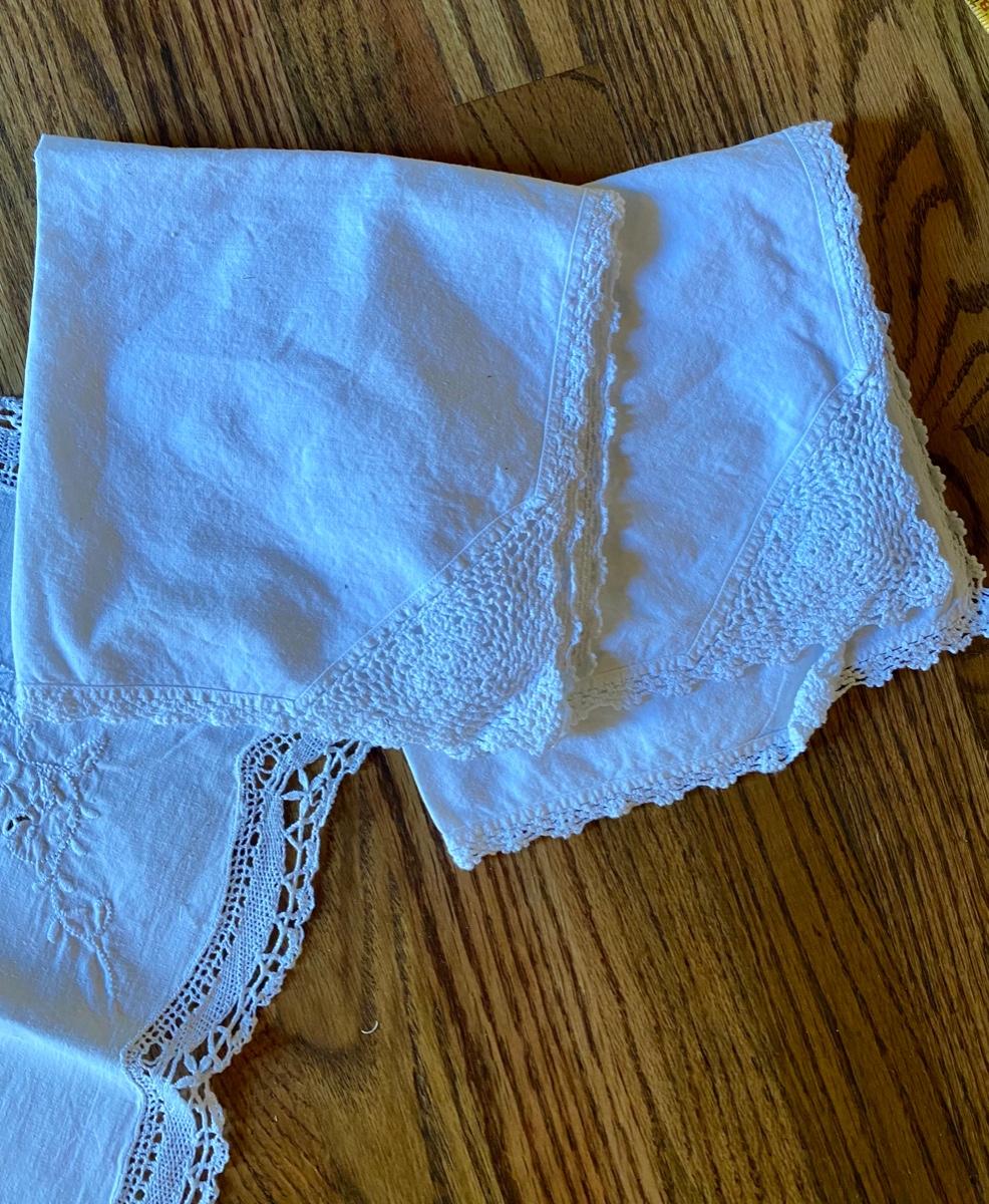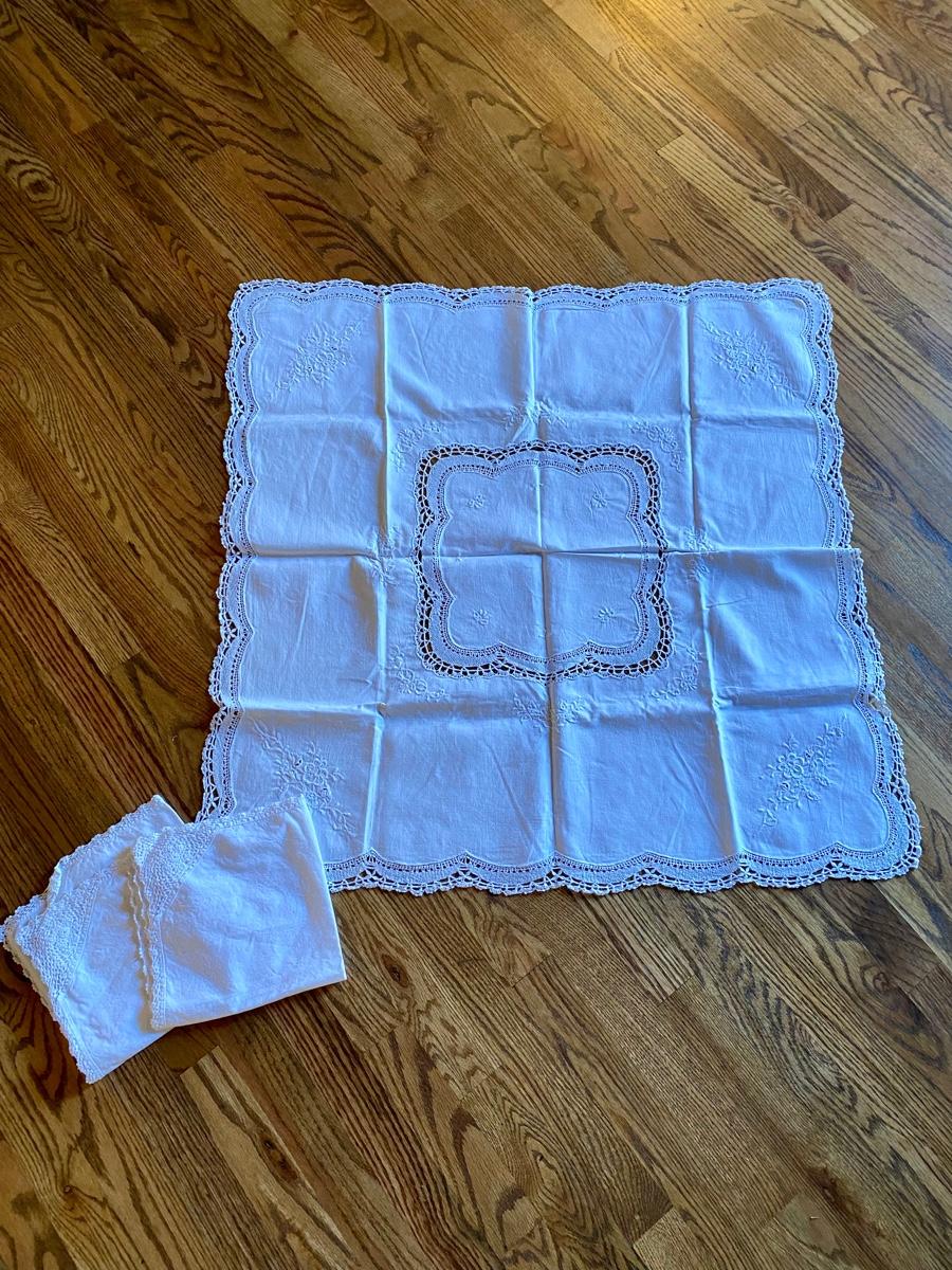 33" Square White Lace Tablecloth and 2 Cloth Napkins
