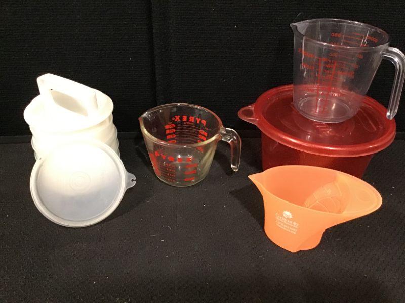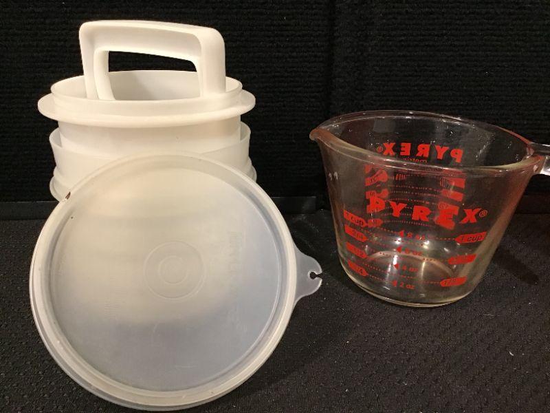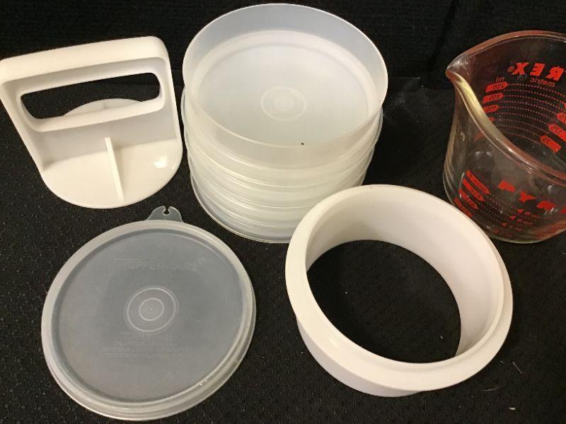 Ziploc Bowl; one glass measuring cup and hamburger patty set from Tupperware