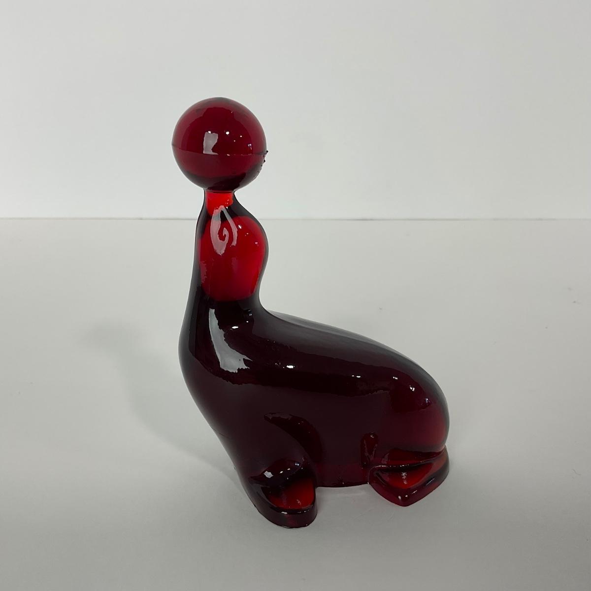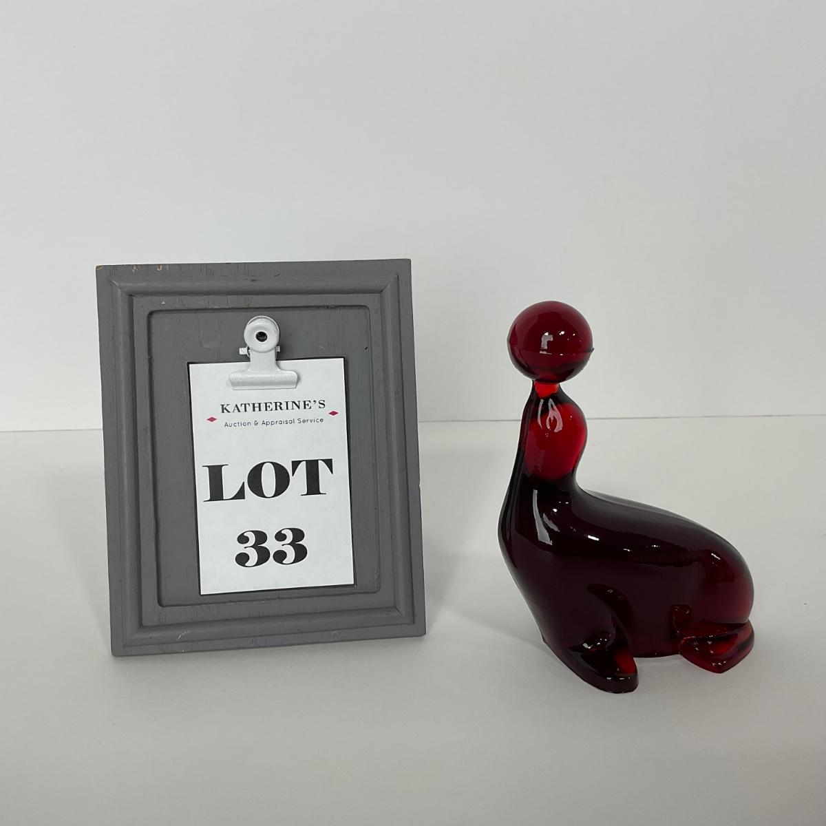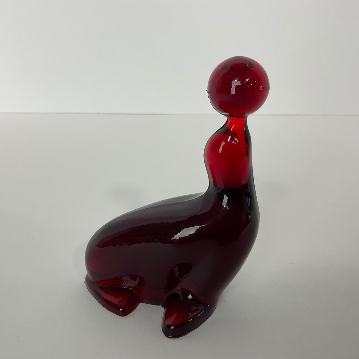 One New martinsville Viking ruby red seal figure. 3 1/2 inches wide by 4 inches tall. This piece has no damage, and appears to be in great shape with no visable chips, cracks, or broken pieces. Please see photos for details and condition. Any condition statement is given as a courtesy to a client, is an opinion, and should not be treated as a statement of fact. Reference to condition written, oral or within a condition report shall not be regarded as a full account of condition and may not include all defects, alterations, or restorations. Absence of a condition report does not imply a lot is flawless or lacking imperfections or damage. Katherine’s Auction & Appraisal Service shall have no responsibility for any error or omission. Returns shall not be accepted on the basis of condition. ::: Shipping is available on this lot. If you require shipping you must let us know at the close of the auction. We will coordinate with you after the item has been won. Shipping fees will include insurance up to or exceeding the value of all items being mailed. If you have any questions regarding this lot please contact the auctioneer either via this website, by direct email or by phone. PICK UP TIMES and other important information can be found in the TERMS and DESCRIPTION of the auction. Please take a look for pertinent information. Thanks!