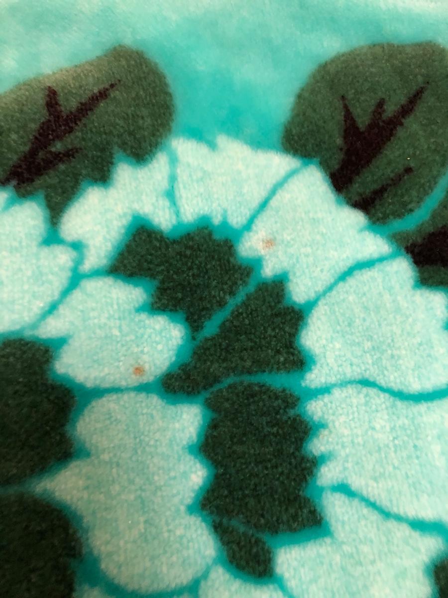 Tag says King Size but it is more of a queen. Two spots as noted in pics