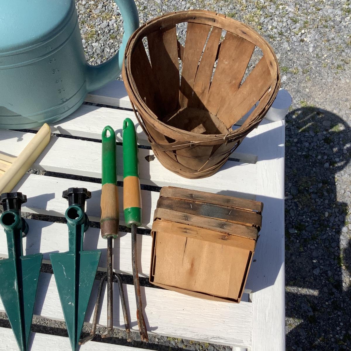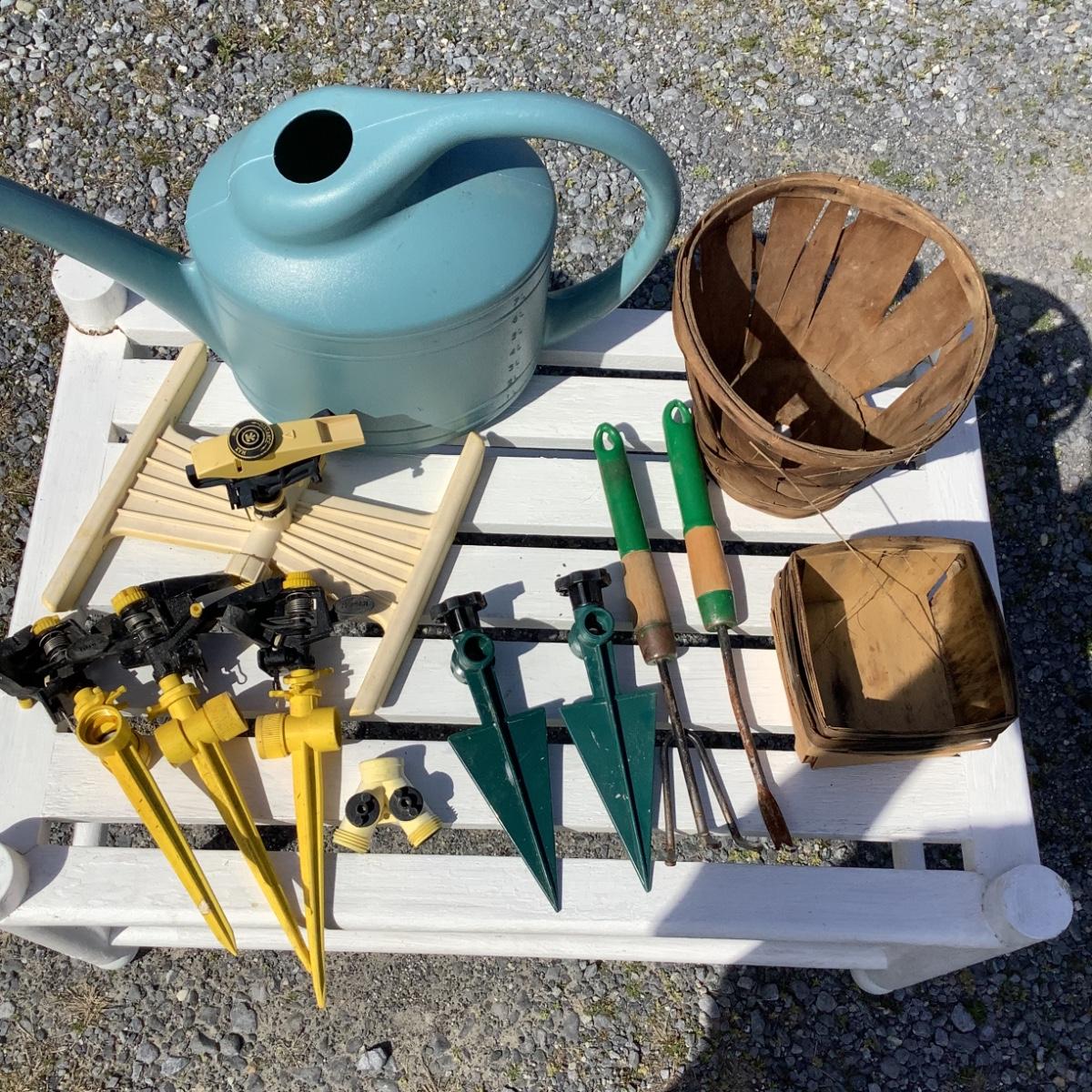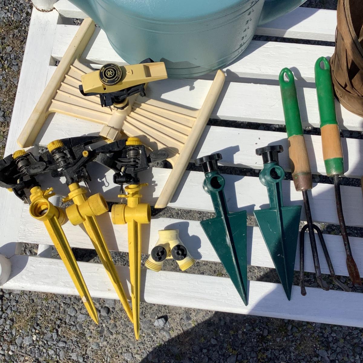 Garden Lot Includes Sprinklers, Watering Can, Garden Tools, & Small Wood Planters