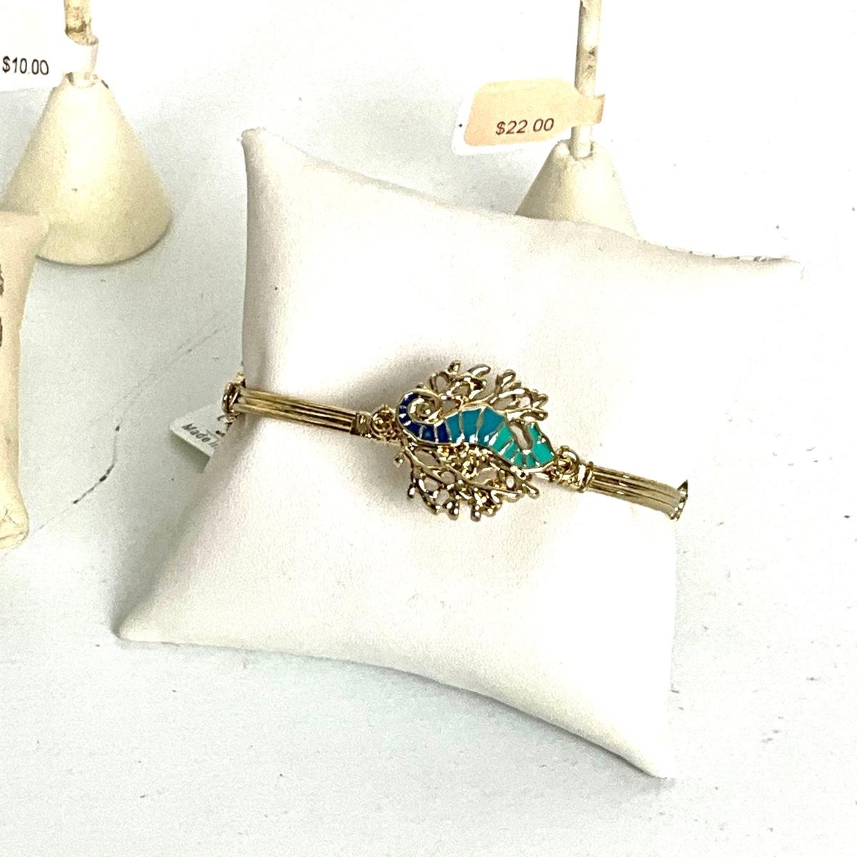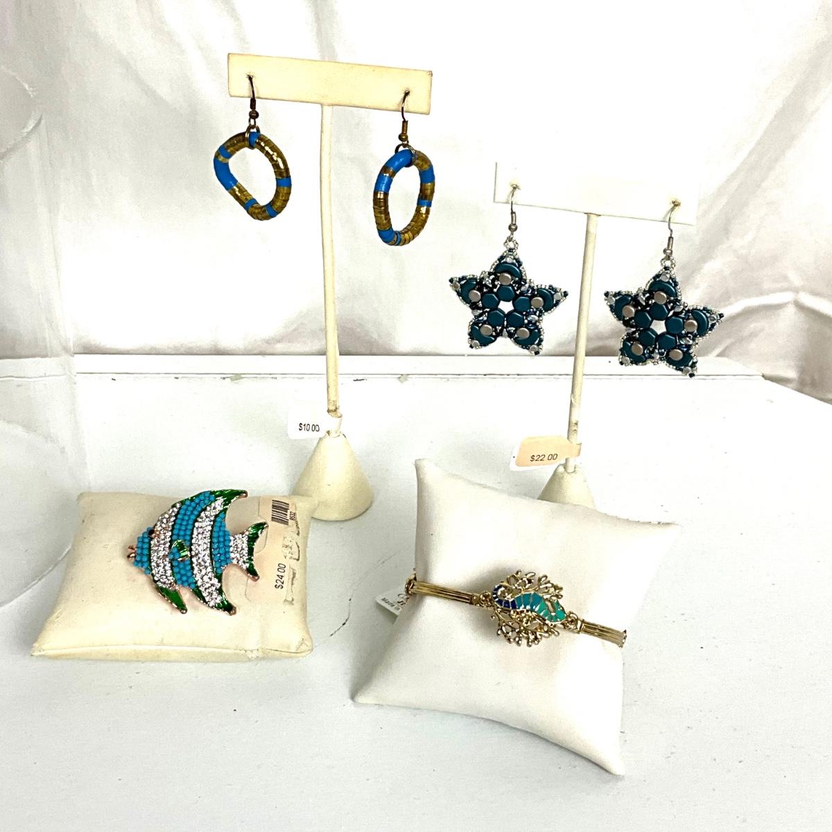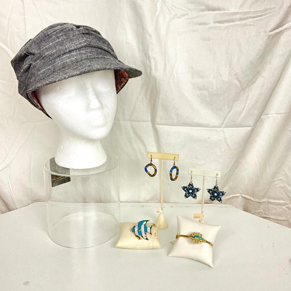 331 Black and White Cap with Starfish Earrings, Rhinestone Fish Brooch, Enamel Bracelet