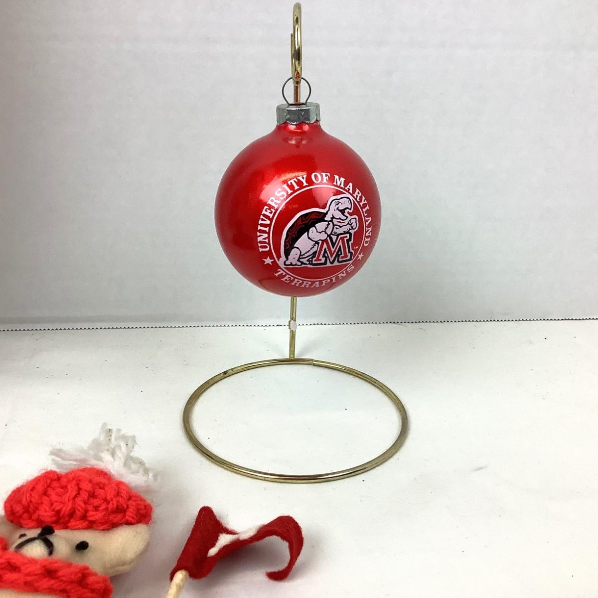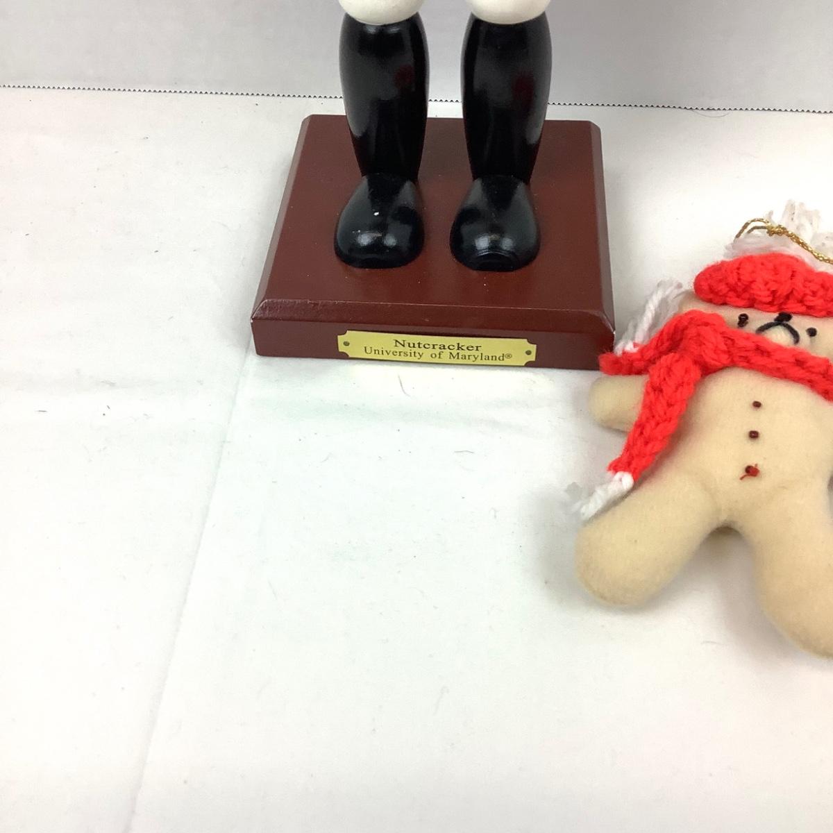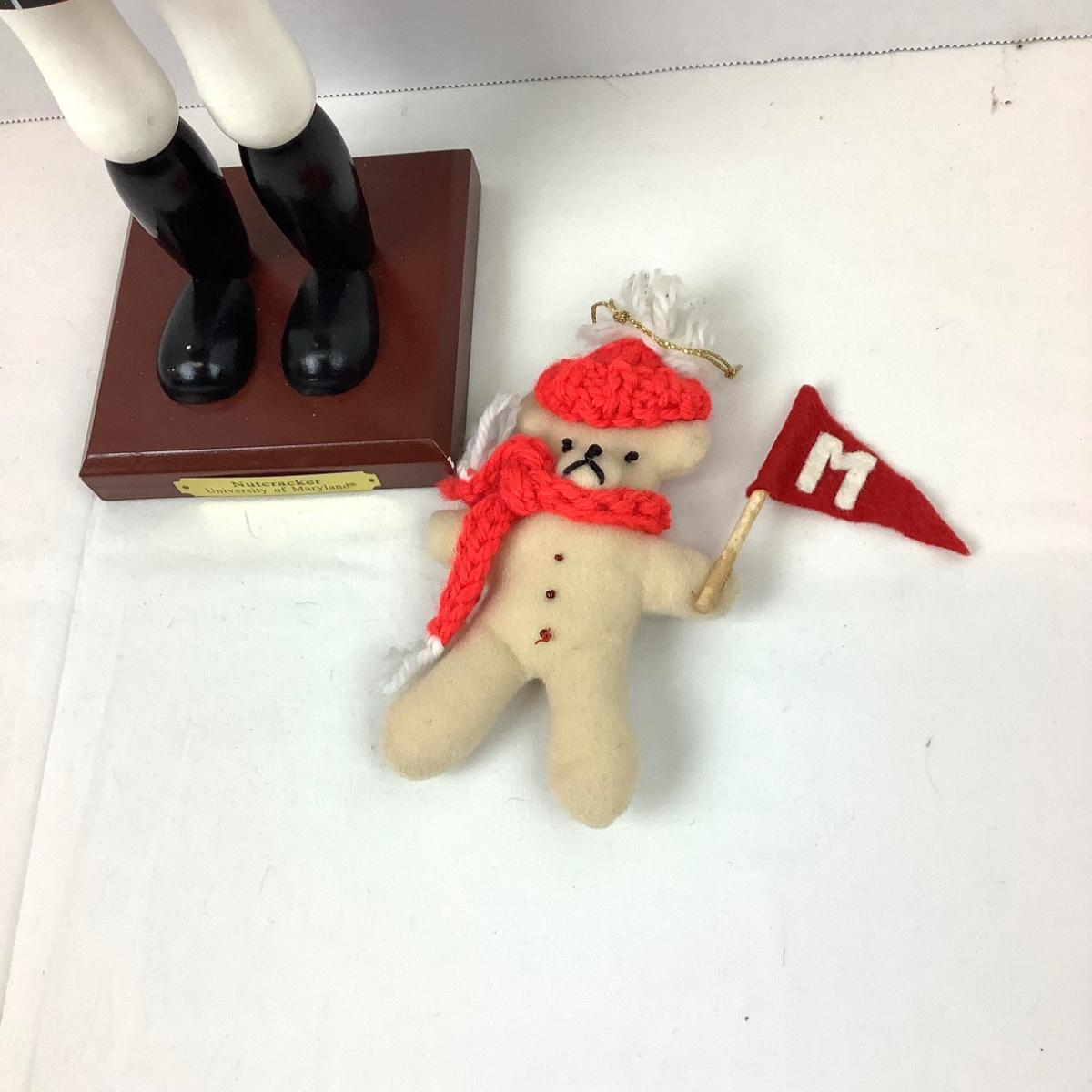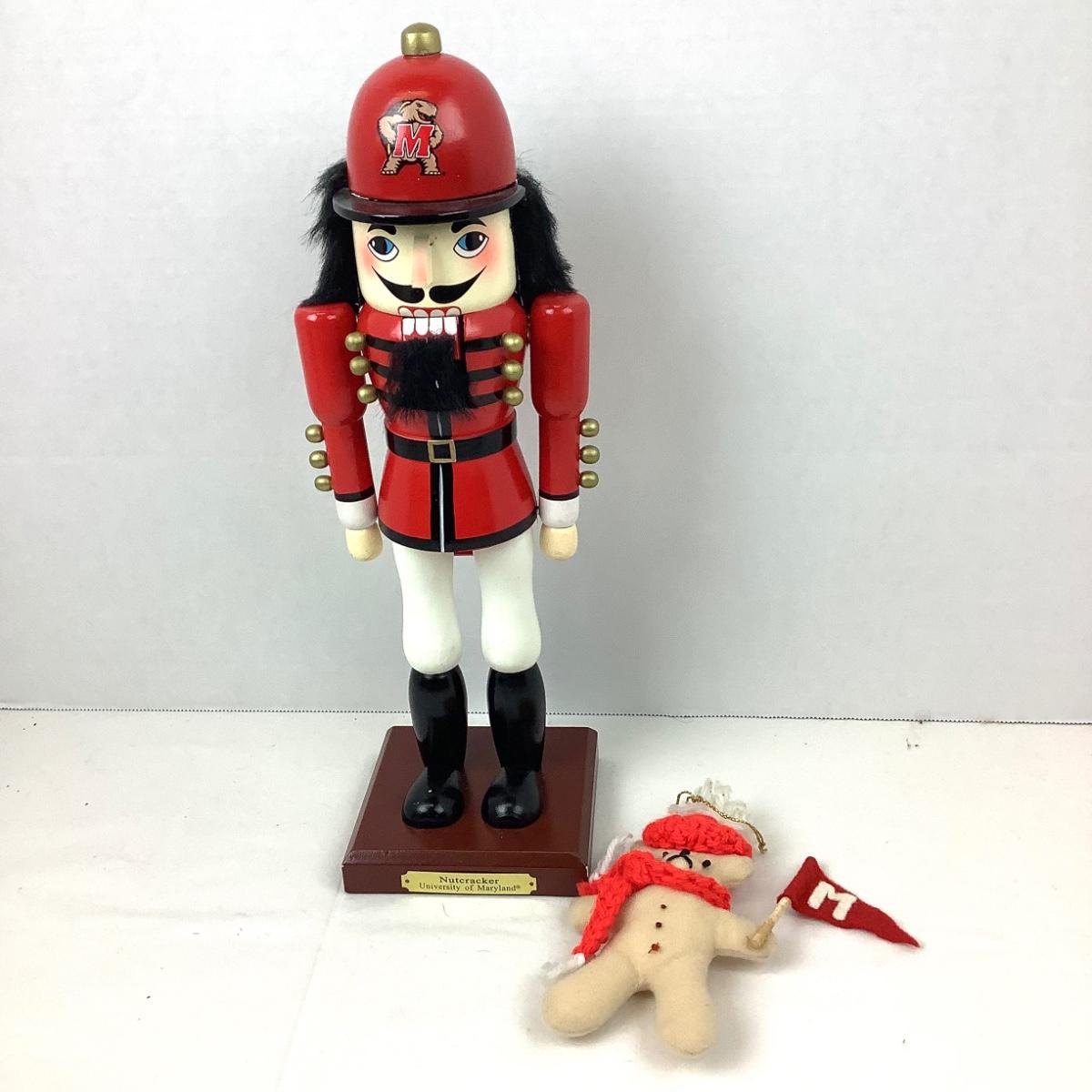 The nutcracker is 14" tall and there is a handmade felt bear ornament with M flag and a University of Maryland round ornament.