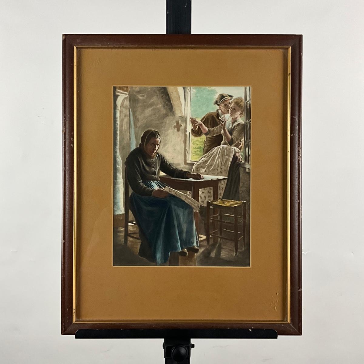 Continental European school, late 19th century. Hand-colored print depicting a domestic genre interior scene.