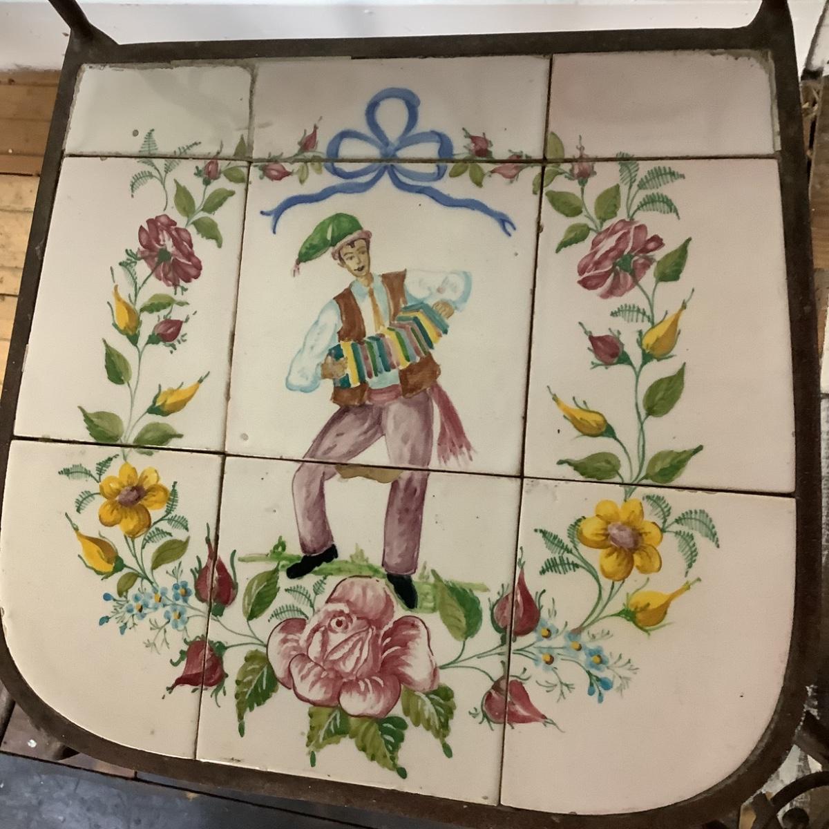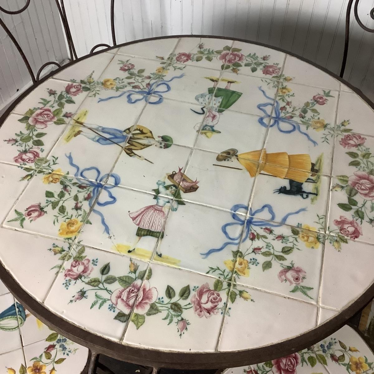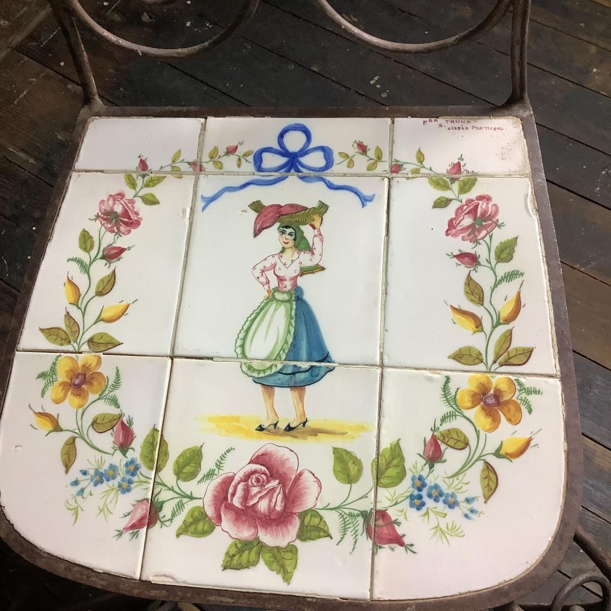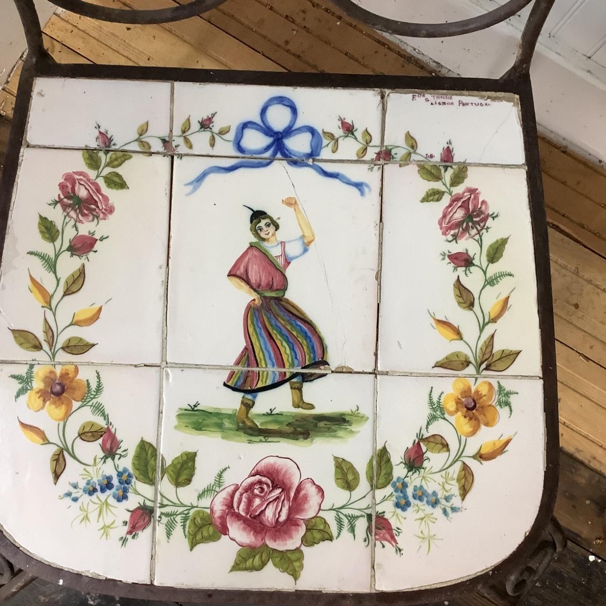 332 Portuguese Hand Painted Tile Top Iron Table and Chairs. Artist signed tiles. Usual wear consistent with age.