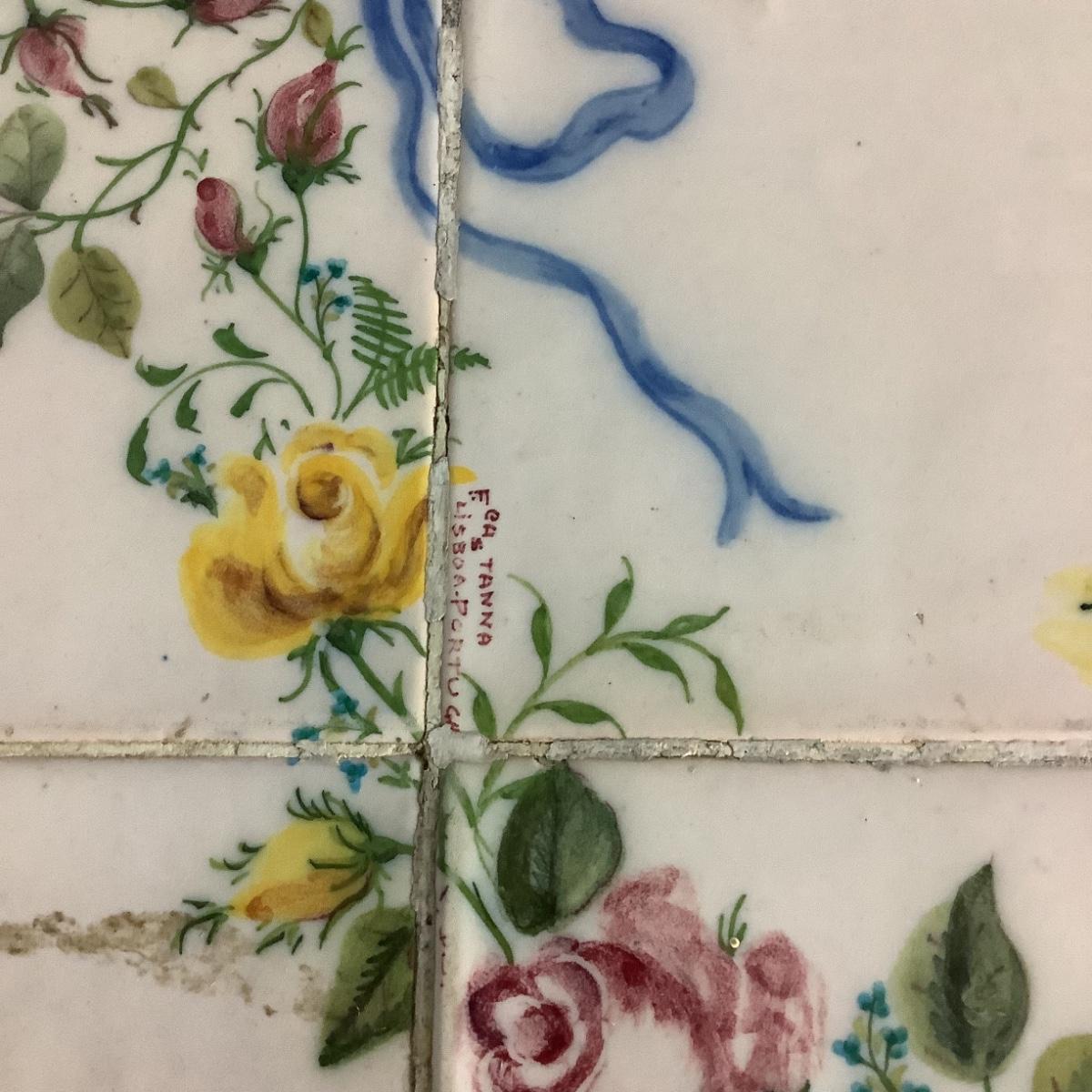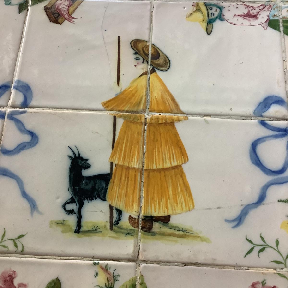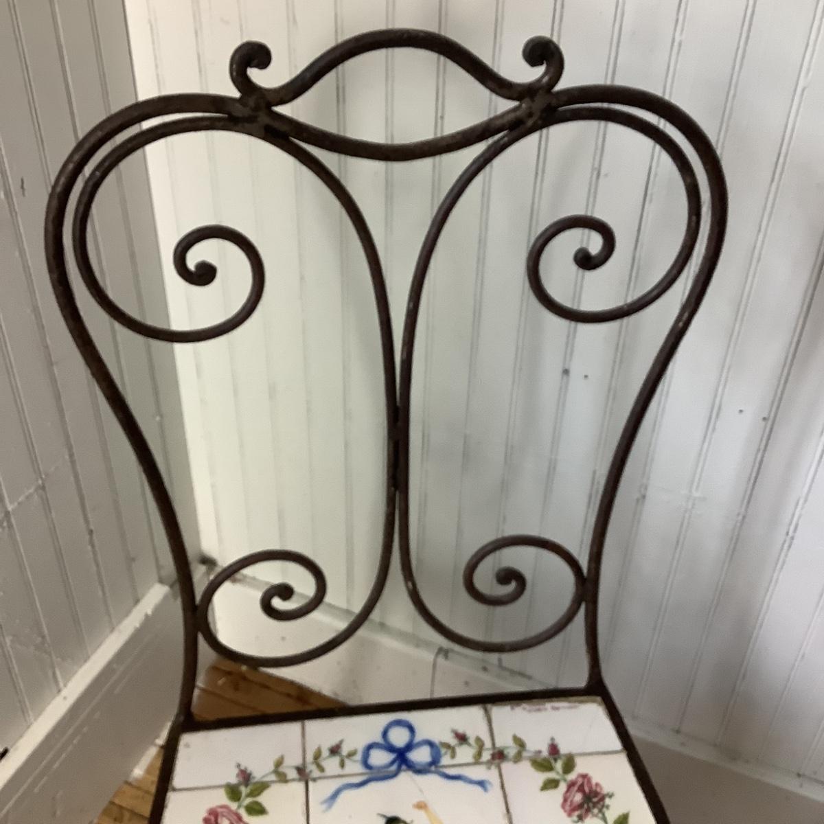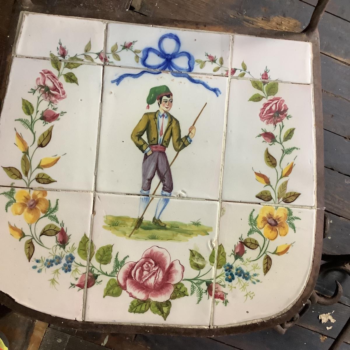 332 Portuguese Hand Painted Tile Top Iron Table and Chairs. Artist signed tiles. Usual wear consistent with age.