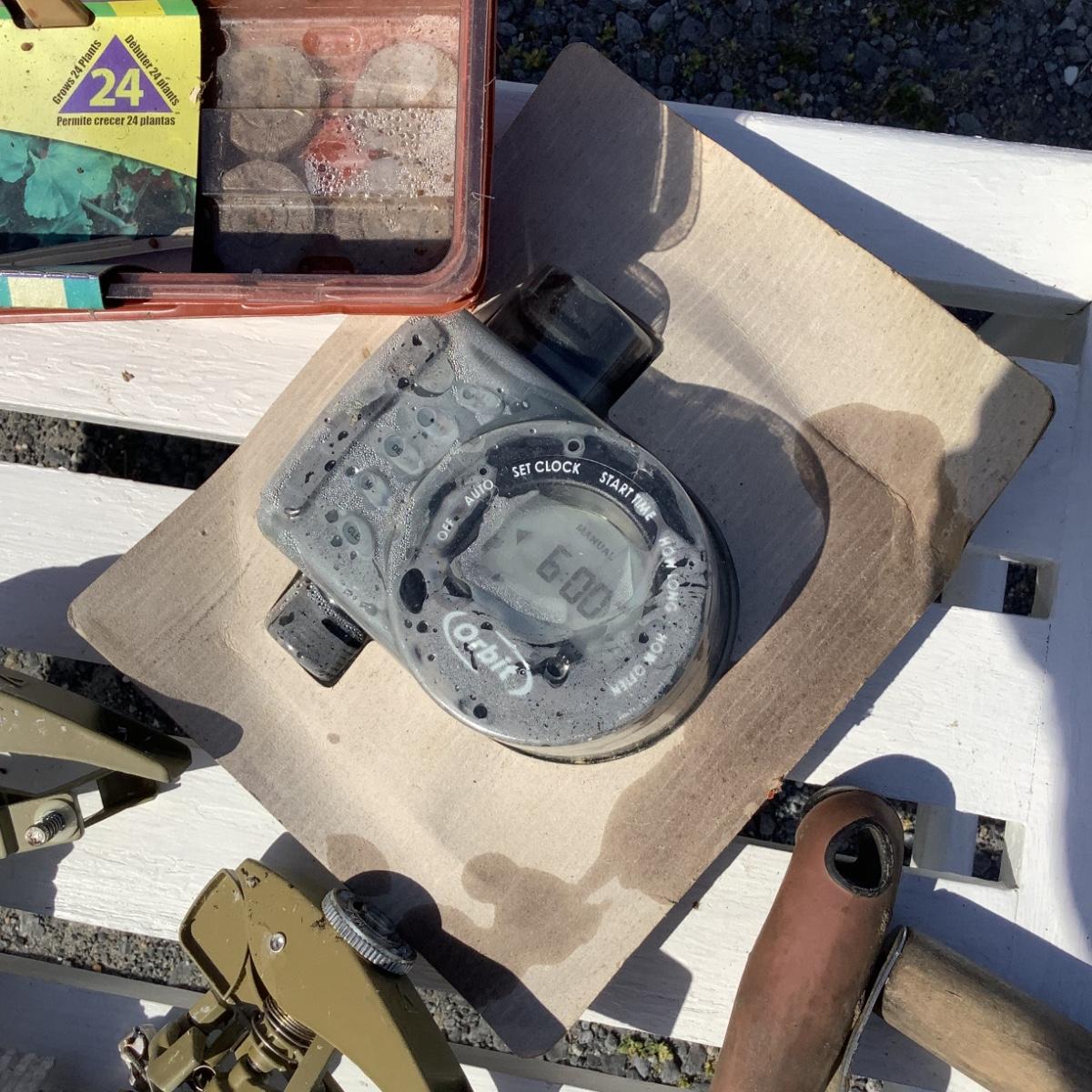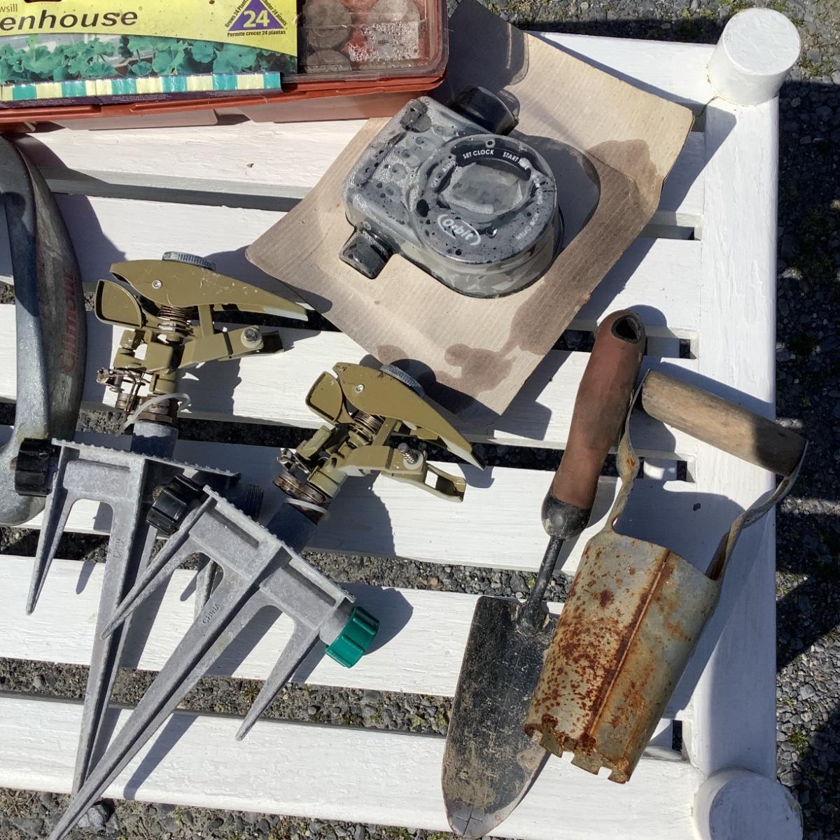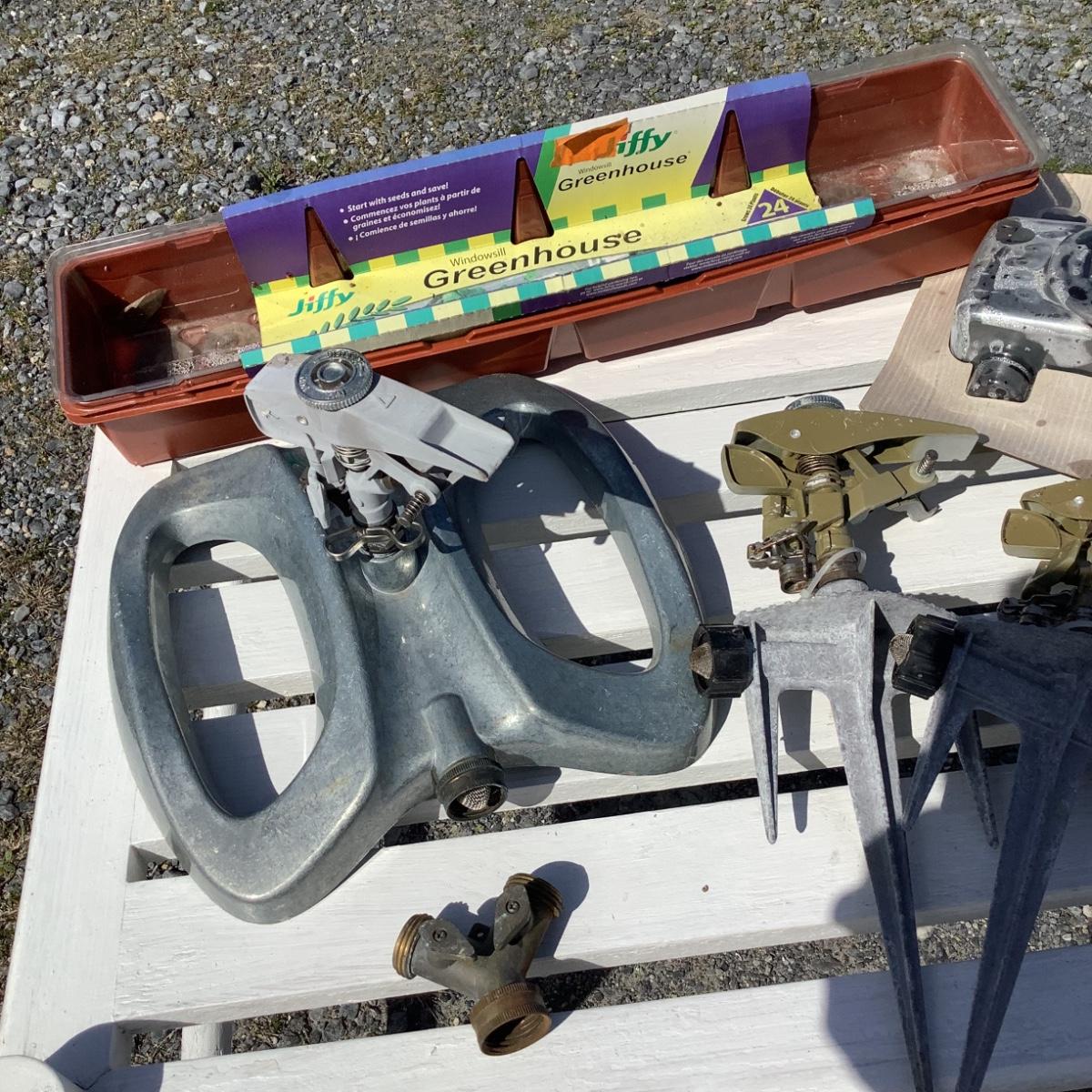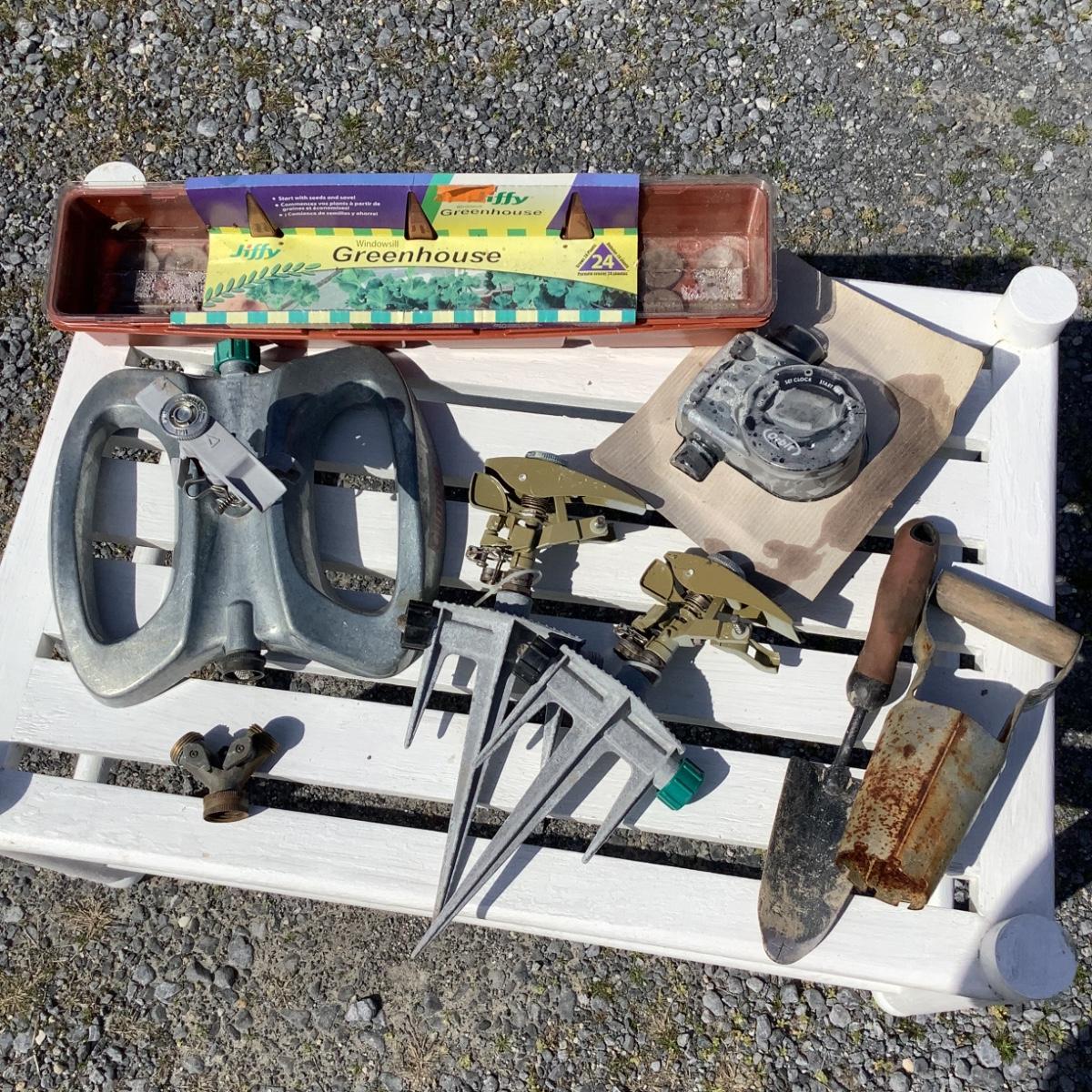 Includes sprinklers, orbit timer, windowsill greenhouse planters, garden tools