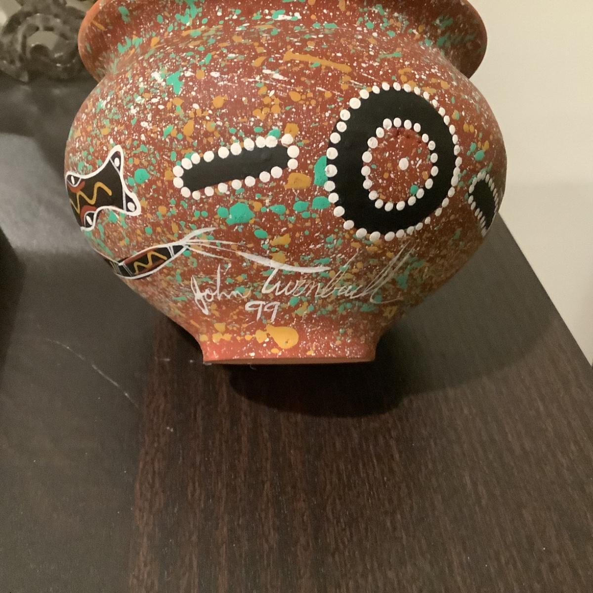 Handpainted Aborigine Vase Signed by Artist '99 measuring 4" high x 5" widest