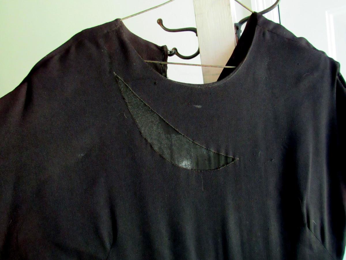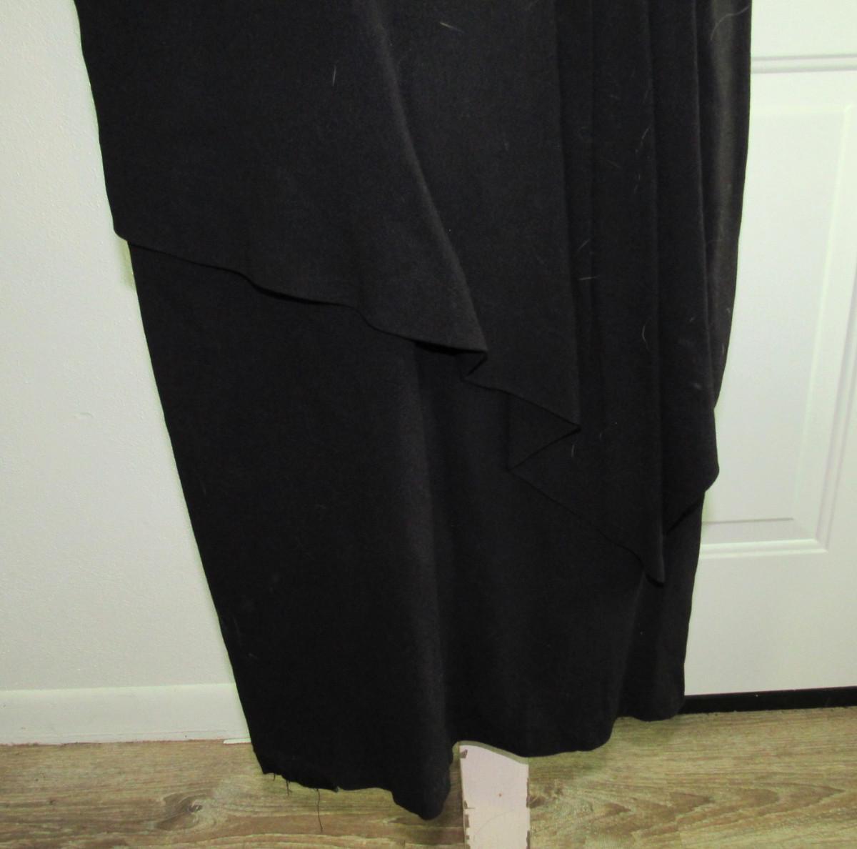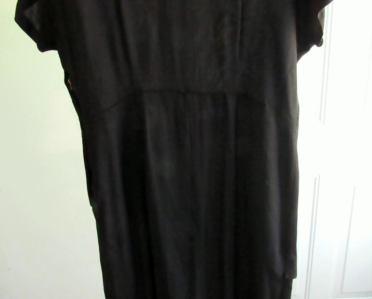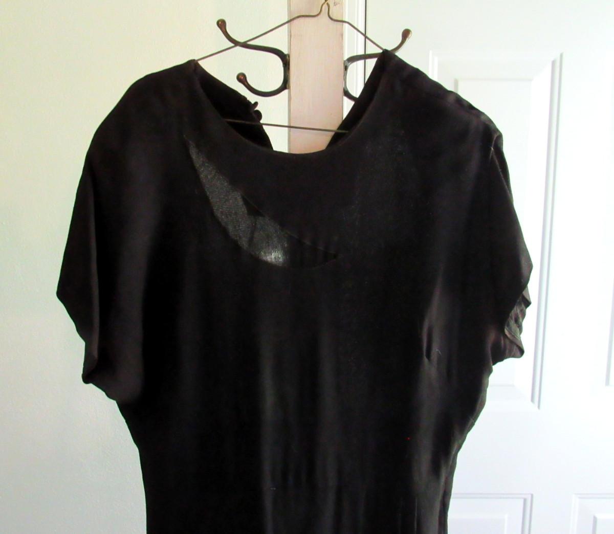 Appr 1940-50s. All black with a sheer black moon cutout on upper chest. Short sleeves, side pleats and asymmetrical ruffle on lower skirt section. Was very hard to photograph. .Back buttons at neckline, 1 missing, 2 loose, all loops intact. Side zipper good. No labels, size unknown. Measures about 17" shoulder to shoulder, about 18" at waist, about 48" long. Hem needs mending in spots. I don't see any holes or tears. Shipping is available at actual shipping cost plus $5.00 handling fee per box for supplies/labor. See our terms for details. All sales are final. Condition notes may not be all inclusive, we may miss some issues as most vintage items are not in mint condition and have some degree of wear, paint loss, etc, but we always try to note obvious damage.