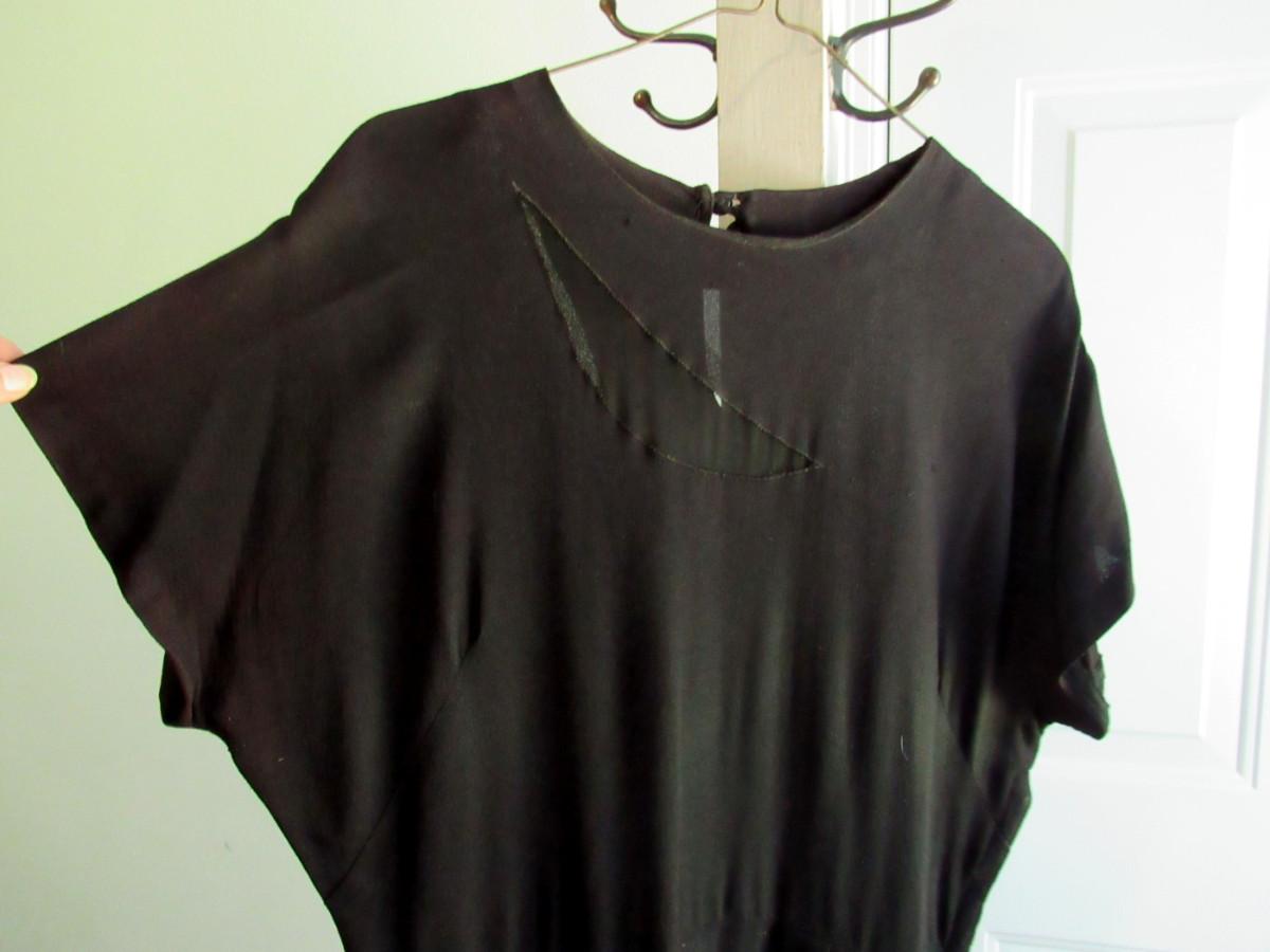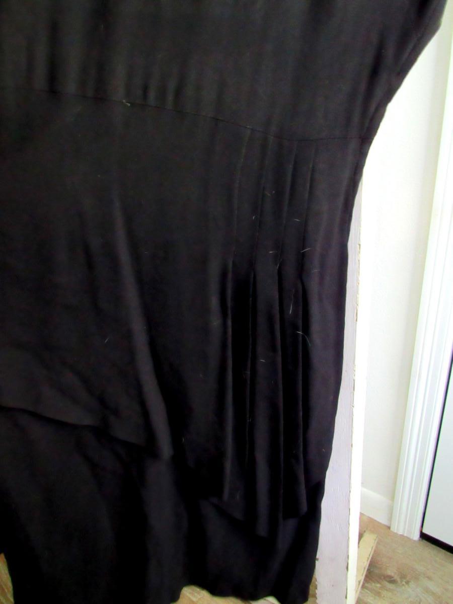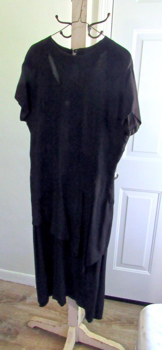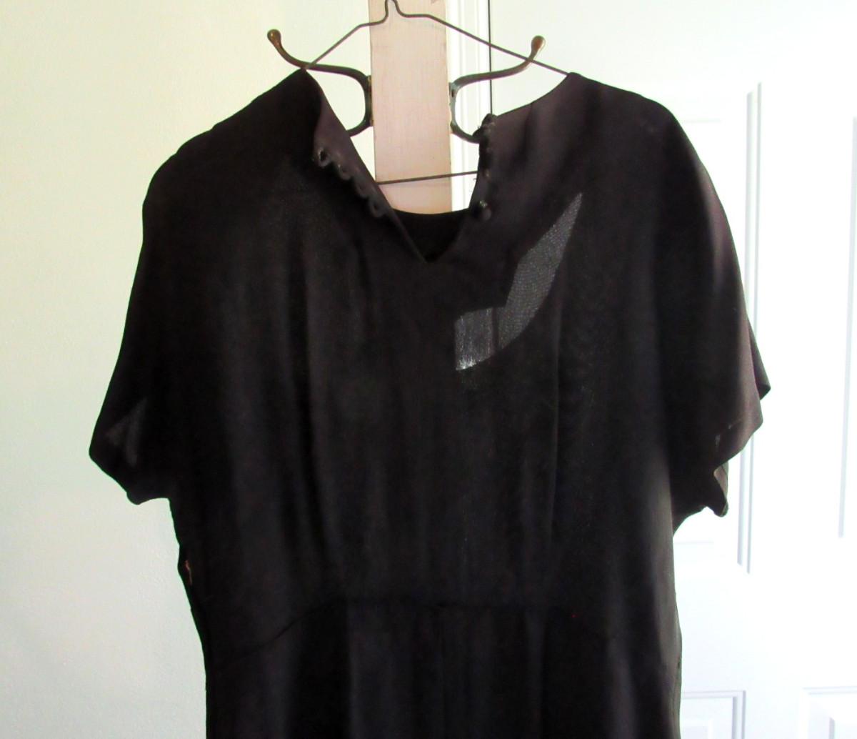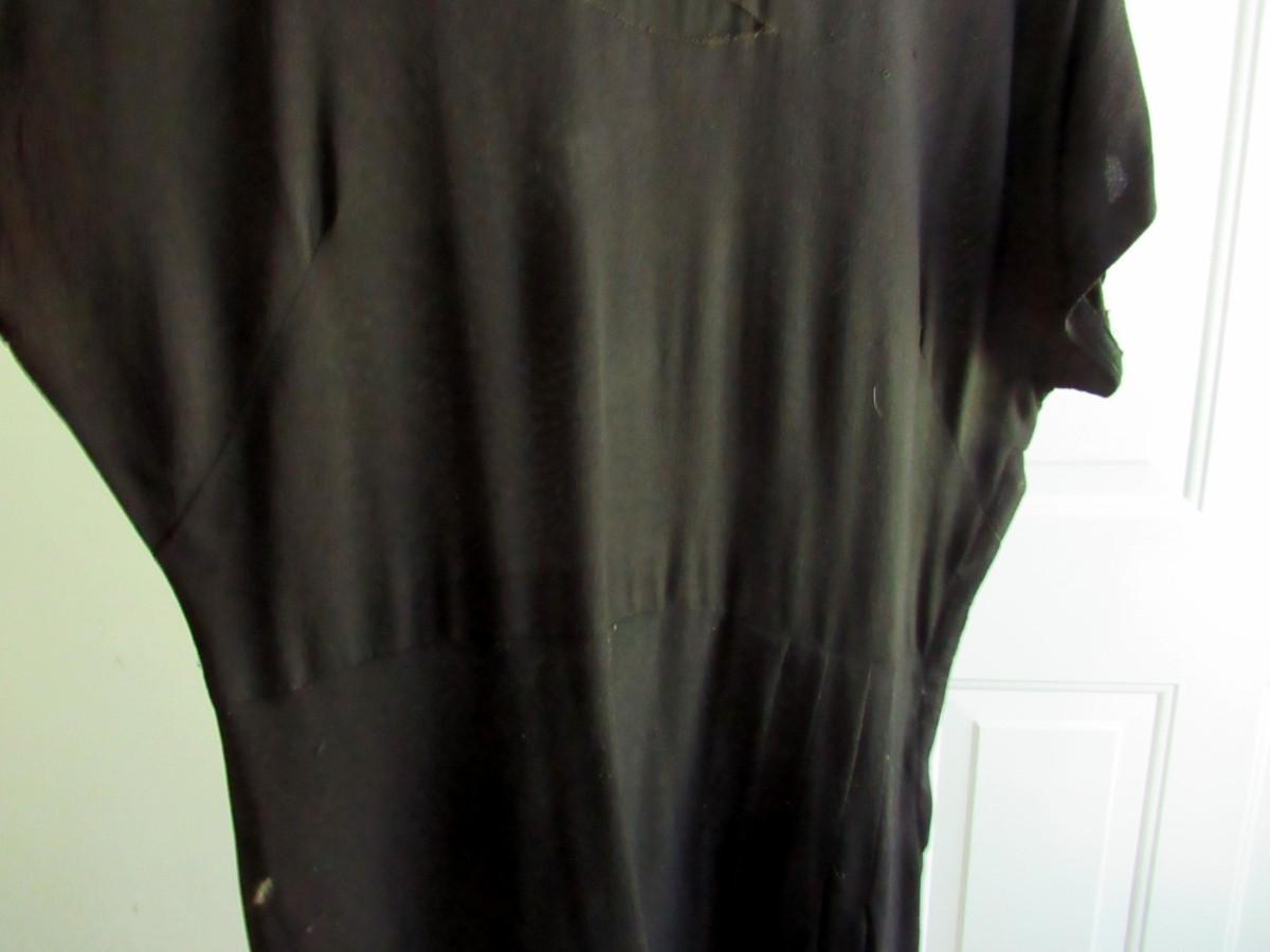 Appr 1940-50s. All black with a sheer black moon cutout on upper chest. Short sleeves, side pleats and asymmetrical ruffle on lower skirt section. Was very hard to photograph. .Back buttons at neckline, 1 missing, 2 loose, all loops intact. Side zipper good. No labels, size unknown. Measures about 17" shoulder to shoulder, about 18" at waist, about 48" long. Hem needs mending in spots. I don't see any holes or tears. Shipping is available at actual shipping cost plus $5.00 handling fee per box for supplies/labor. See our terms for details. All sales are final. Condition notes may not be all inclusive, we may miss some issues as most vintage items are not in mint condition and have some degree of wear, paint loss, etc, but we always try to note obvious damage.