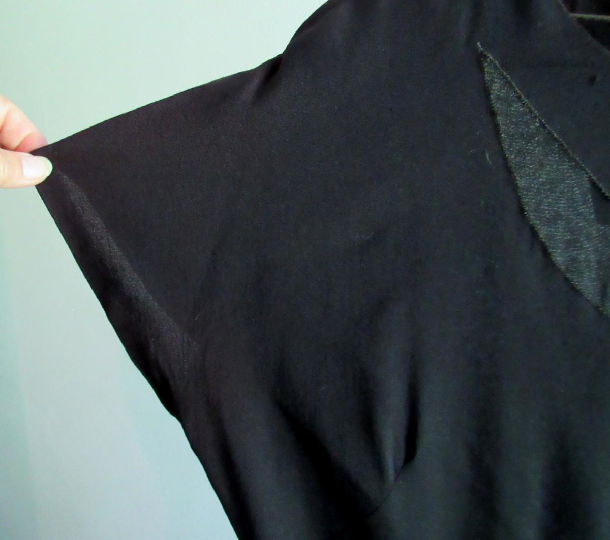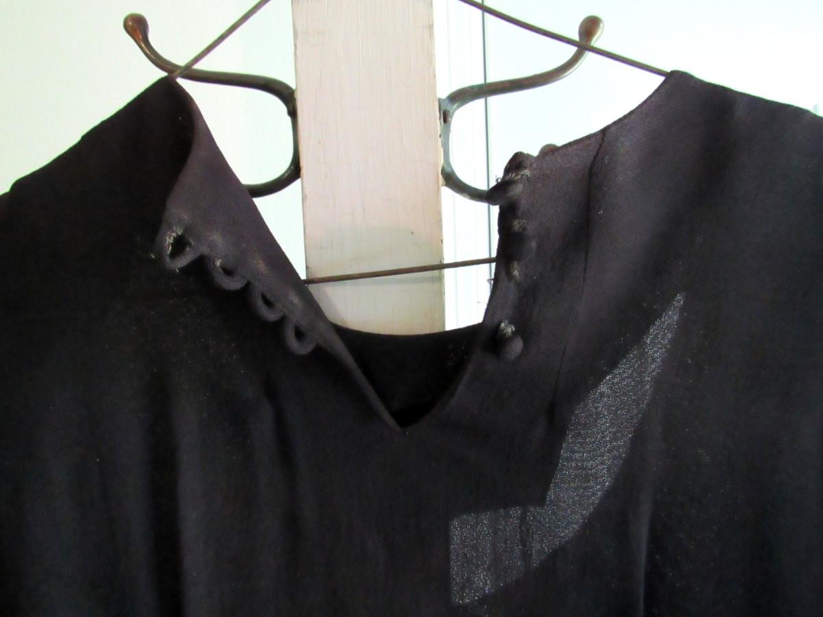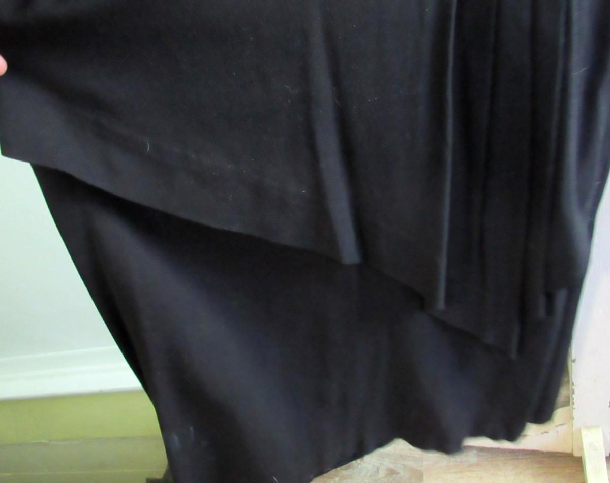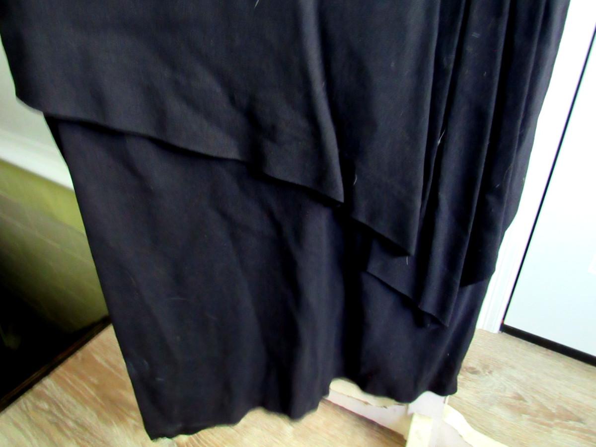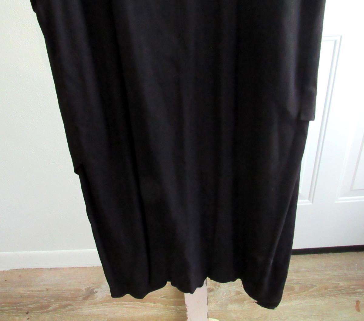 Appr 1940-50s. All black with a sheer black moon cutout on upper chest. Short sleeves, side pleats and asymmetrical ruffle on lower skirt section. Was very hard to photograph. .Back buttons at neckline, 1 missing, 2 loose, all loops intact. Side zipper good. No labels, size unknown. Measures about 17" shoulder to shoulder, about 18" at waist, about 48" long. Hem needs mending in spots. I don't see any holes or tears. Shipping is available at actual shipping cost plus $5.00 handling fee per box for supplies/labor. See our terms for details. All sales are final. Condition notes may not be all inclusive, we may miss some issues as most vintage items are not in mint condition and have some degree of wear, paint loss, etc, but we always try to note obvious damage.