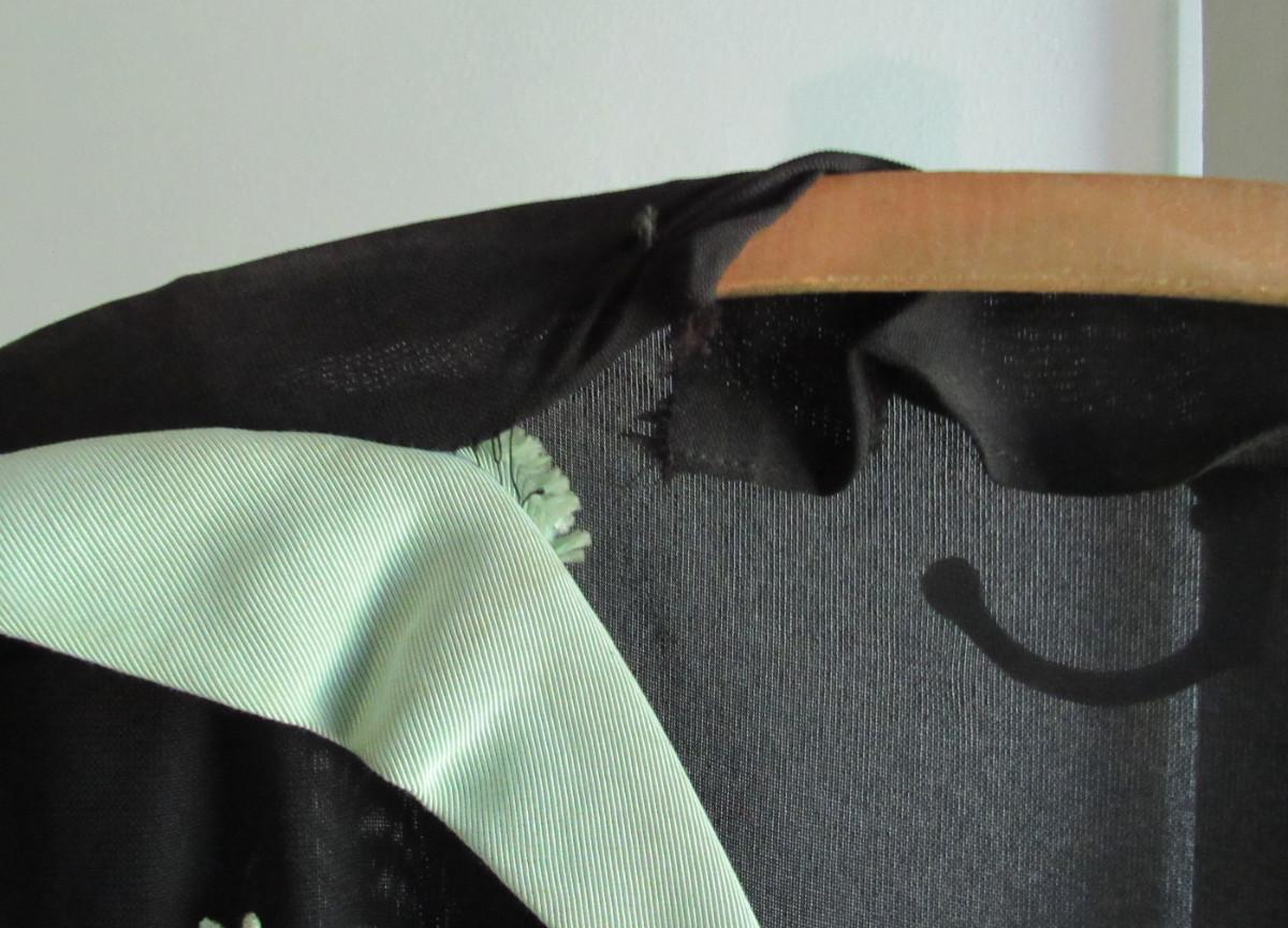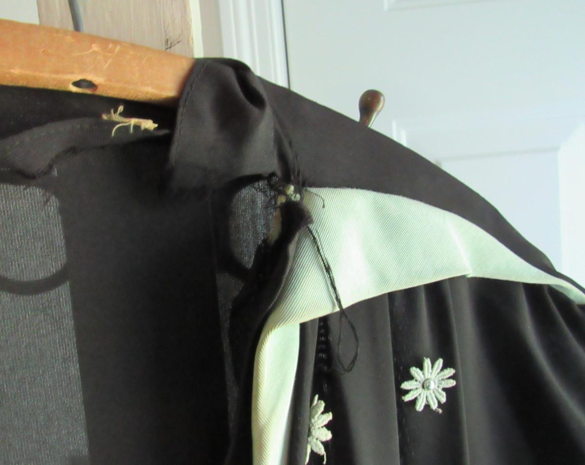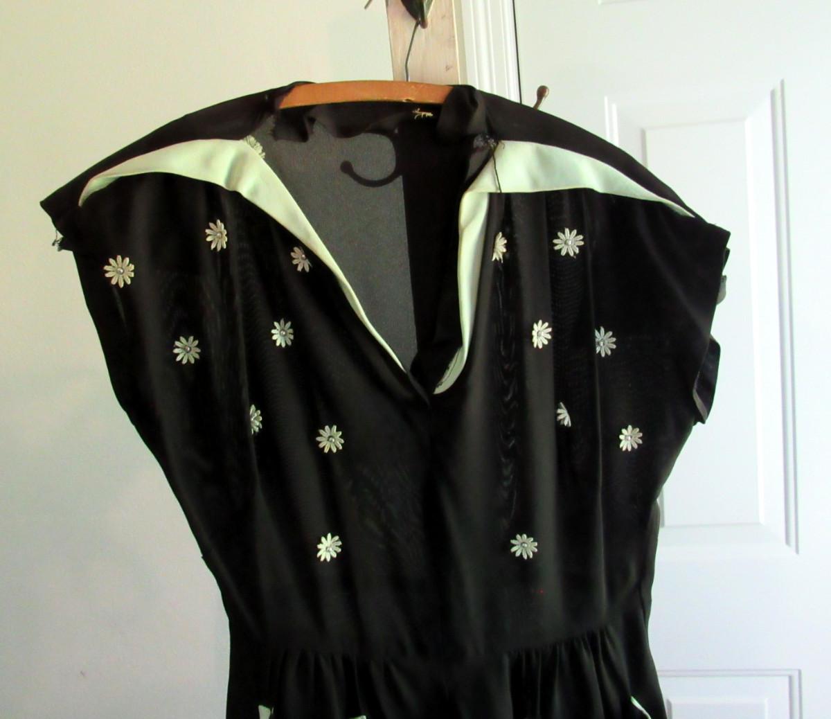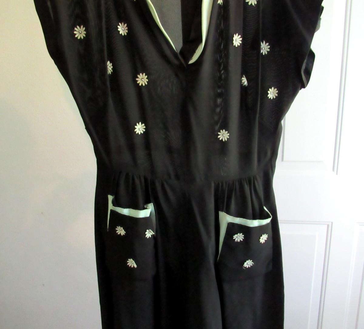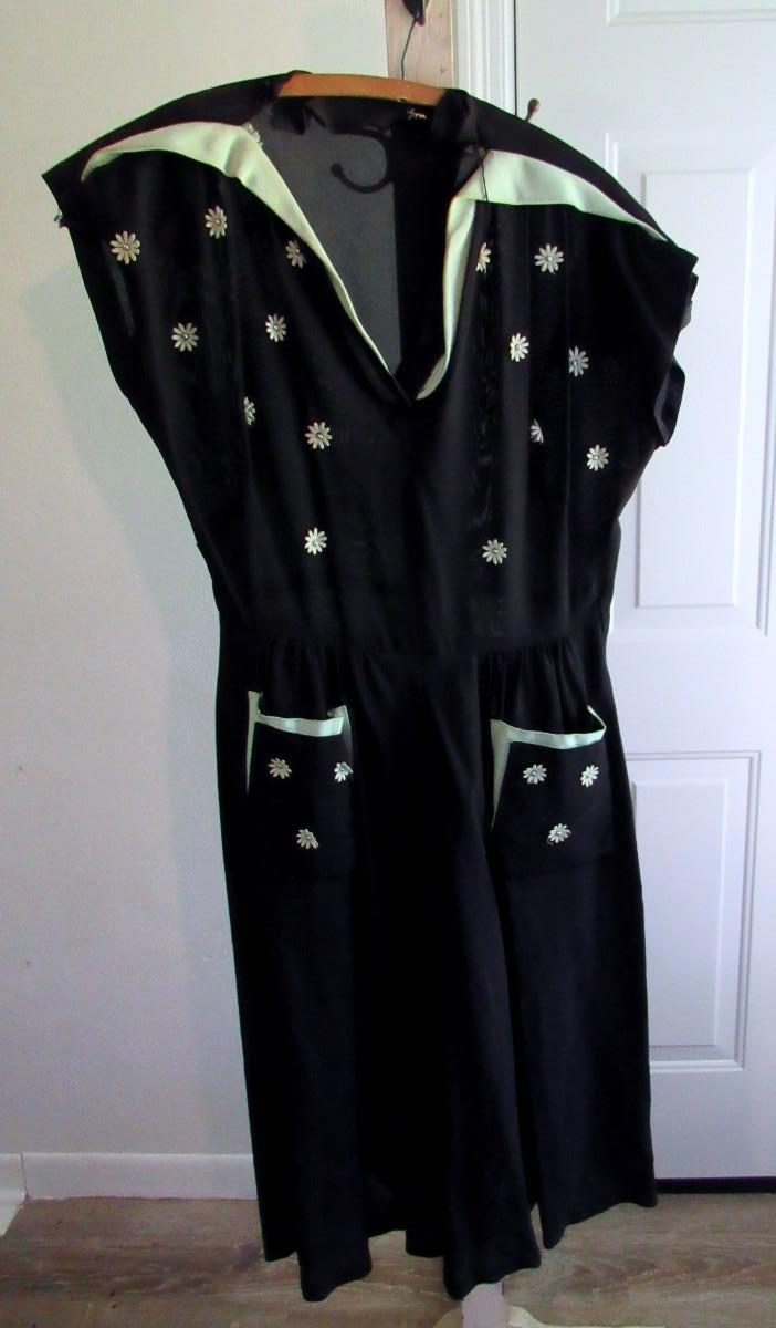 Appr 1940-50s. Dark black semi sheer fabric with green trim and applied flowers and beads. Short sleeves. Shoulders were padded at one time but someone cut them out. Cutting them out caused a tear at the neckline/seam on both sides as seen in photos. Good belt loops but no belt. Good side zipper. Light discoloration on the top edges of the green trim in spots, did not try to clean. I am hoping a seamstress would know how to fix this because it is just an adorable dress. There was a label but it had been cut out. Don't know size. Measures about 22" outer shoulder to outer shoulder, about 17" across at the belt line, by about 48" long. Shipping is available at actual shipping cost plus $5.00 handling fee per box for supplies/labor. See our terms for details. All sales are final. Condition notes may not be all inclusive, we may miss some issues as most vintage items are not in mint condition and have some degree of wear, paint loss, etc, but we always try to note obvious damage.