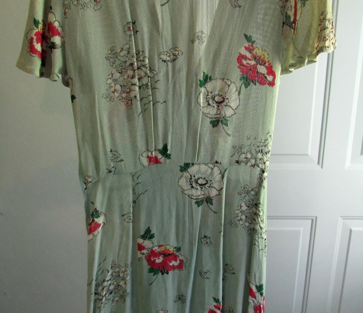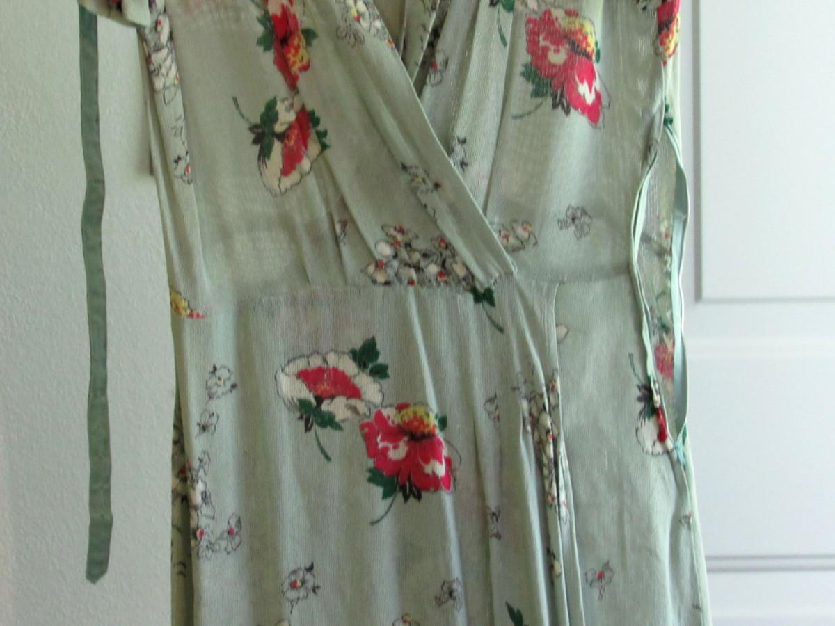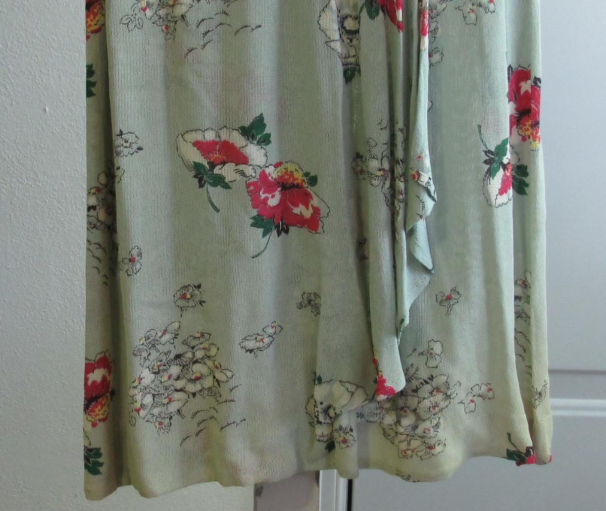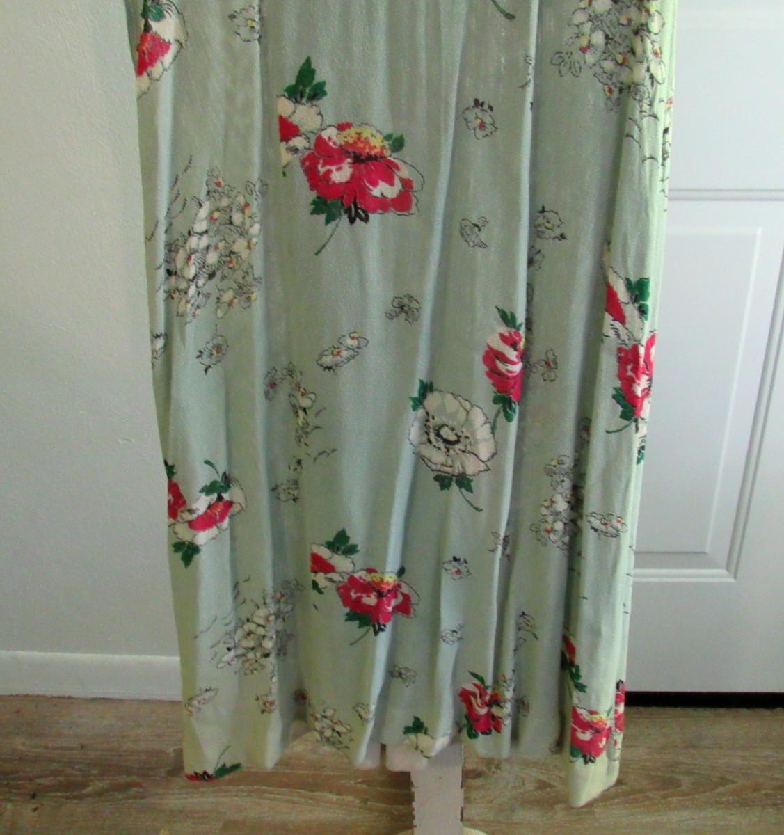 Appr 1940s semi sheer green material with big floral pattern, low crossover V neck, partial pleating at waist, asymmetrical bottom front. Good side zipper. Don't see any holes or tears. Slight seam separation at waist in spot, easy fix. No labels, size unknown. Measures about 14" across at waist x about 47" long. Some spotting on belt. Shipping is available at actual shipping cost plus $5.00 handling fee per box for supplies/labor. See our terms for details. All sales are final. Condition notes may not be all inclusive, we may miss some issues as most vintage items are not in mint condition and have some degree of wear, paint loss, etc, but we always try to note obvious damage.