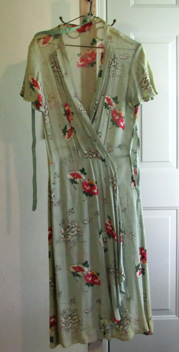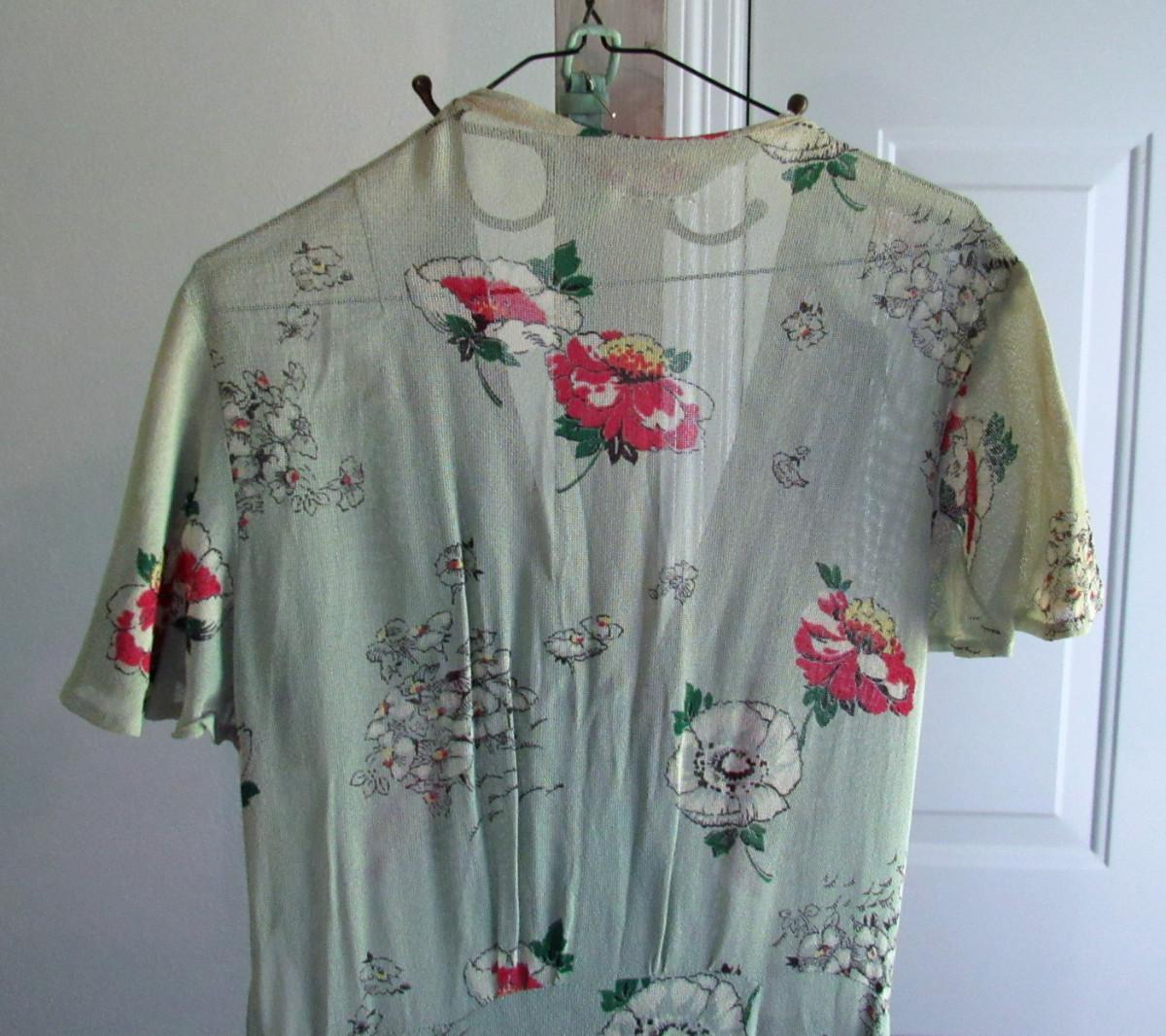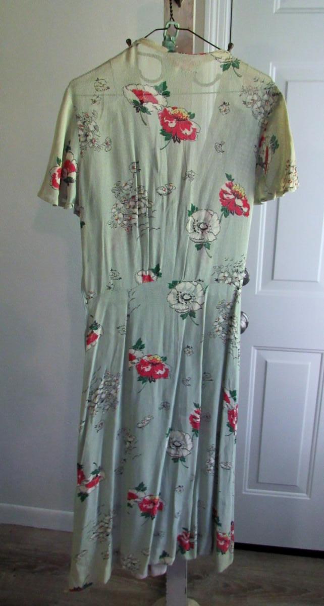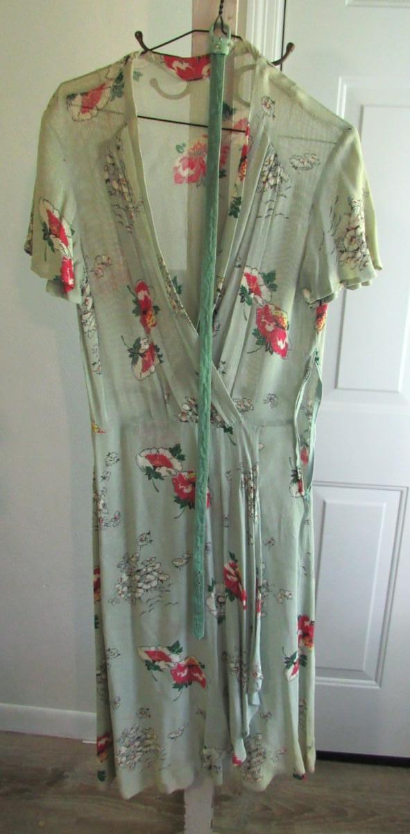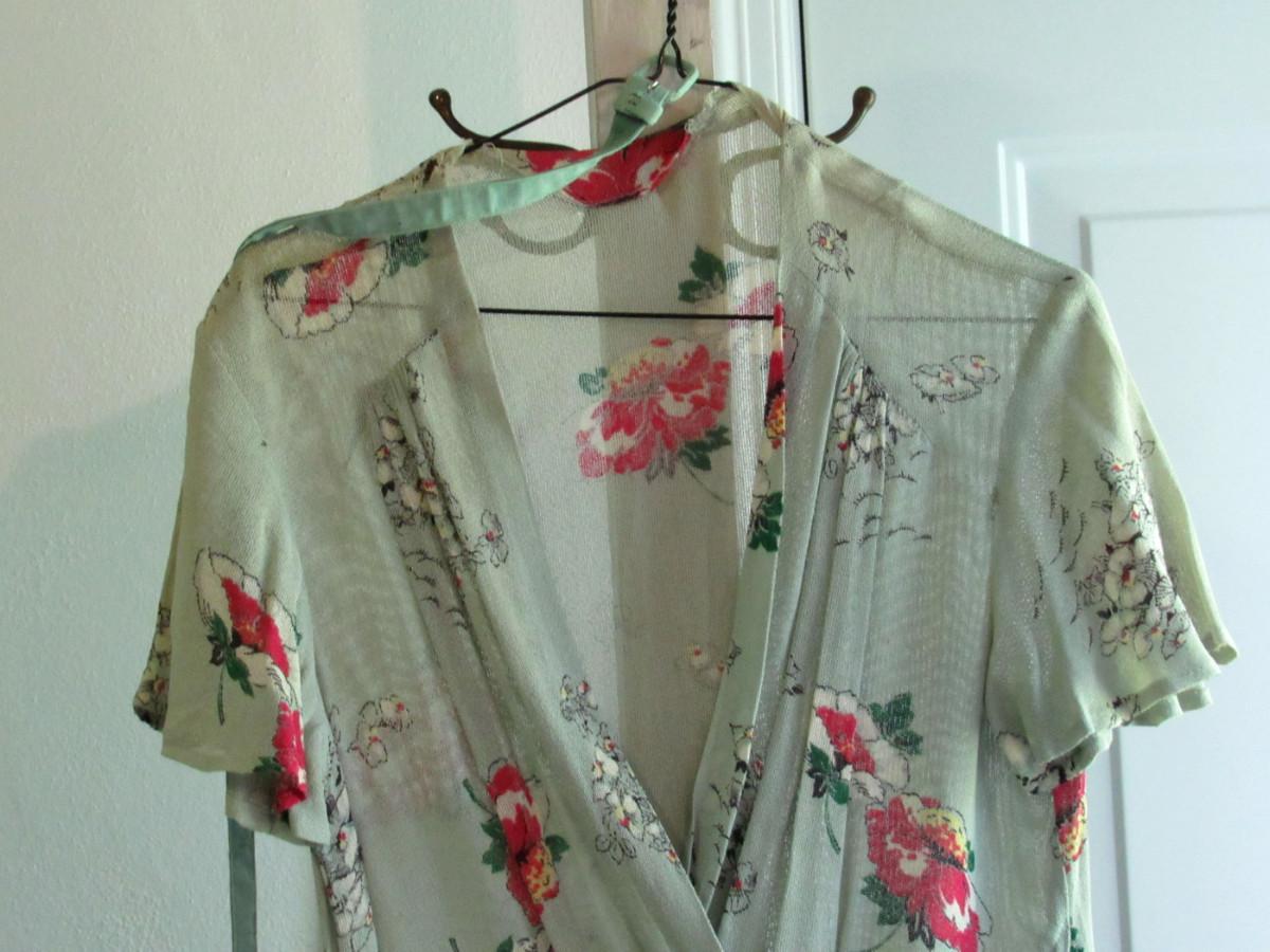 Appr 1940s semi sheer green material with big floral pattern, low crossover V neck, partial pleating at waist, asymmetrical bottom front. Good side zipper. Don't see any holes or tears. Slight seam separation at waist in spot, easy fix. No labels, size unknown. Measures about 14" across at waist x about 47" long. Some spotting on belt. Shipping is available at actual shipping cost plus $5.00 handling fee per box for supplies/labor. See our terms for details. All sales are final. Condition notes may not be all inclusive, we may miss some issues as most vintage items are not in mint condition and have some degree of wear, paint loss, etc, but we always try to note obvious damage.