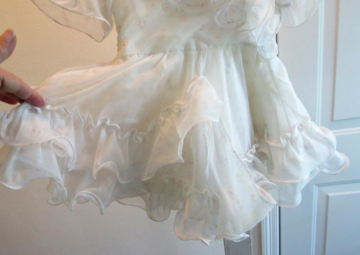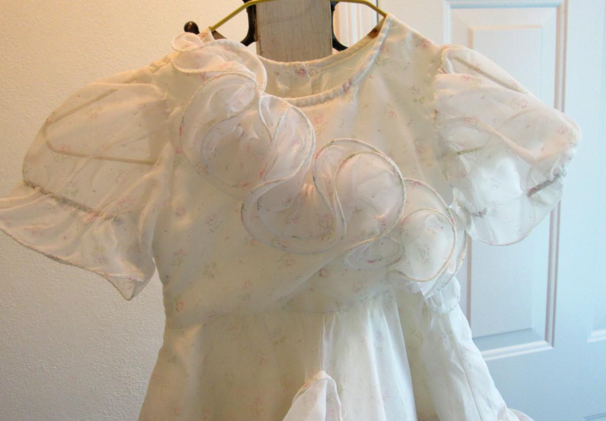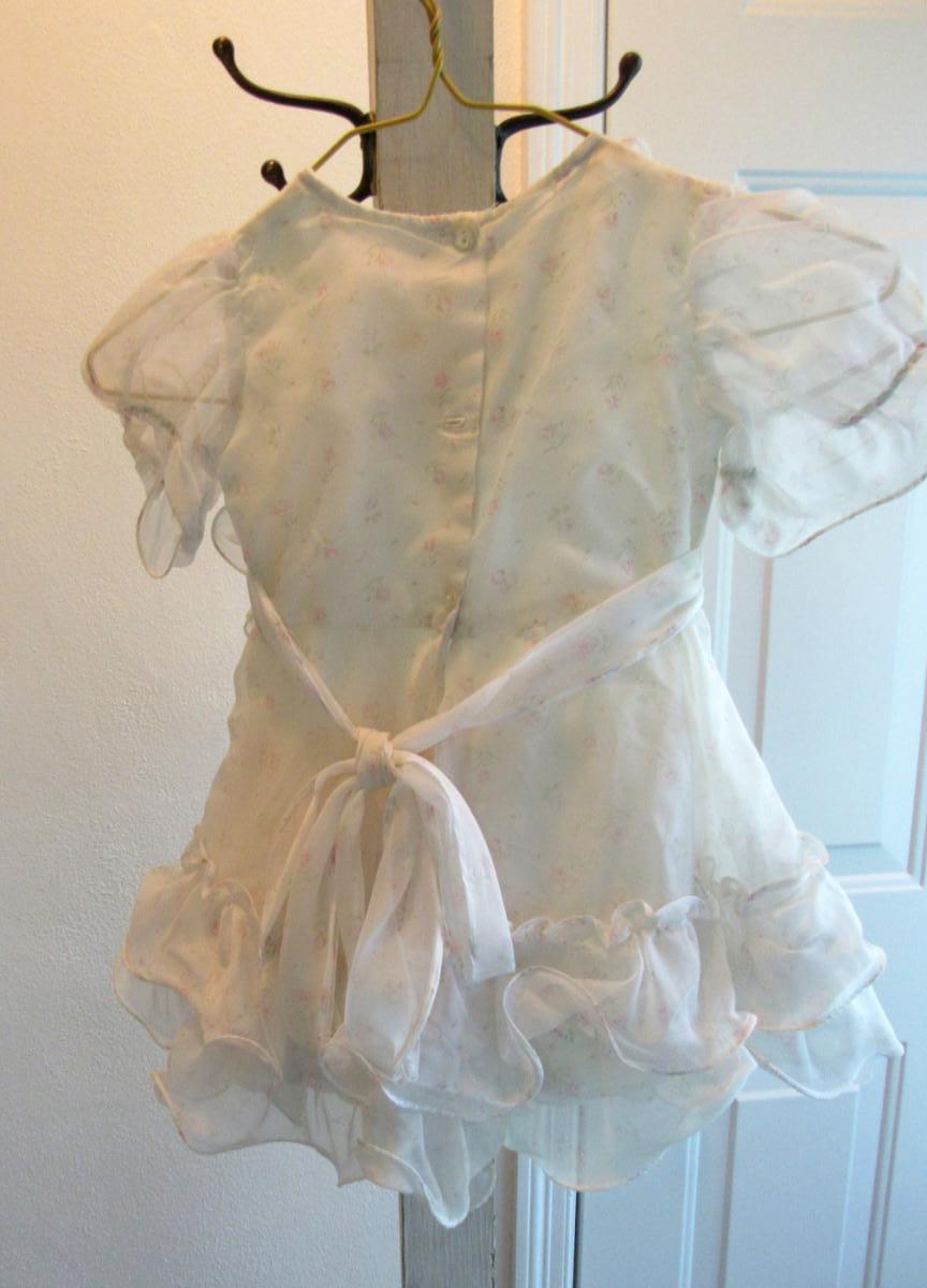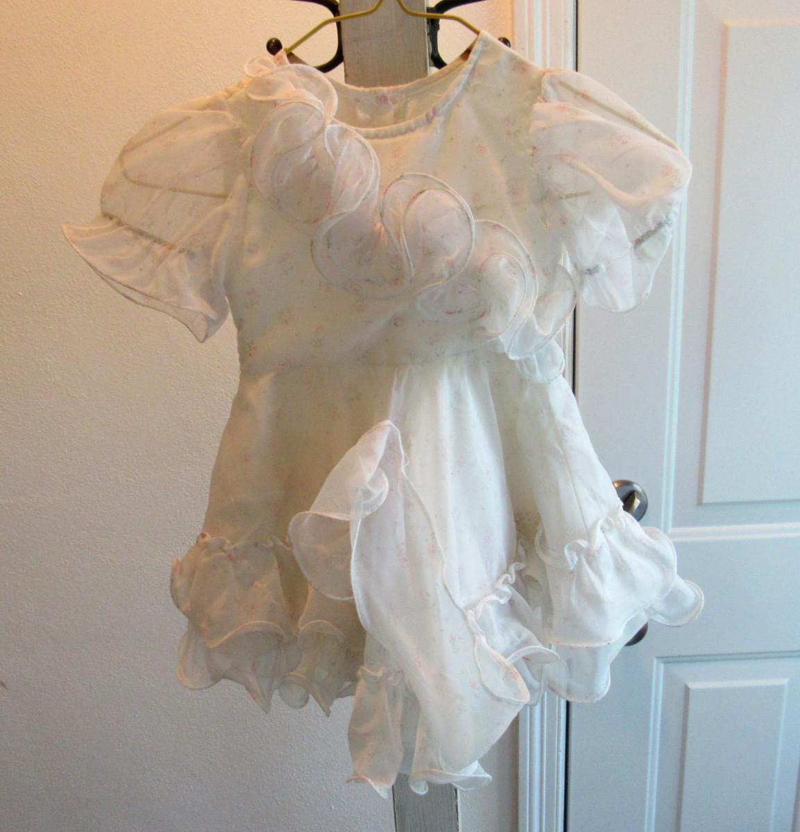 Fancy frilly Shirley Temple style vintage small girl's party dress, lots of ruffles, short sleeves, small light floral pattern. Nice underskirt and netting. Back buttons, attached back tie belt. Part of the lower ruffle has come undone and needs to be reattached. Otherwise I don't see any issues. No labels, unknown size. About 10" at the waist and about 19" long. Shipping is available at actual shipping cost plus $5.00 handling fee per box for supplies/labor. See our terms for details. All sales are final. Condition notes may not be all inclusive, we may miss some issues as most vintage items are not in mint condition and have some degree of wear, paint loss, etc, but we always try to note obvious damage.