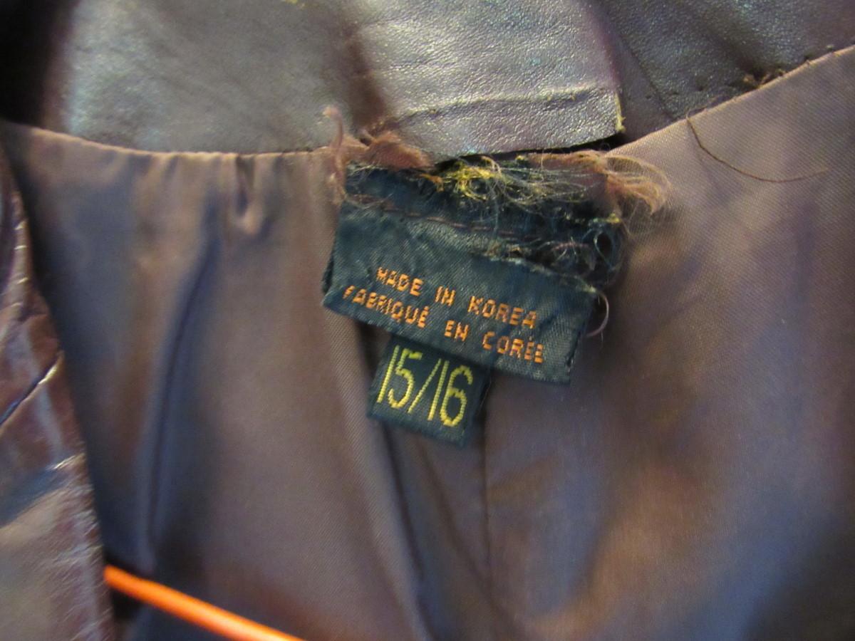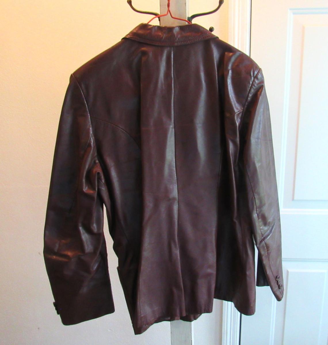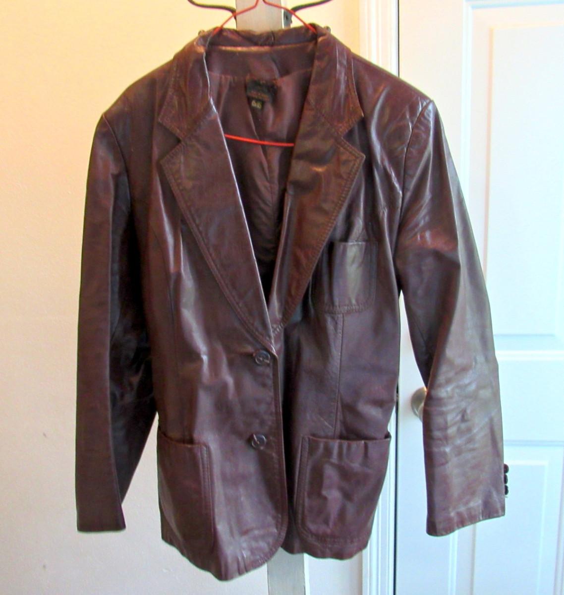 Nice Ladies size 15/16 leather jacket. Like a dark mauve-ish/brown color. 2 button front closure. Two front pockets. 100% leather shell, 100% nylon lining. Appears to be in great shape. Except for where the label is attached to the neckline, someone tried to tear it off, needs to be reattached. Shipping is available at actual shipping cost plus $5.00 handling fee per box for supplies/labor. See our terms for details. All sales are final. Condition notes may not be all inclusive, we may miss some issues as most vintage items are not in mint condition and have some degree of wear, paint loss, etc, but we always try to note obvious damage.