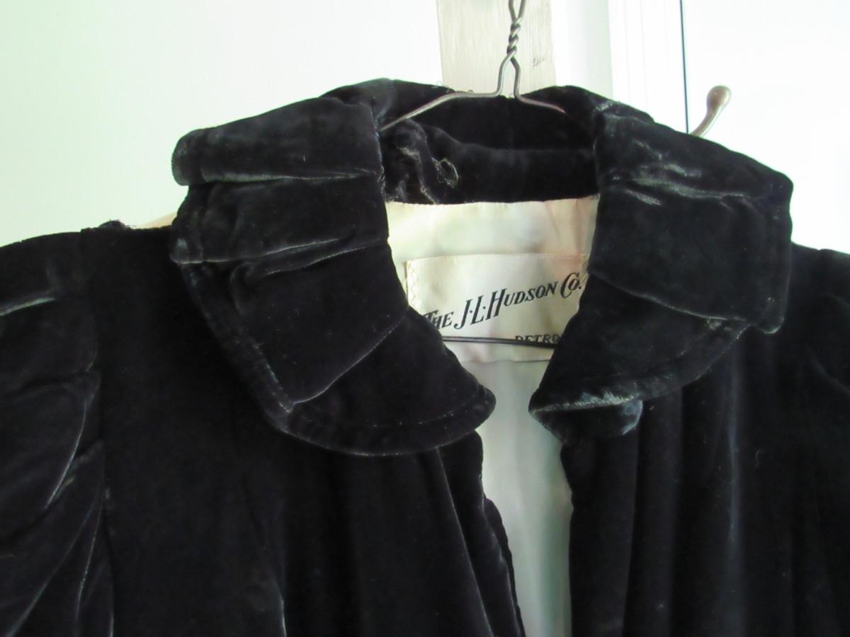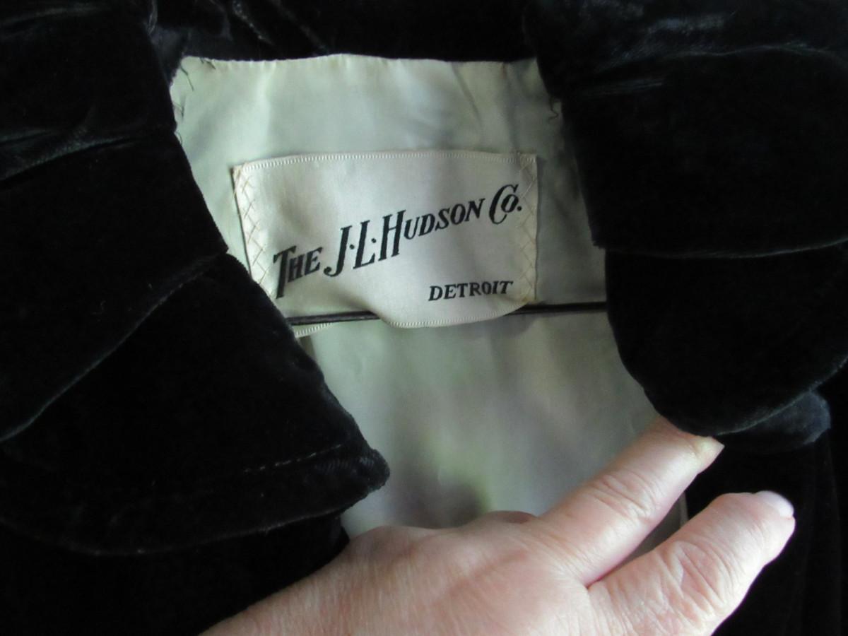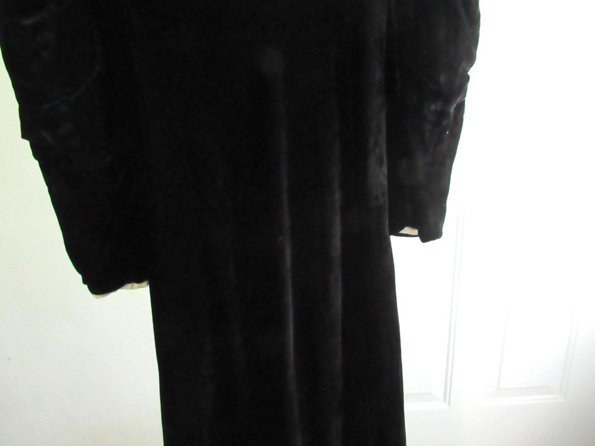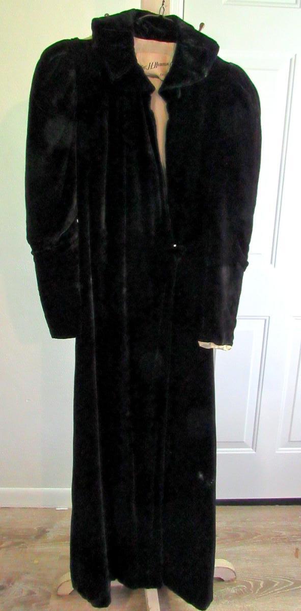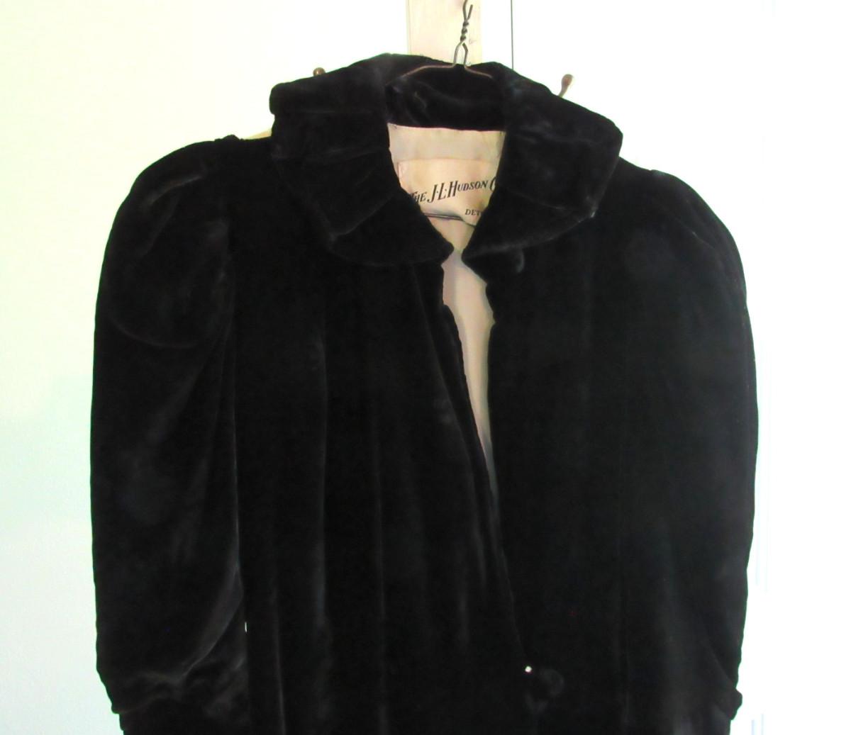 Was so hard to photograph. It is dark black and very soft velvet type material. Label from J L Hudson Co, Detroit. This coat does need repair and someone started but did not finish. There is a shoulder seam separation that can be very easily stitched, someone already opened the lining but never finished the fix. Lower down on the lining there is a small seam fix needed. Both arm pit lining needs seam repair. There is a spot near the bottom that is either dirt or wear, not sure, see pics. Puffy padded shoulders, button closure at neck. One more button and loop closure lower down front. Size unknown. Measures about 14-15" across shoulders, about 57" long. Shipping is available at actual shipping cost plus $5.00 handling fee per box for supplies/labor. See our terms for details. All sales are final. Condition notes may not be all inclusive, we may miss some issues as most vintage items are not in mint condition and have some degree of wear, paint loss, etc, but we always try to note obvious damage.