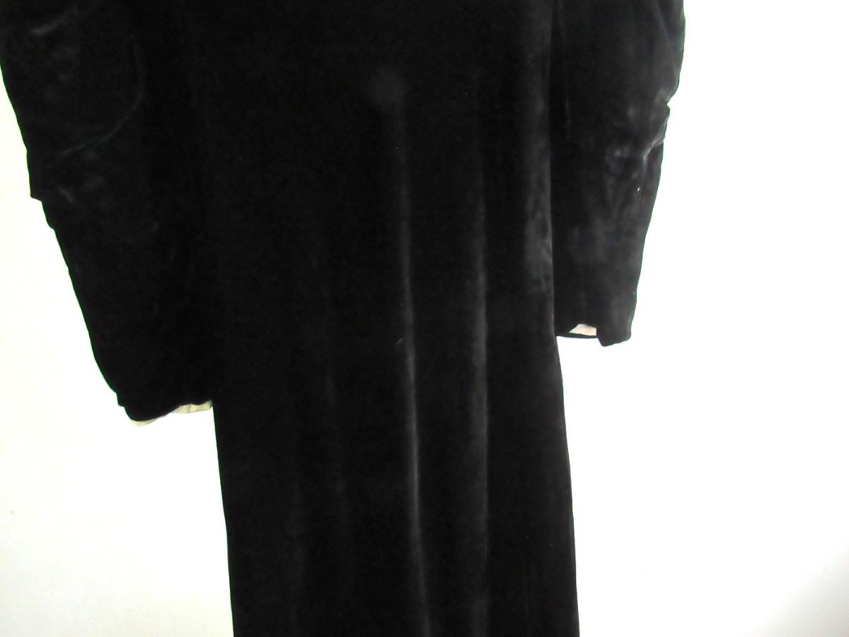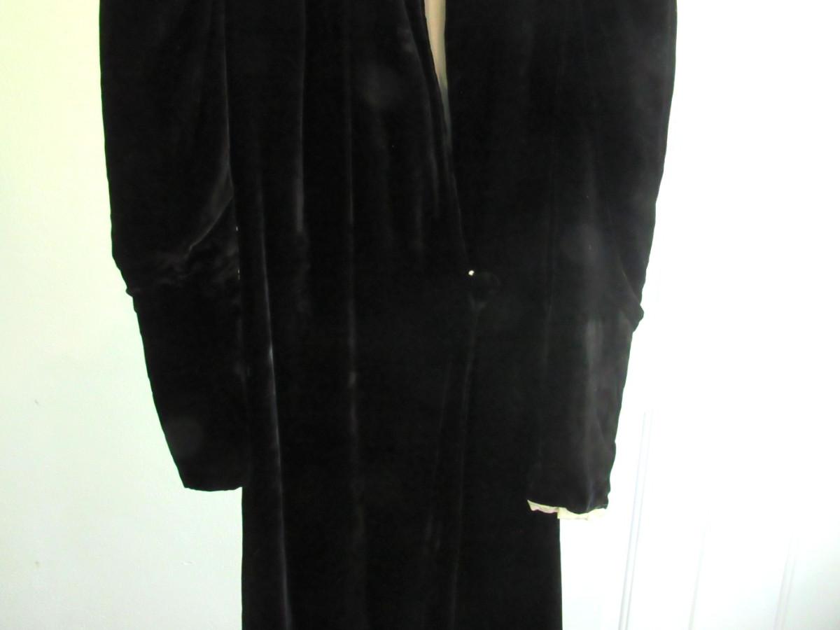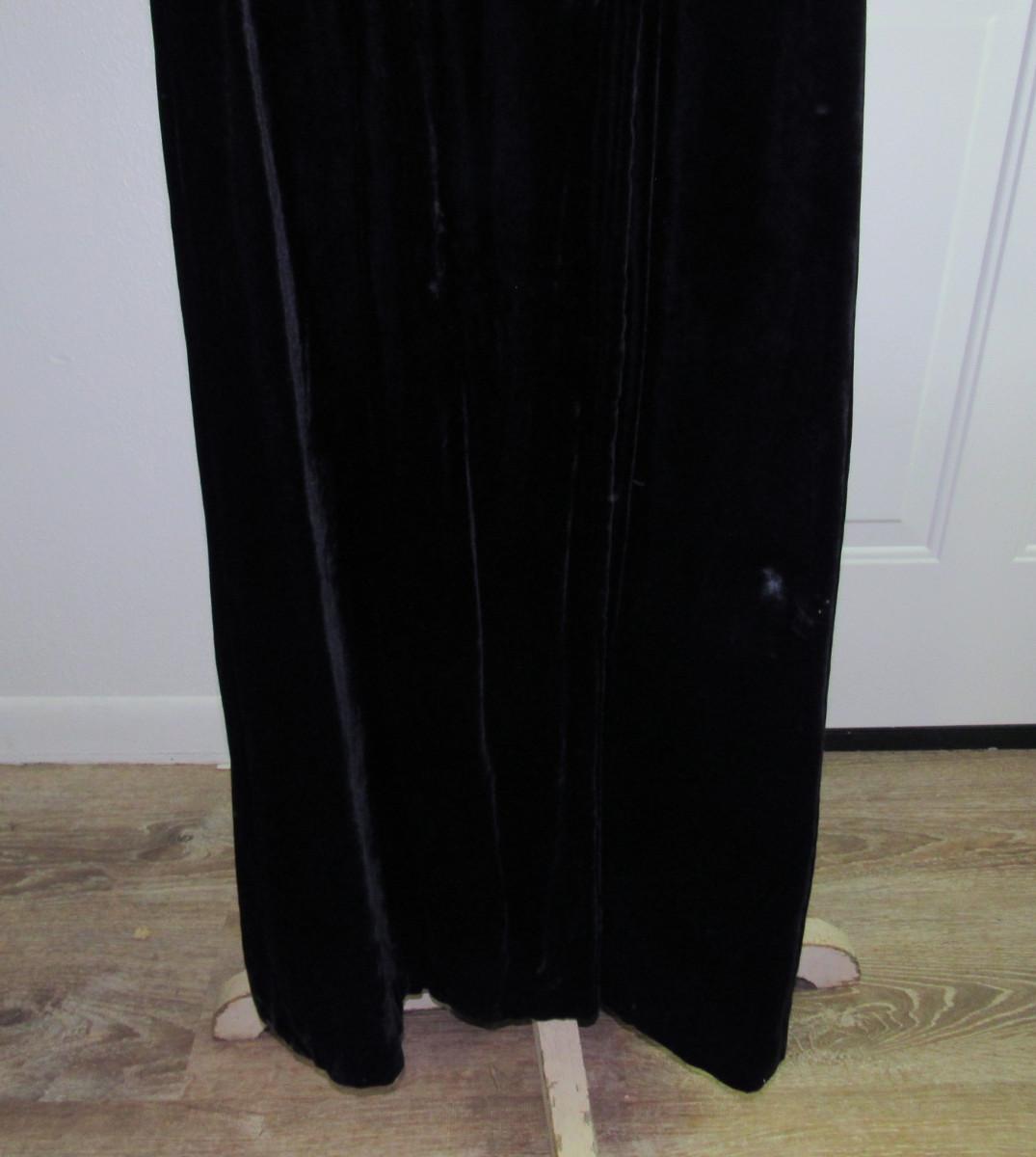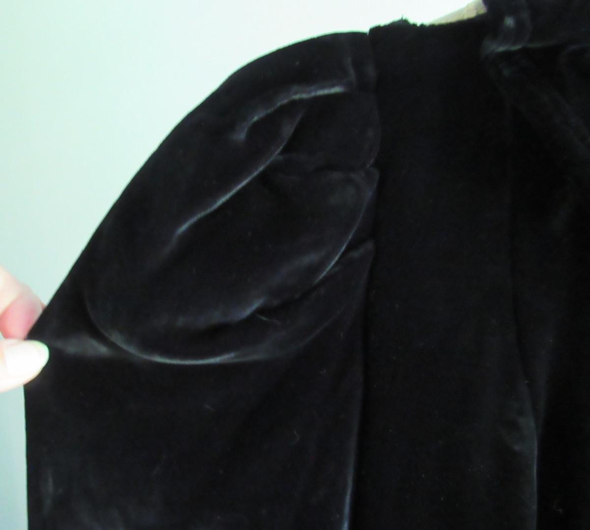 Was so hard to photograph. It is dark black and very soft velvet type material. Label from J L Hudson Co, Detroit. This coat does need repair and someone started but did not finish. There is a shoulder seam separation that can be very easily stitched, someone already opened the lining but never finished the fix. Lower down on the lining there is a small seam fix needed. Both arm pit lining needs seam repair. There is a spot near the bottom that is either dirt or wear, not sure, see pics. Puffy padded shoulders, button closure at neck. One more button and loop closure lower down front. Size unknown. Measures about 14-15" across shoulders, about 57" long. Shipping is available at actual shipping cost plus $5.00 handling fee per box for supplies/labor. See our terms for details. All sales are final. Condition notes may not be all inclusive, we may miss some issues as most vintage items are not in mint condition and have some degree of wear, paint loss, etc, but we always try to note obvious damage.