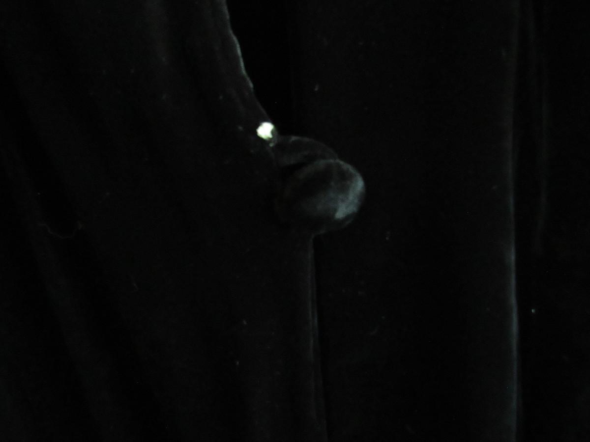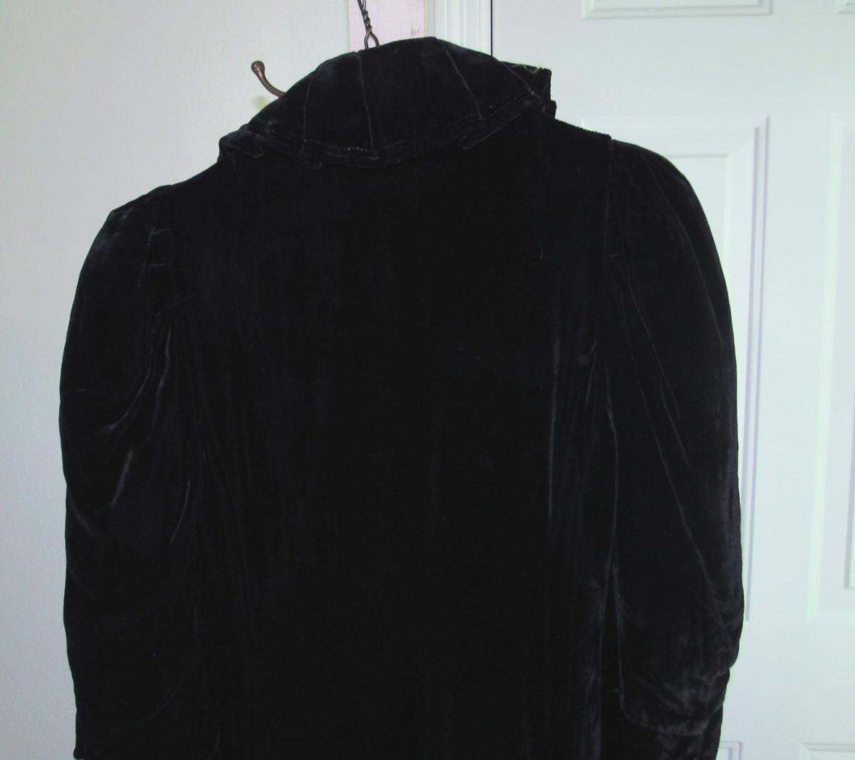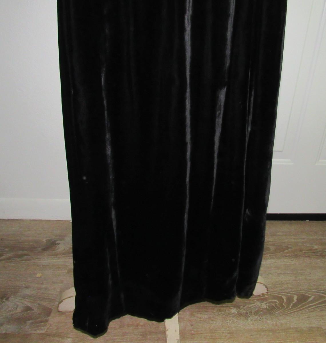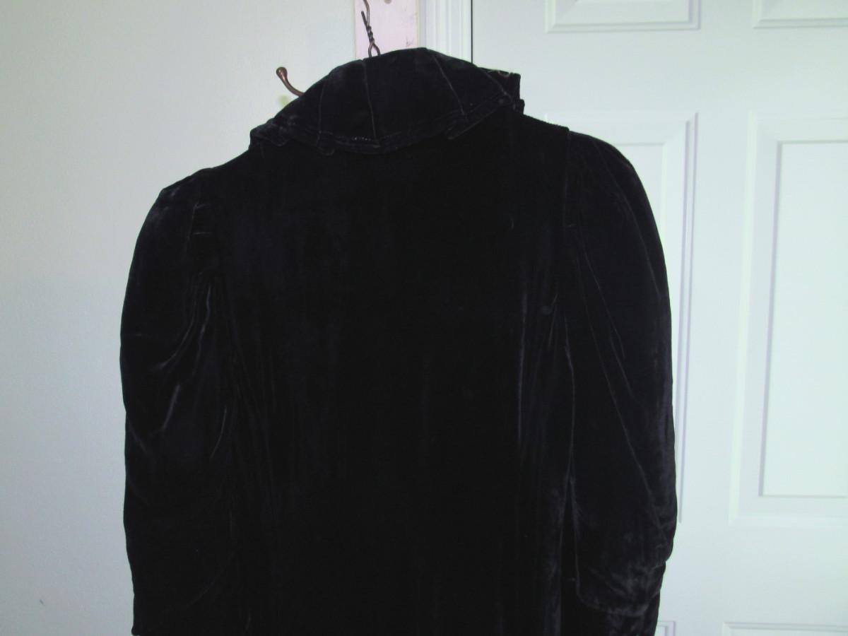 Was so hard to photograph. It is dark black and very soft velvet type material. Label from J L Hudson Co, Detroit. This coat does need repair and someone started but did not finish. There is a shoulder seam separation that can be very easily stitched, someone already opened the lining but never finished the fix. Lower down on the lining there is a small seam fix needed. Both arm pit lining needs seam repair. There is a spot near the bottom that is either dirt or wear, not sure, see pics. Puffy padded shoulders, button closure at neck. One more button and loop closure lower down front. Size unknown. Measures about 14-15" across shoulders, about 57" long. Shipping is available at actual shipping cost plus $5.00 handling fee per box for supplies/labor. See our terms for details. All sales are final. Condition notes may not be all inclusive, we may miss some issues as most vintage items are not in mint condition and have some degree of wear, paint loss, etc, but we always try to note obvious damage.