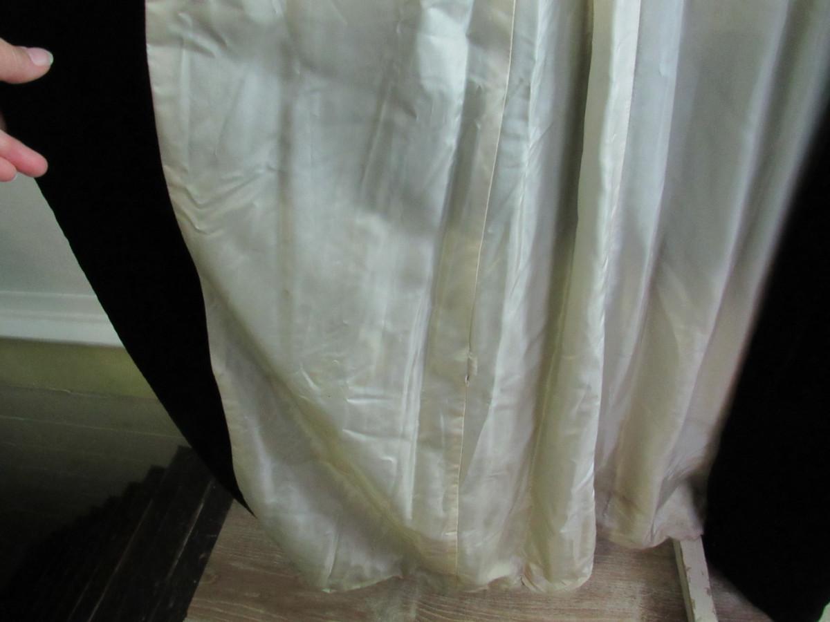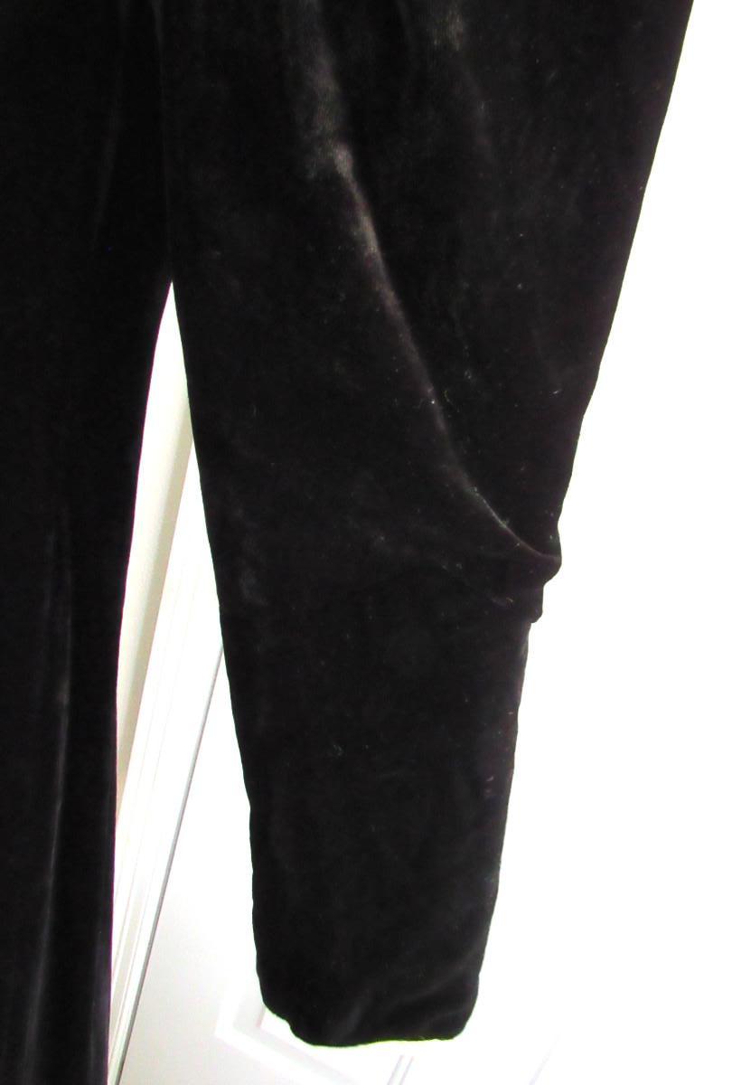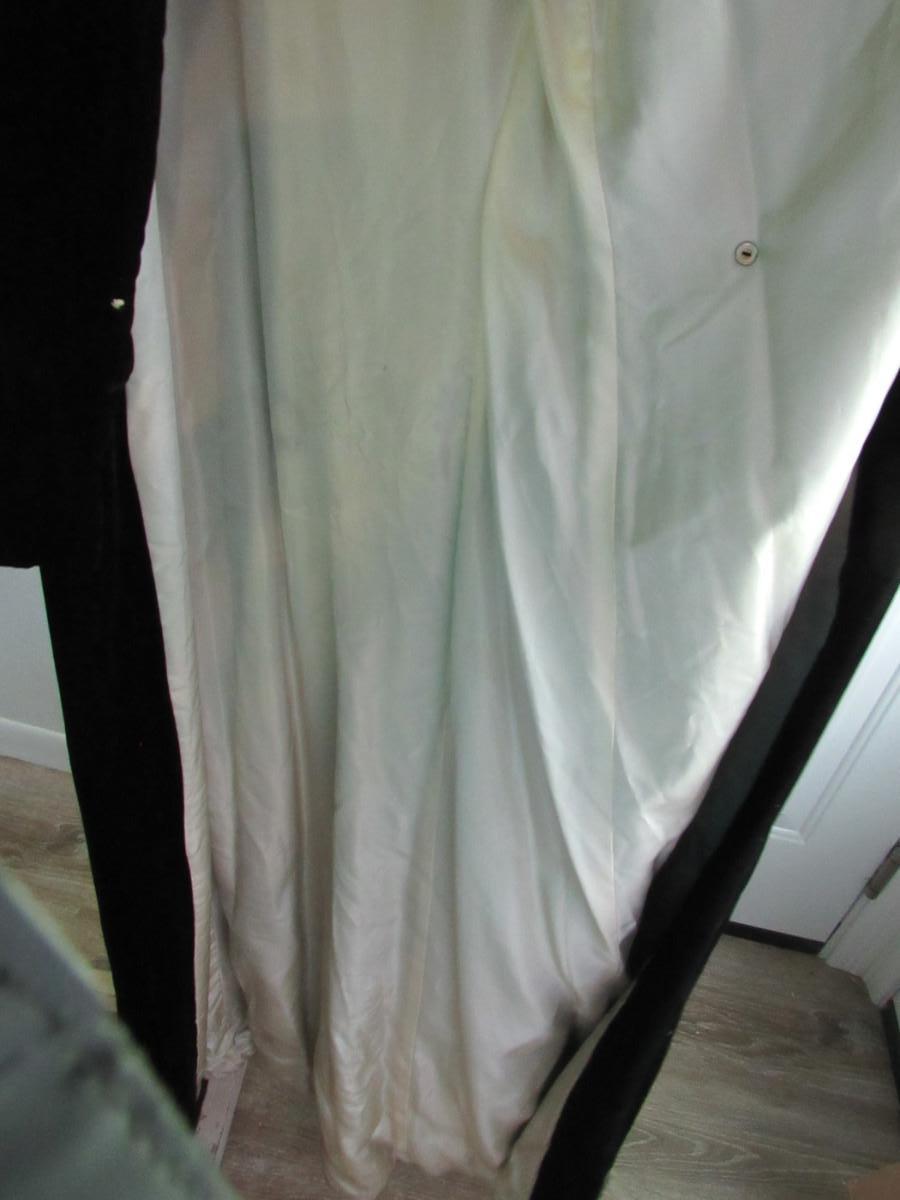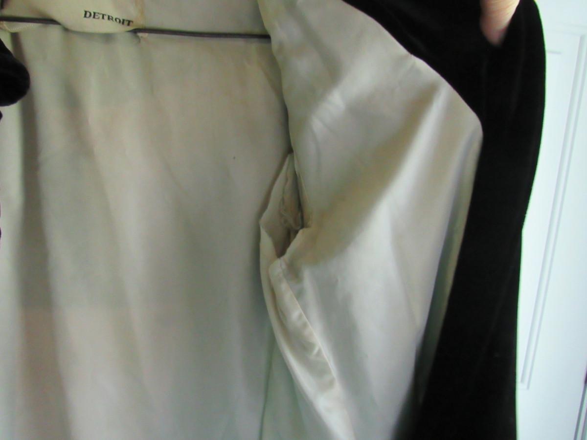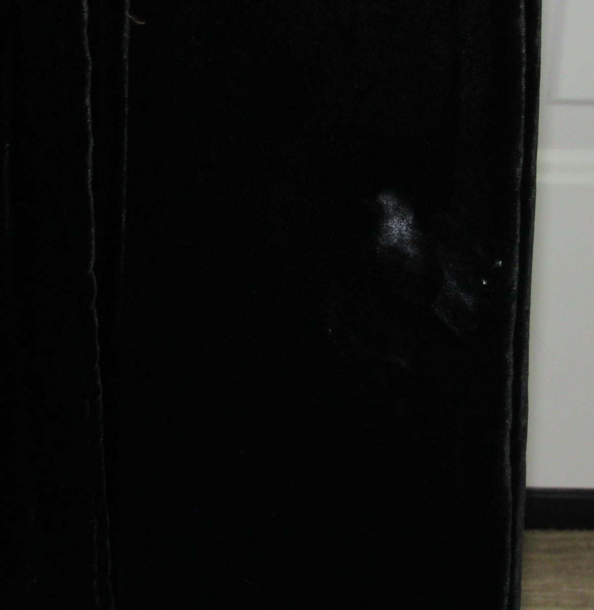 Was so hard to photograph. It is dark black and very soft velvet type material. Label from J L Hudson Co, Detroit. This coat does need repair and someone started but did not finish. There is a shoulder seam separation that can be very easily stitched, someone already opened the lining but never finished the fix. Lower down on the lining there is a small seam fix needed. Both arm pit lining needs seam repair. There is a spot near the bottom that is either dirt or wear, not sure, see pics. Puffy padded shoulders, button closure at neck. One more button and loop closure lower down front. Size unknown. Measures about 14-15" across shoulders, about 57" long. Shipping is available at actual shipping cost plus $5.00 handling fee per box for supplies/labor. See our terms for details. All sales are final. Condition notes may not be all inclusive, we may miss some issues as most vintage items are not in mint condition and have some degree of wear, paint loss, etc, but we always try to note obvious damage.