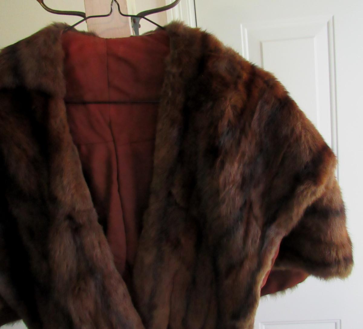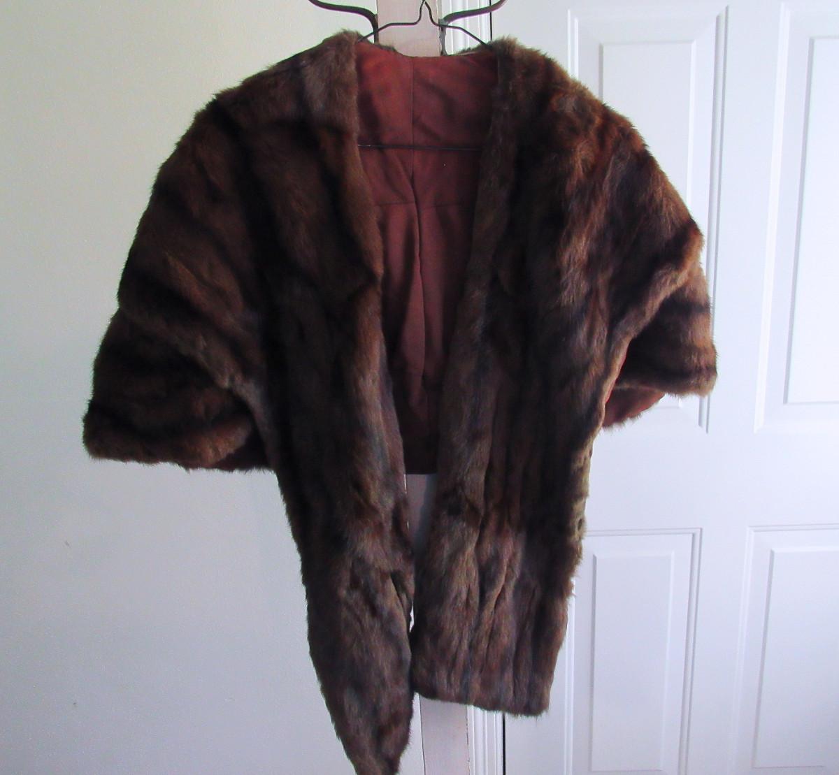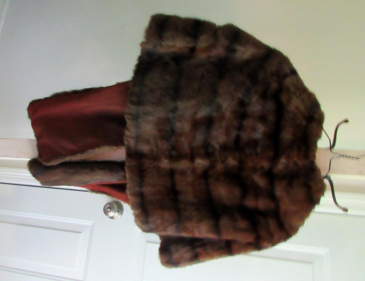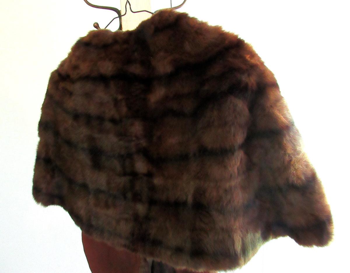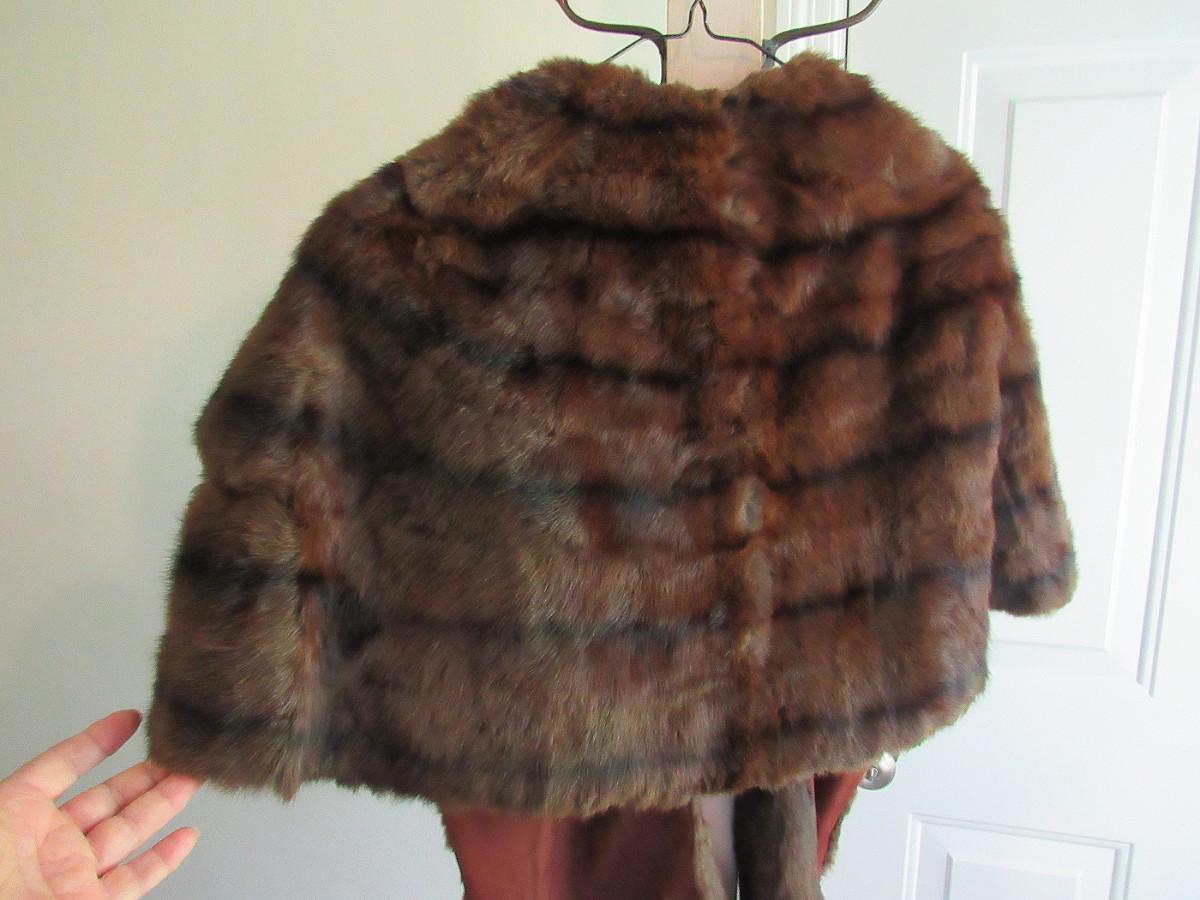 Very nice. The cape drapes over the shoulder and has two long front flaps. I don't know what kind of fur this is, but it is a nice rich dark brown with black mix, somewhat shorter haired. There are no labels, size is unknown, maker unknown. It measures about 16" from shoulder to shoulder, the back is about 17" long. The front is about 32" long to the bottom of the flaps. It appears to be is super shape. The lining looks very nice, no tears. One very tiny spot where a seam needs mending, about 1/4" or less. Shipping is available at actual shipping cost plus $5.00 handling fee per box for supplies/labor. See our terms for details. All sales are final. Condition notes may not be all inclusive, we may miss some issues as most vintage items are not in mint condition and have some degree of wear, paint loss, etc, but we always try to note obvious damage.