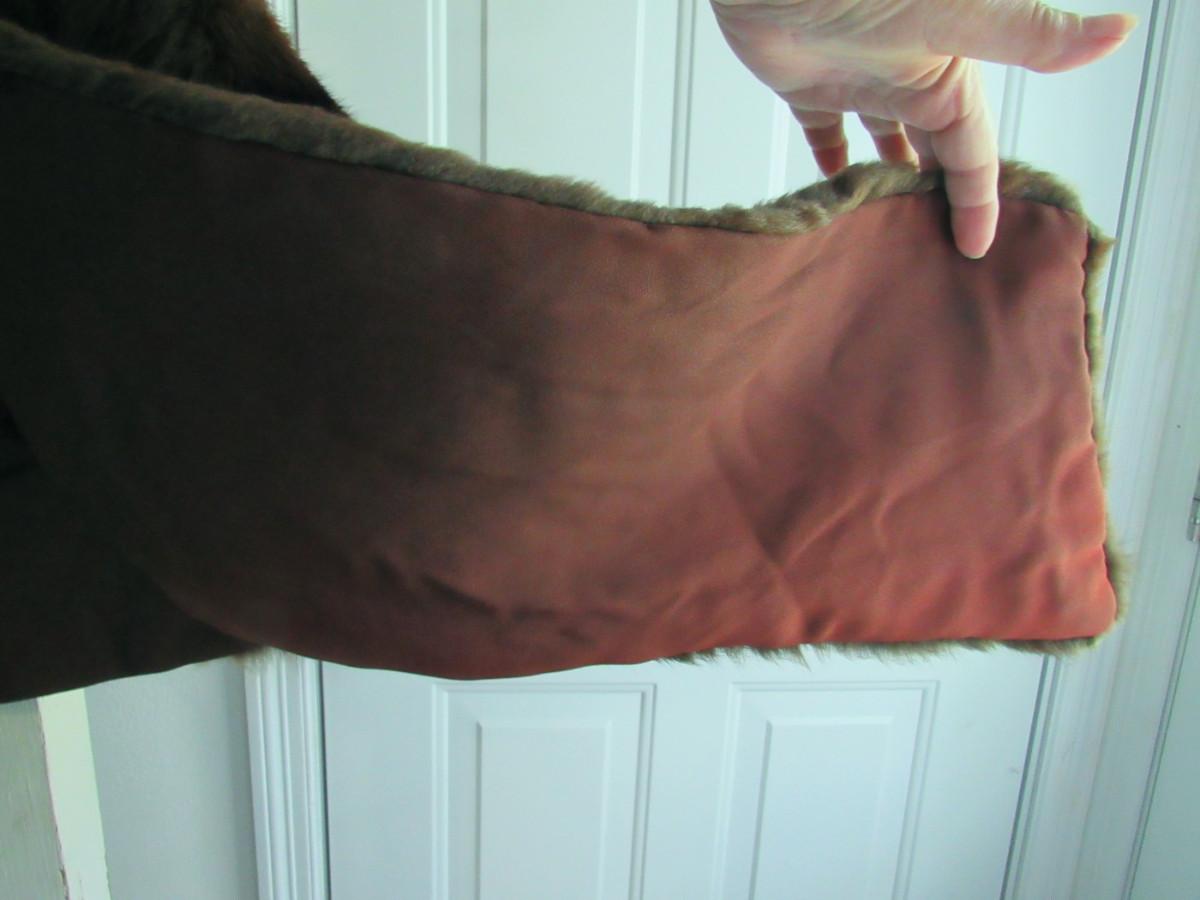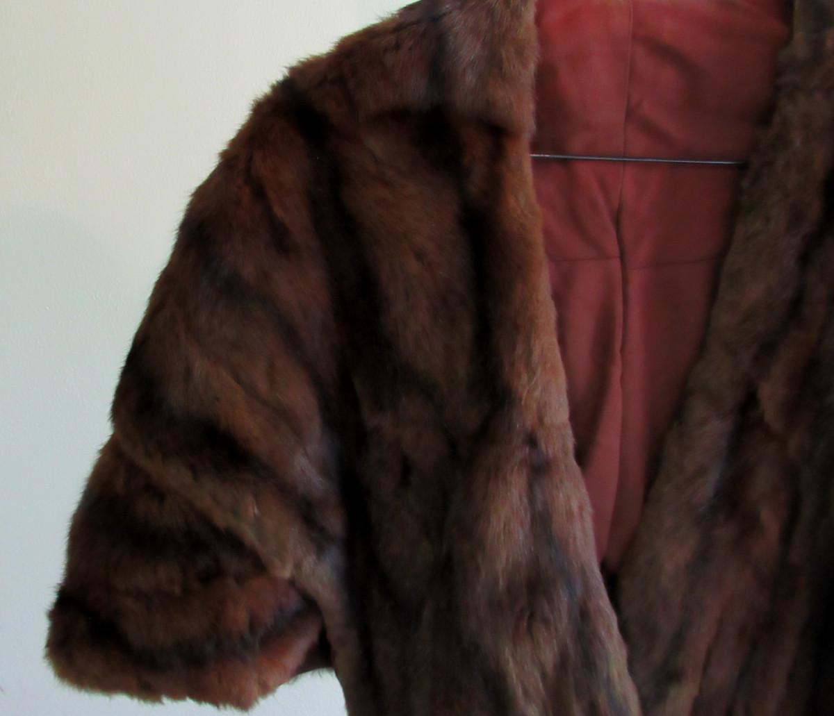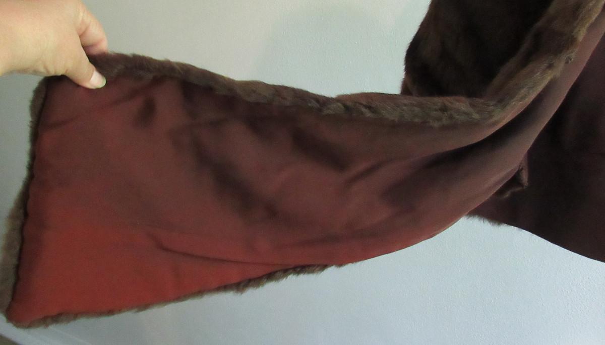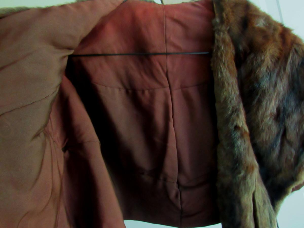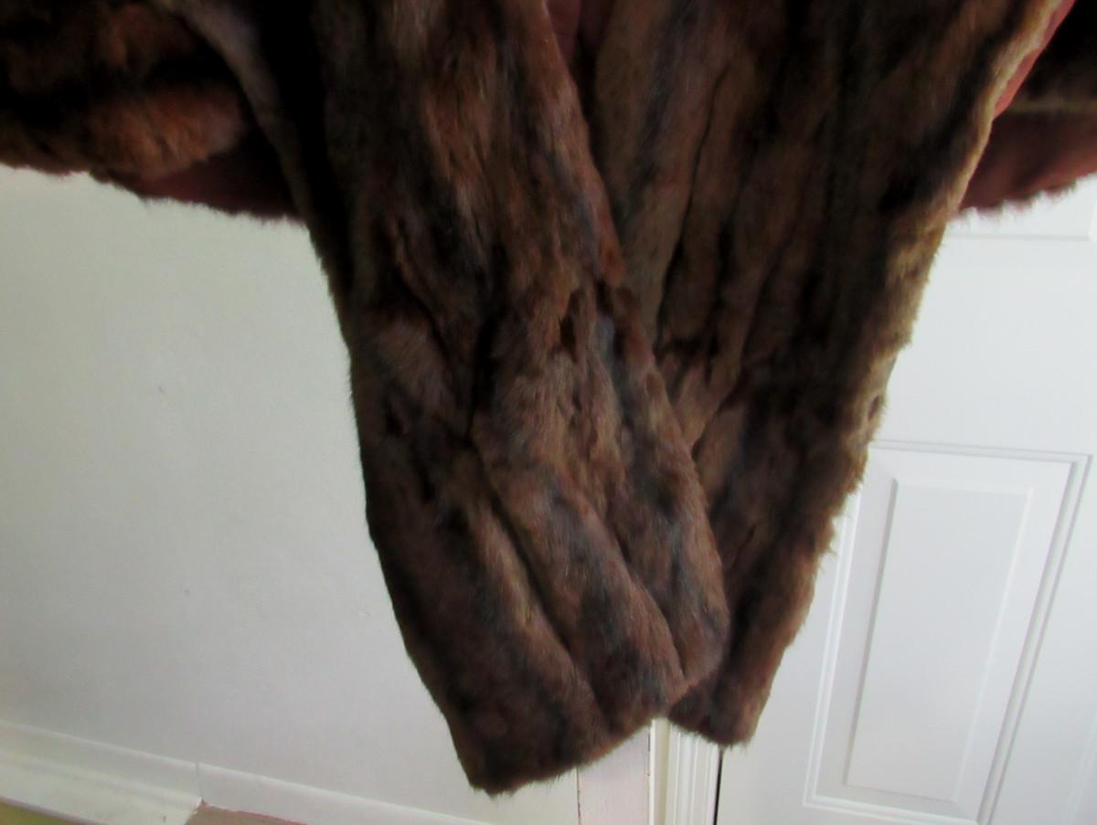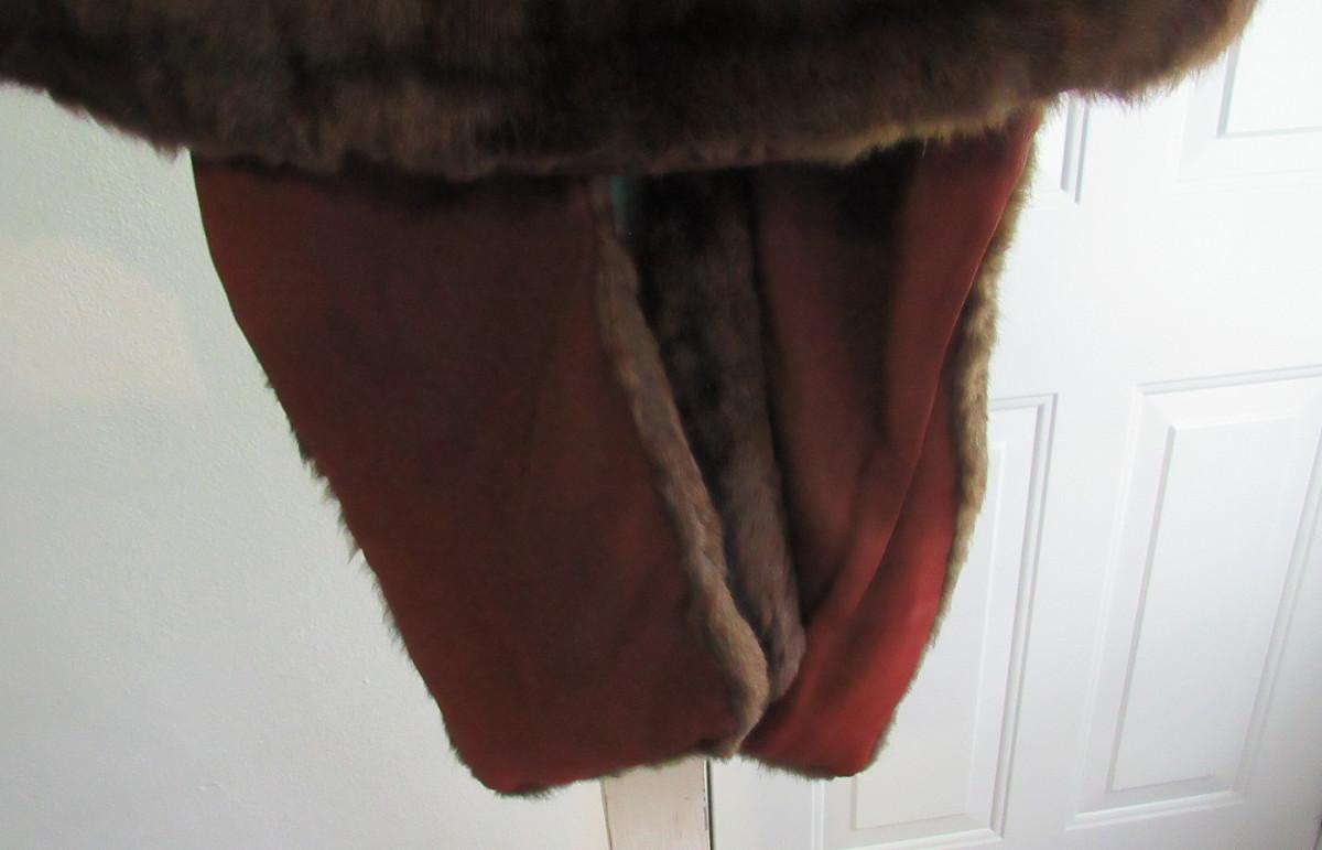Very nice. The cape drapes over the shoulder and has two long front flaps. I don't know what kind of fur this is, but it is a nice rich dark brown with black mix, somewhat shorter haired. There are no labels, size is unknown, maker unknown. It measures about 16" from shoulder to shoulder, the back is about 17" long. The front is about 32" long to the bottom of the flaps. It appears to be is super shape. The lining looks very nice, no tears. One very tiny spot where a seam needs mending, about 1/4" or less. Shipping is available at actual shipping cost plus $5.00 handling fee per box for supplies/labor. See our terms for details. All sales are final. Condition notes may not be all inclusive, we may miss some issues as most vintage items are not in mint condition and have some degree of wear, paint loss, etc, but we always try to note obvious damage.