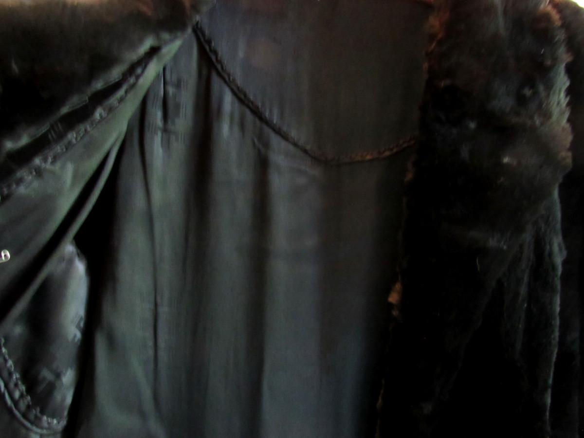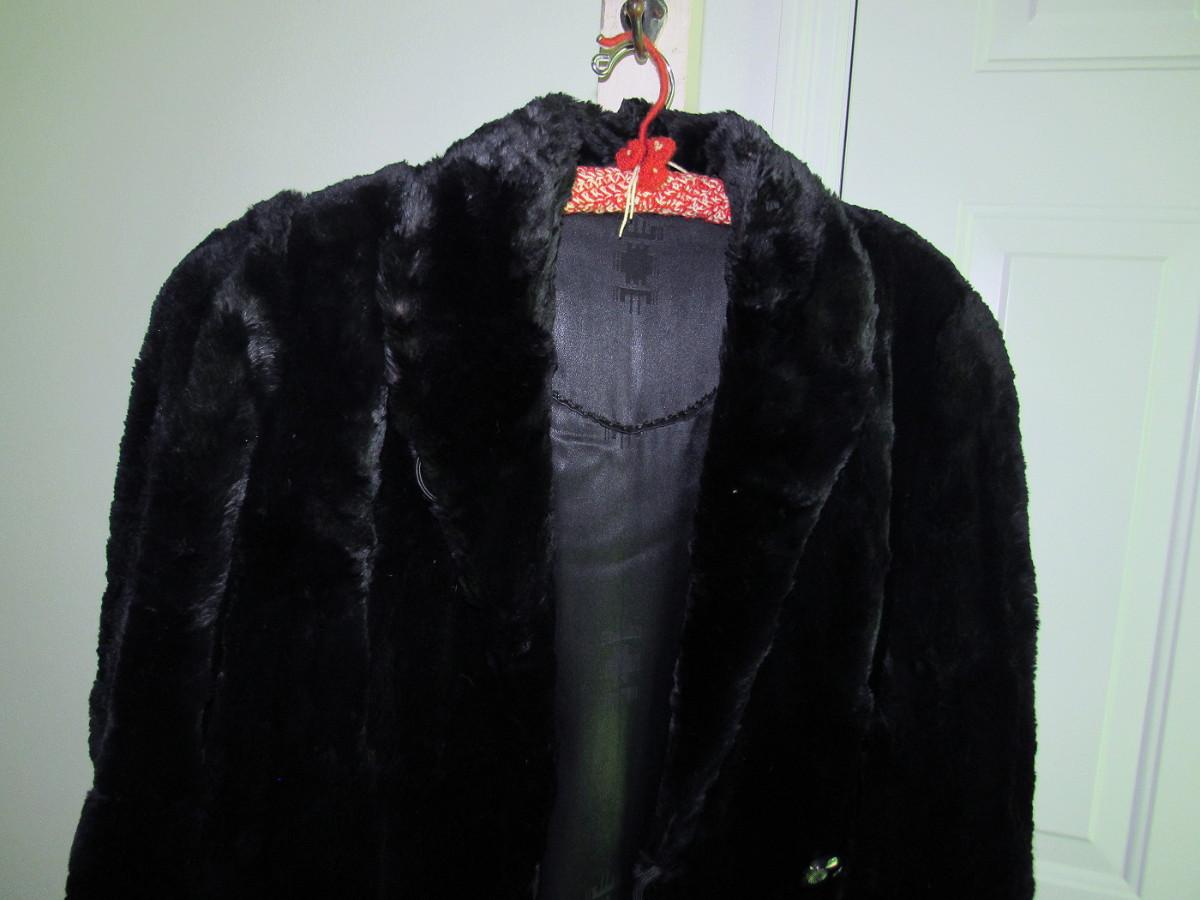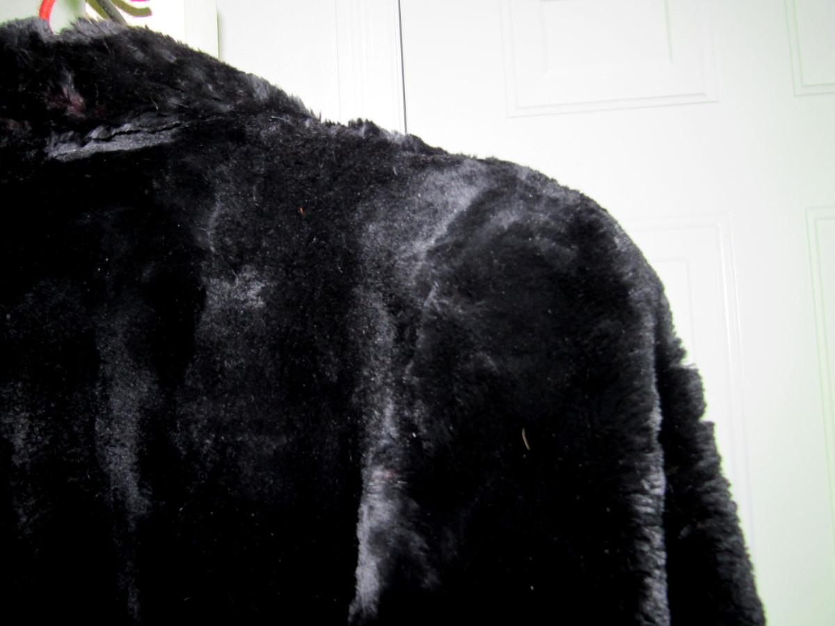 Very hard to photograph. I am not certain this is real fur, I am no expert in furs. It looks and feels like rabbit fur to me, but is all black, short maybe about 1/2" long and very soft. Very pretty dark black coat. Button and loop closure at neck with 2 large loop and buttons. The loops have been repaired. Padded shoulders. There is a small spot on one wrist where the fur is shorter, not really matted down, but maybe like shorter hairs on the end of a pelt maybe? The sleeve linings have an extra lining inside, have no idea why, again, I am not an expert. No labels. Don't know maker or size. Measures about 16 - 17" at shoulders and about 43" long. There is a pic where there is a safely pin, this spot needs mending, easy fix. I don't see any other issues at all. It is so pretty and soft and warm and heavy in person. Shipping is available at actual shipping cost plus $5.00 handling fee per box for supplies/labor. See our terms for details. All sales are final. Condition notes may not be all inclusive, we may miss some issues as most vintage items are not in mint condition and have some degree of wear, paint loss, etc, but we always try to note obvious damage.