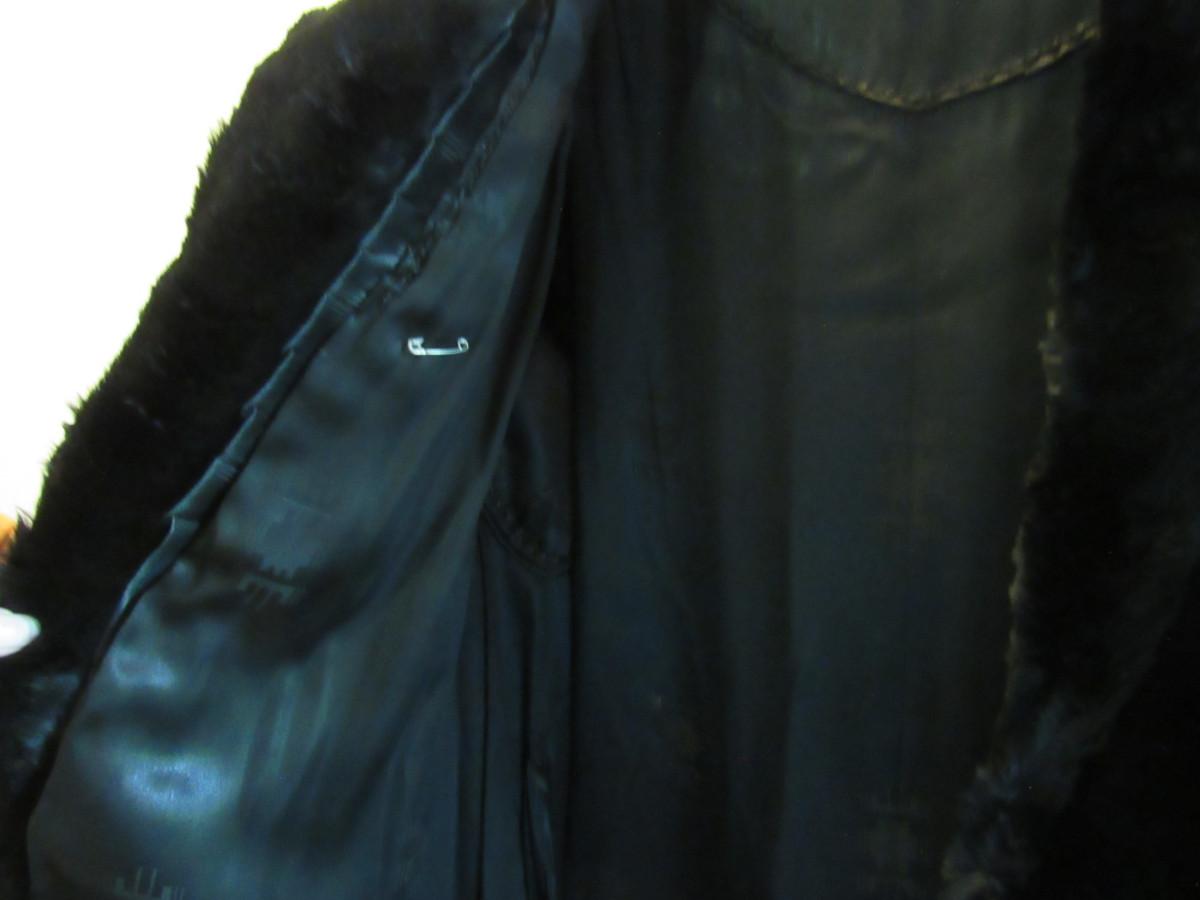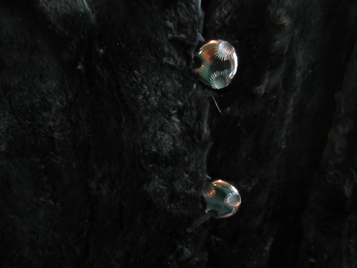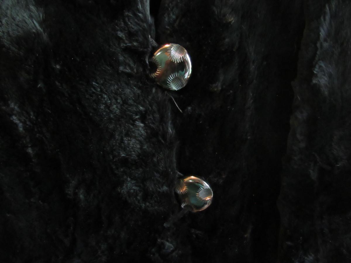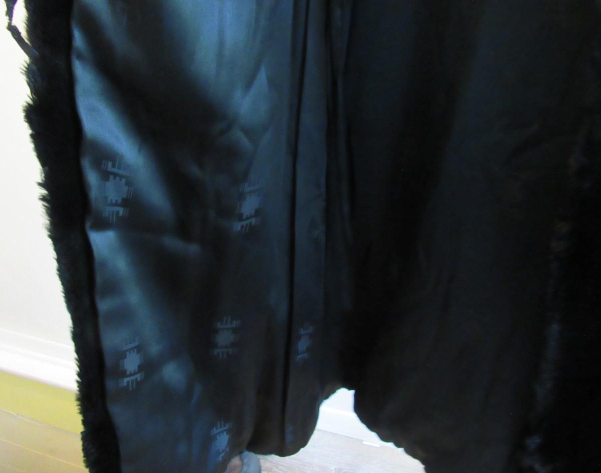 Very hard to photograph. I am not certain this is real fur, I am no expert in furs. It looks and feels like rabbit fur to me, but is all black, short maybe about 1/2" long and very soft. Very pretty dark black coat. Button and loop closure at neck with 2 large loop and buttons. The loops have been repaired. Padded shoulders. There is a small spot on one wrist where the fur is shorter, not really matted down, but maybe like shorter hairs on the end of a pelt maybe? The sleeve linings have an extra lining inside, have no idea why, again, I am not an expert. No labels. Don't know maker or size. Measures about 16 - 17" at shoulders and about 43" long. There is a pic where there is a safely pin, this spot needs mending, easy fix. I don't see any other issues at all. It is so pretty and soft and warm and heavy in person. Shipping is available at actual shipping cost plus $5.00 handling fee per box for supplies/labor. See our terms for details. All sales are final. Condition notes may not be all inclusive, we may miss some issues as most vintage items are not in mint condition and have some degree of wear, paint loss, etc, but we always try to note obvious damage.