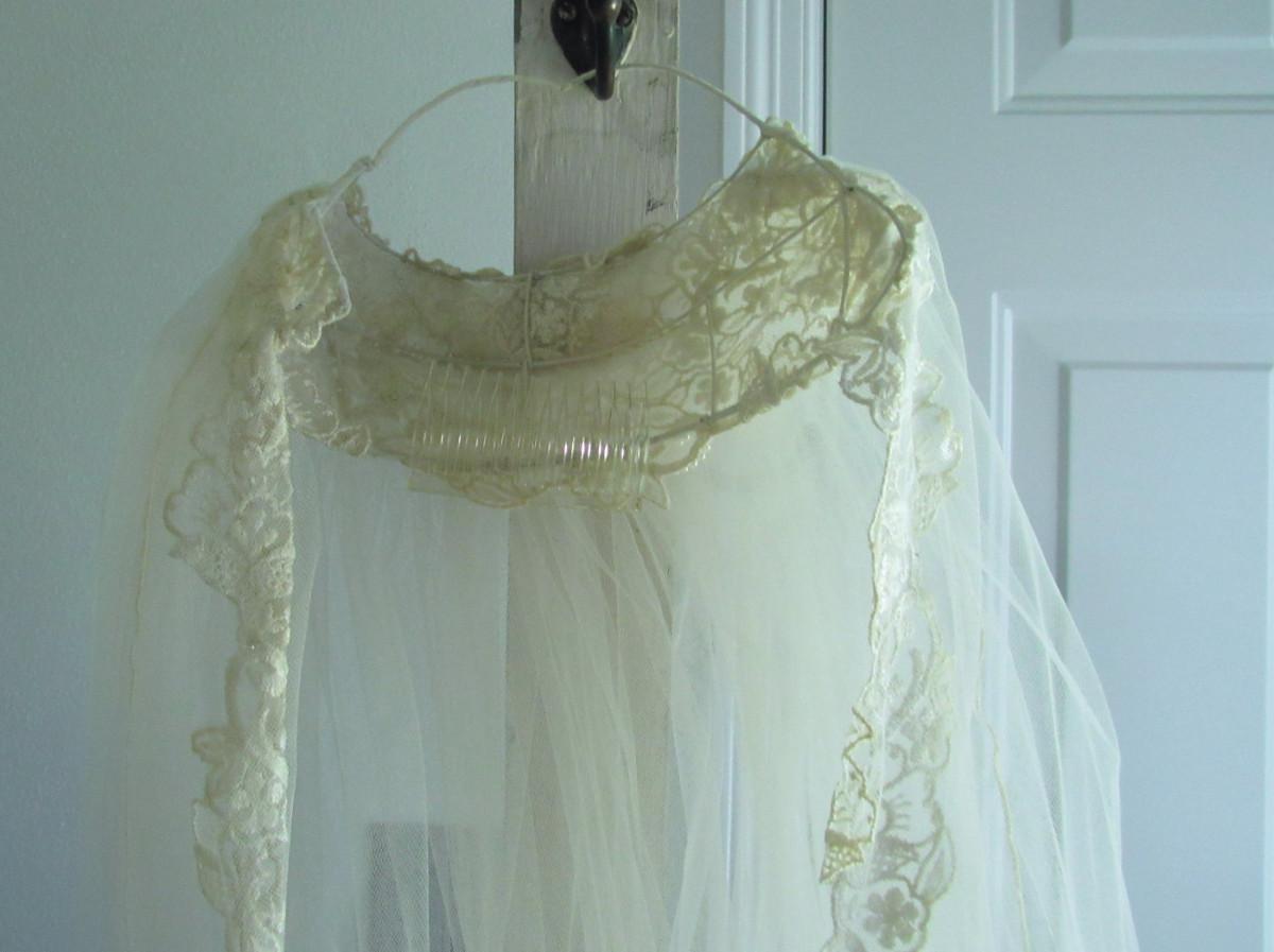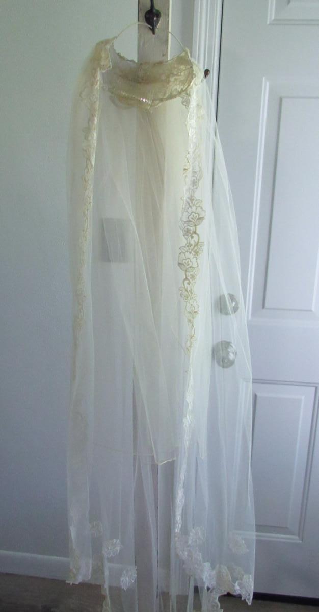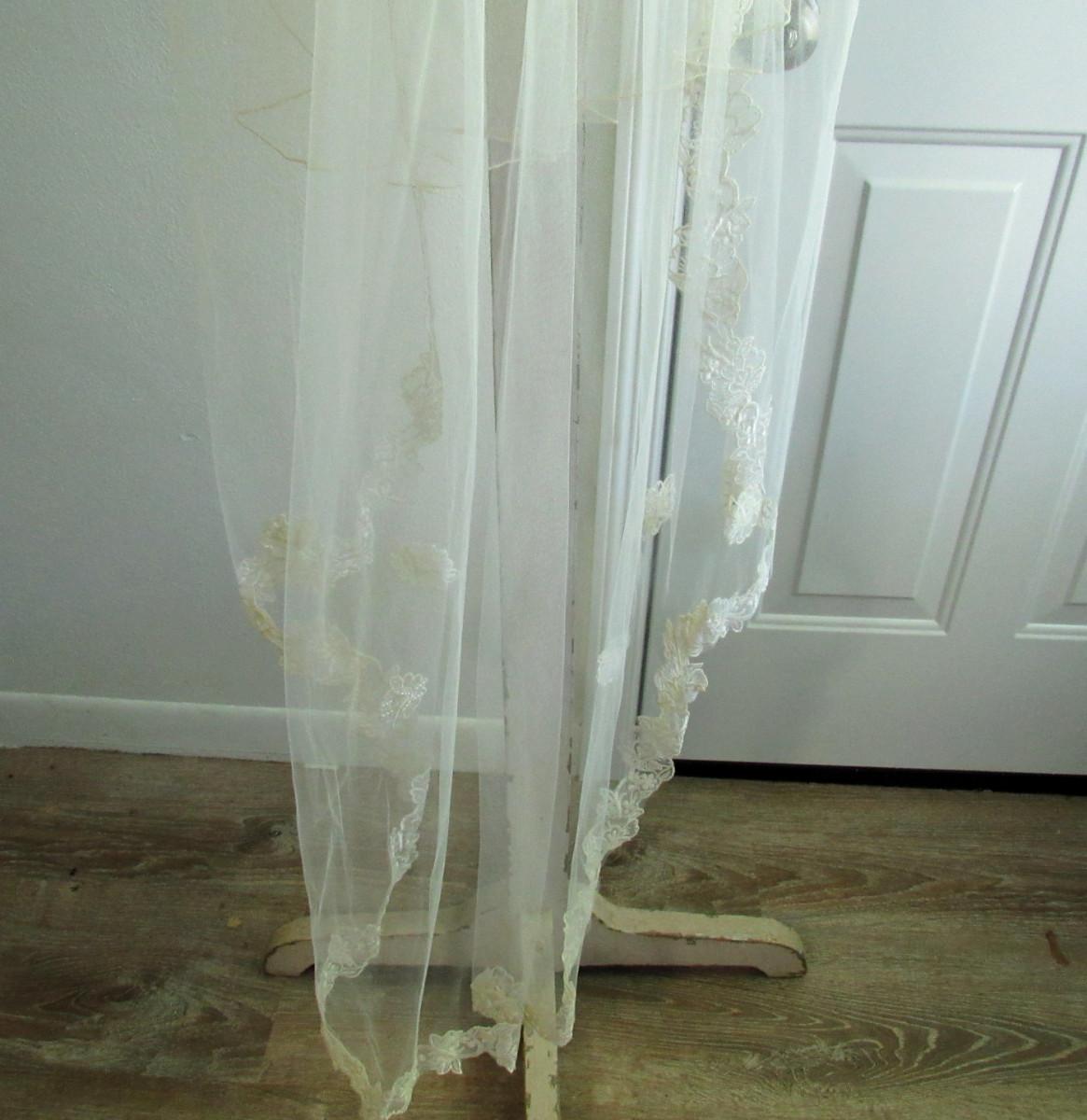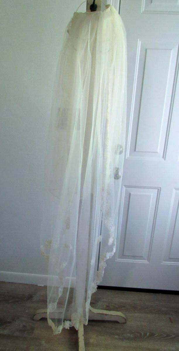 Long simple lace edge veil, 1970s. Very pretty, sheer, hair comb. Almost ankle length. No labels. Appears to be in very good shape. Shipping is available at actual shipping cost plus $5.00 handling fee per box for supplies/labor. See our terms for details. All sales are final. Condition notes may not be all inclusive, we may miss some issues as most vintage items are not in mint condition and have some degree of wear, paint loss, etc, but we always try to note obvious damage.