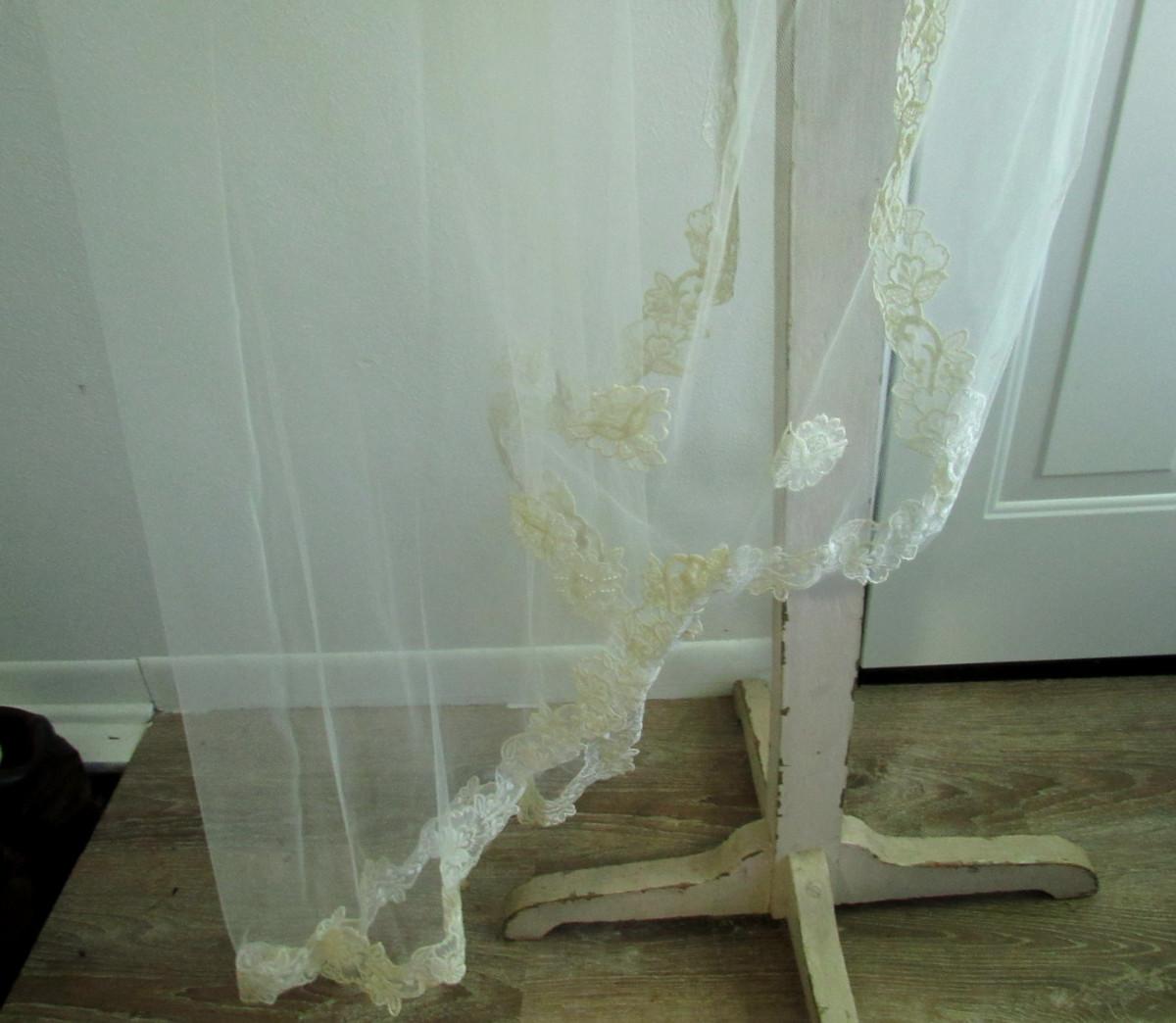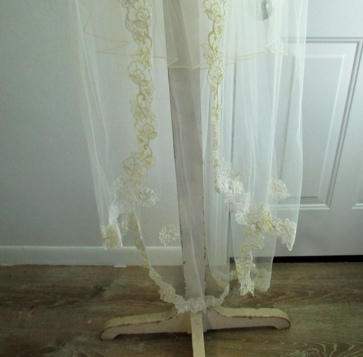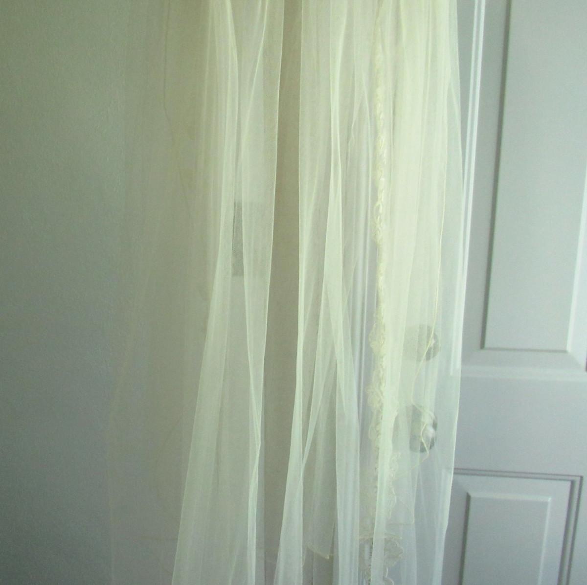 Long simple lace edge veil, 1970s. Very pretty, sheer, hair comb. Almost ankle length. No labels. Appears to be in very good shape. Shipping is available at actual shipping cost plus $5.00 handling fee per box for supplies/labor. See our terms for details. All sales are final. Condition notes may not be all inclusive, we may miss some issues as most vintage items are not in mint condition and have some degree of wear, paint loss, etc, but we always try to note obvious damage.